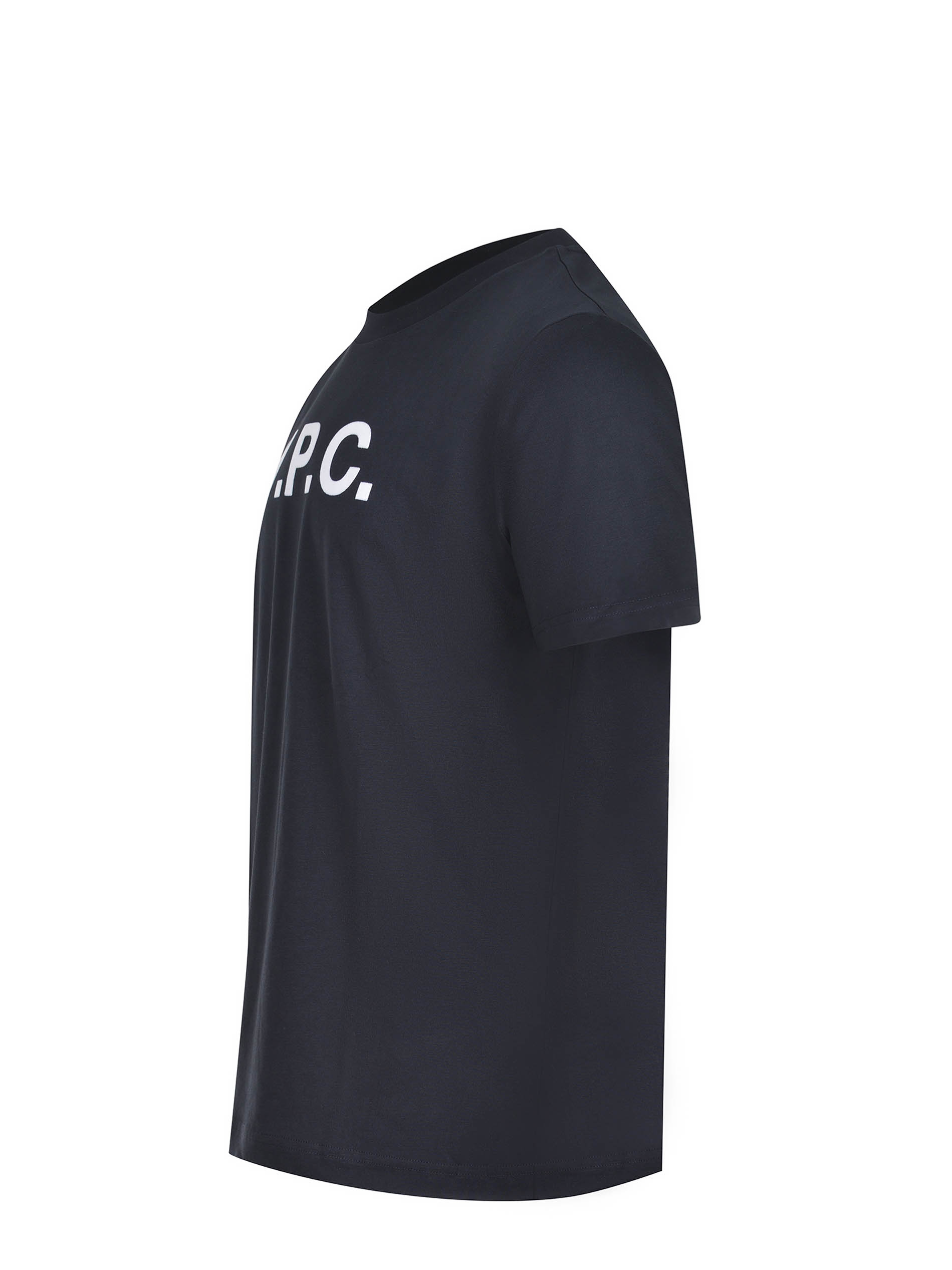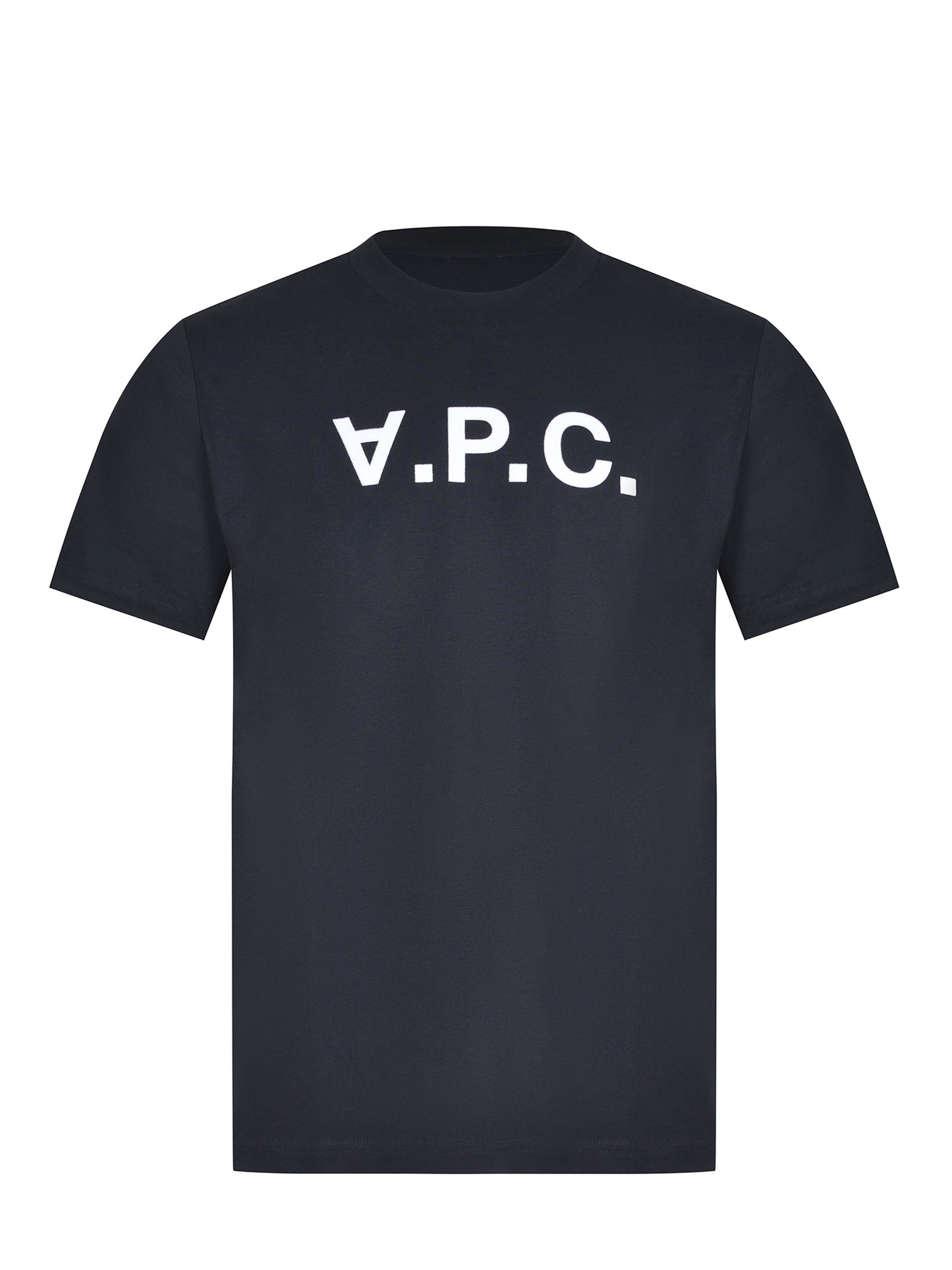 A.P.C. T-shirt made of night blue cotton. Ribbed crew neck. Short sleeves. Front logo lettering in contrasting velvet effect. 100% cotton