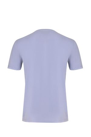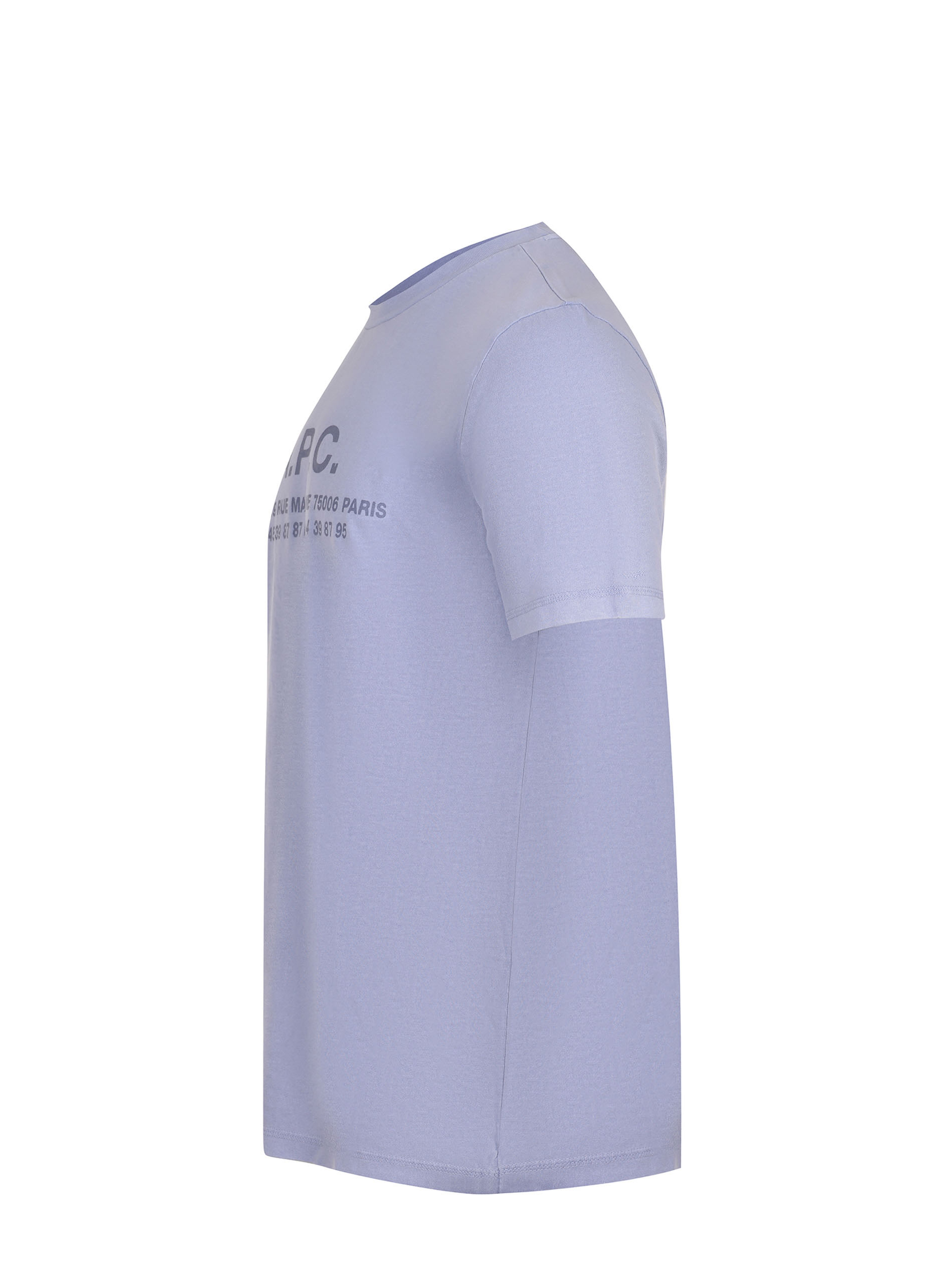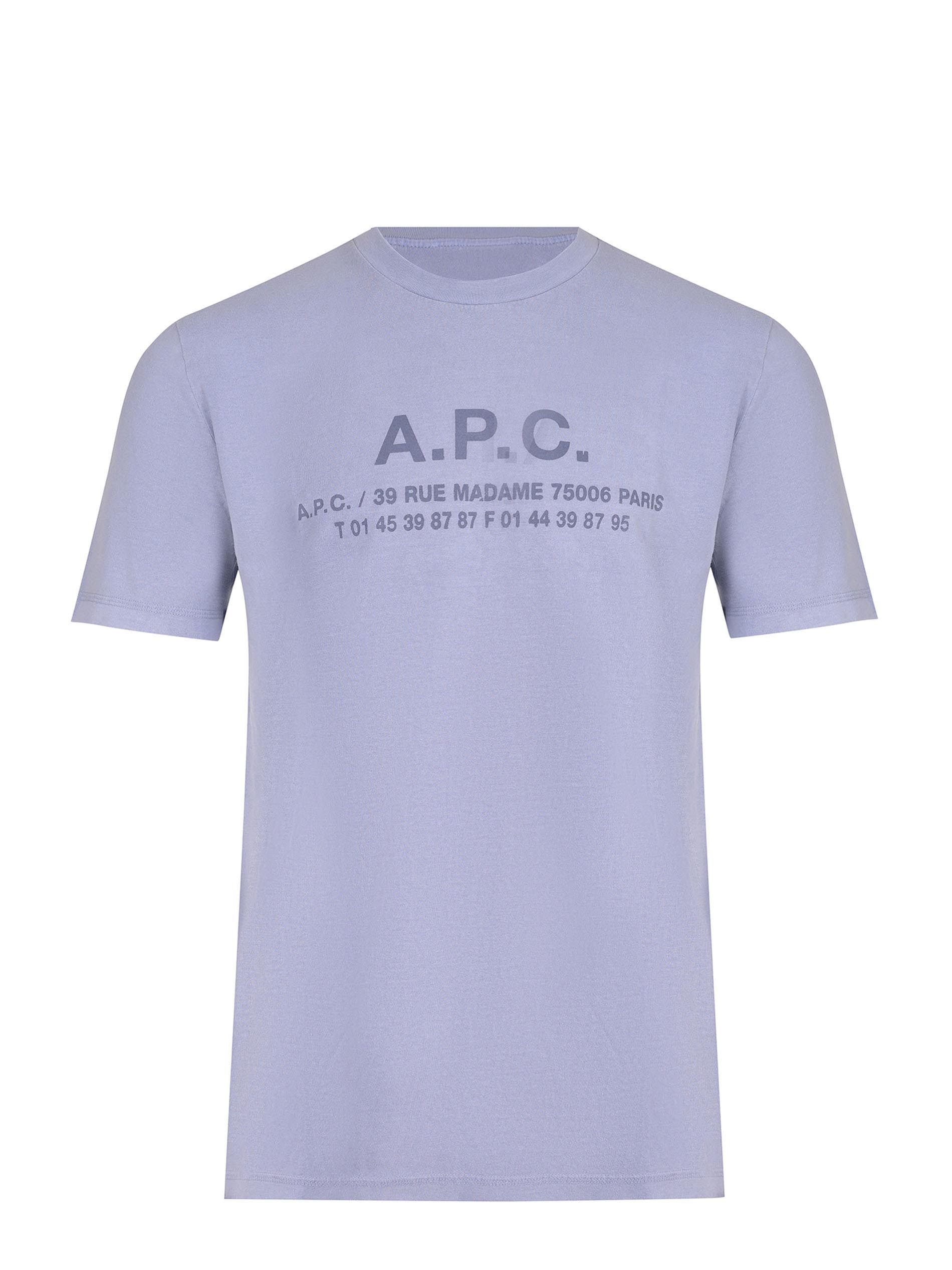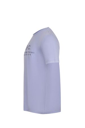 A.P.C. T-shirt made of light blue cotton. Ribbed crew neck. Short sleeves. Logo lettering and contrasting text on the back. 100% cotton