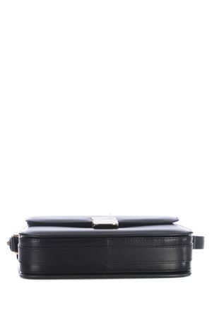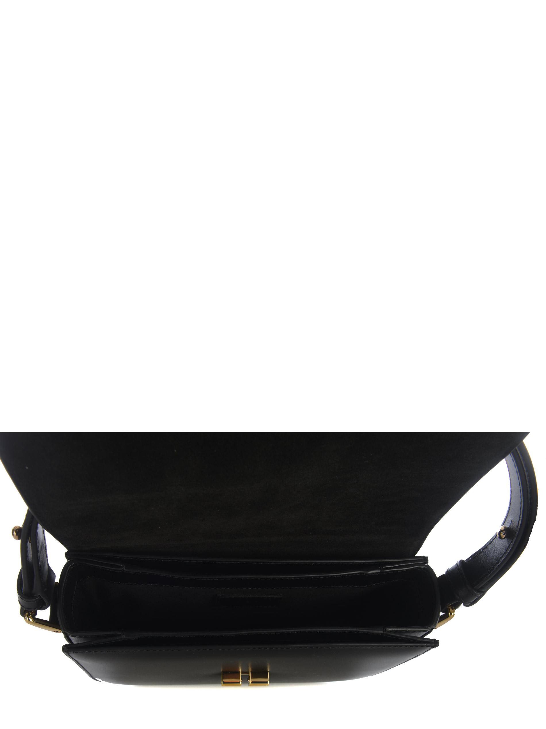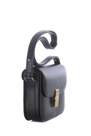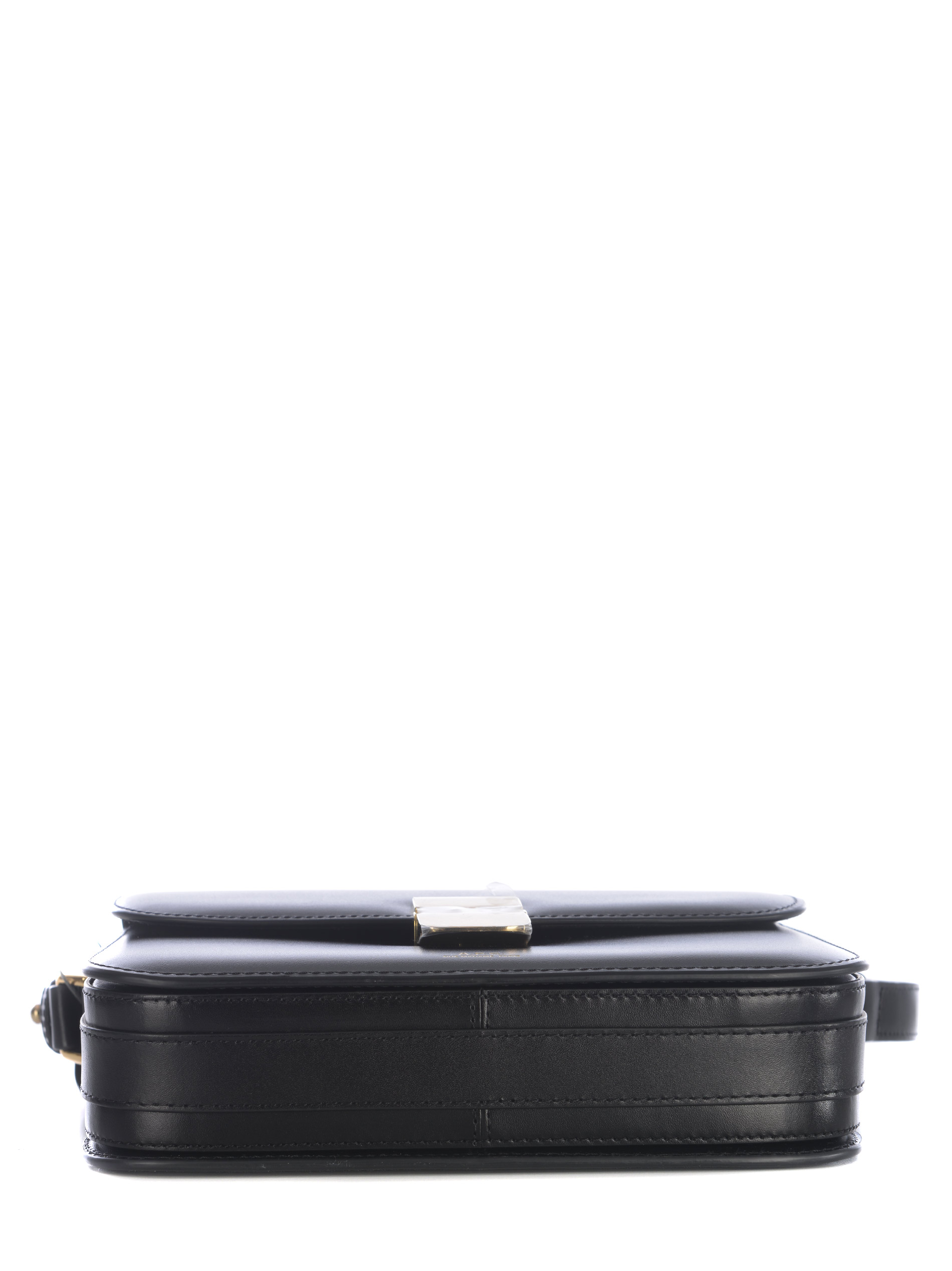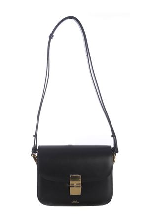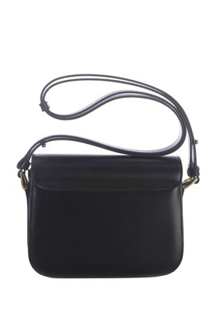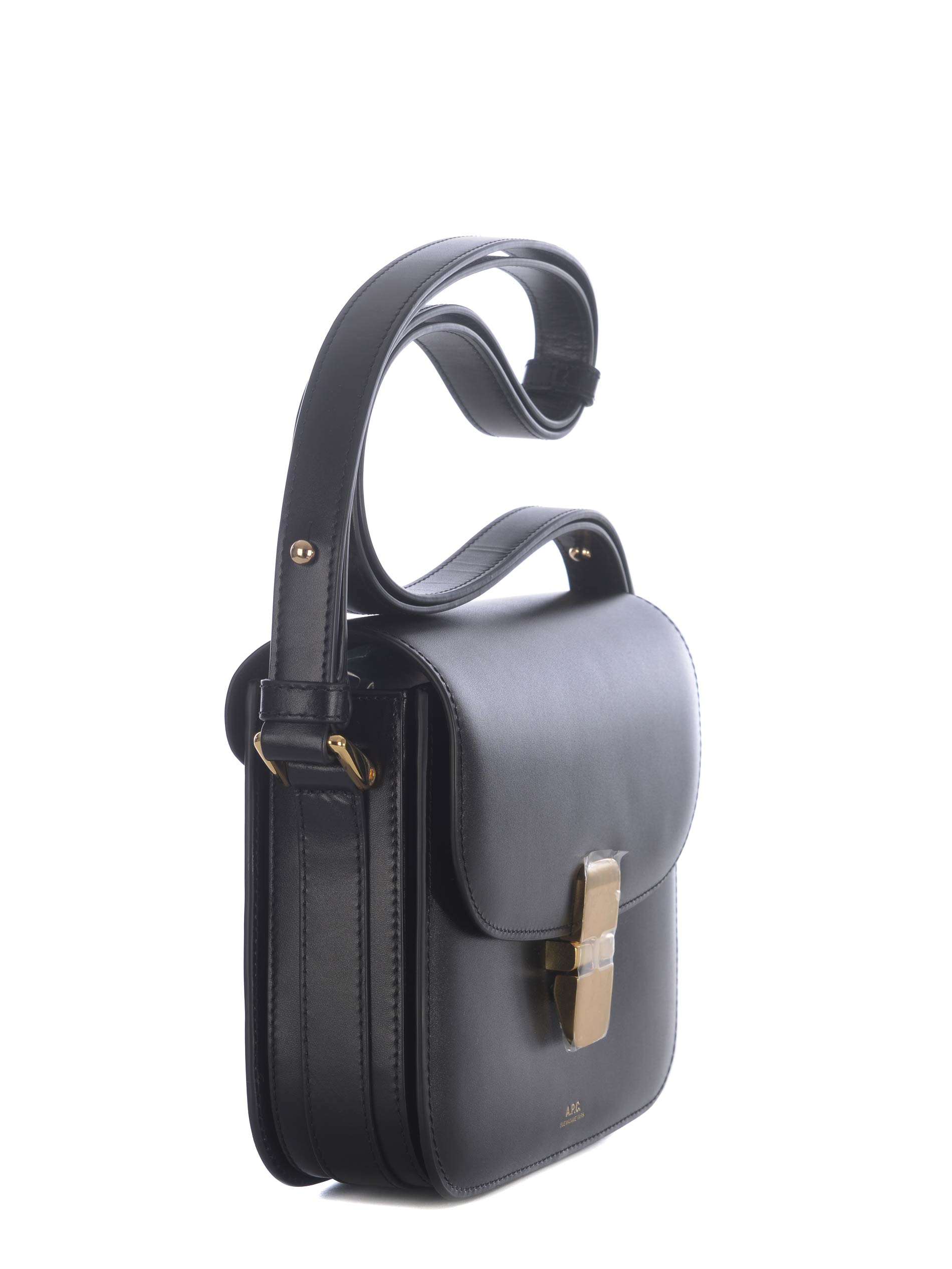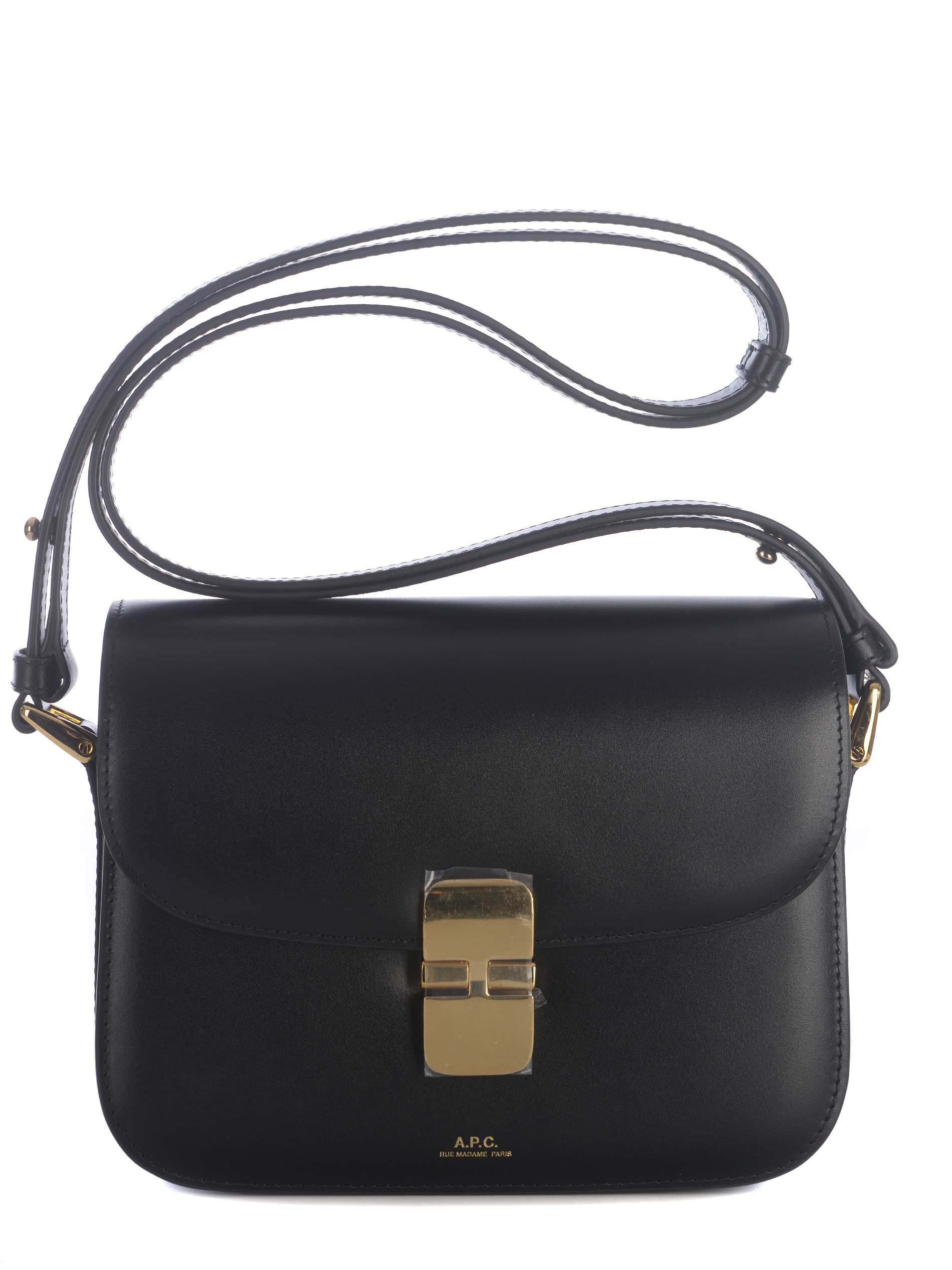 Bag A.P.C. in smooth Black leather. Gold embossed "APC Rue Madame Paris" logo. Flap with Gold-colored hardware closure. Single compartment. Logo patch applied inside. Two golden rings on the sides. Adjustable shoulder strap.