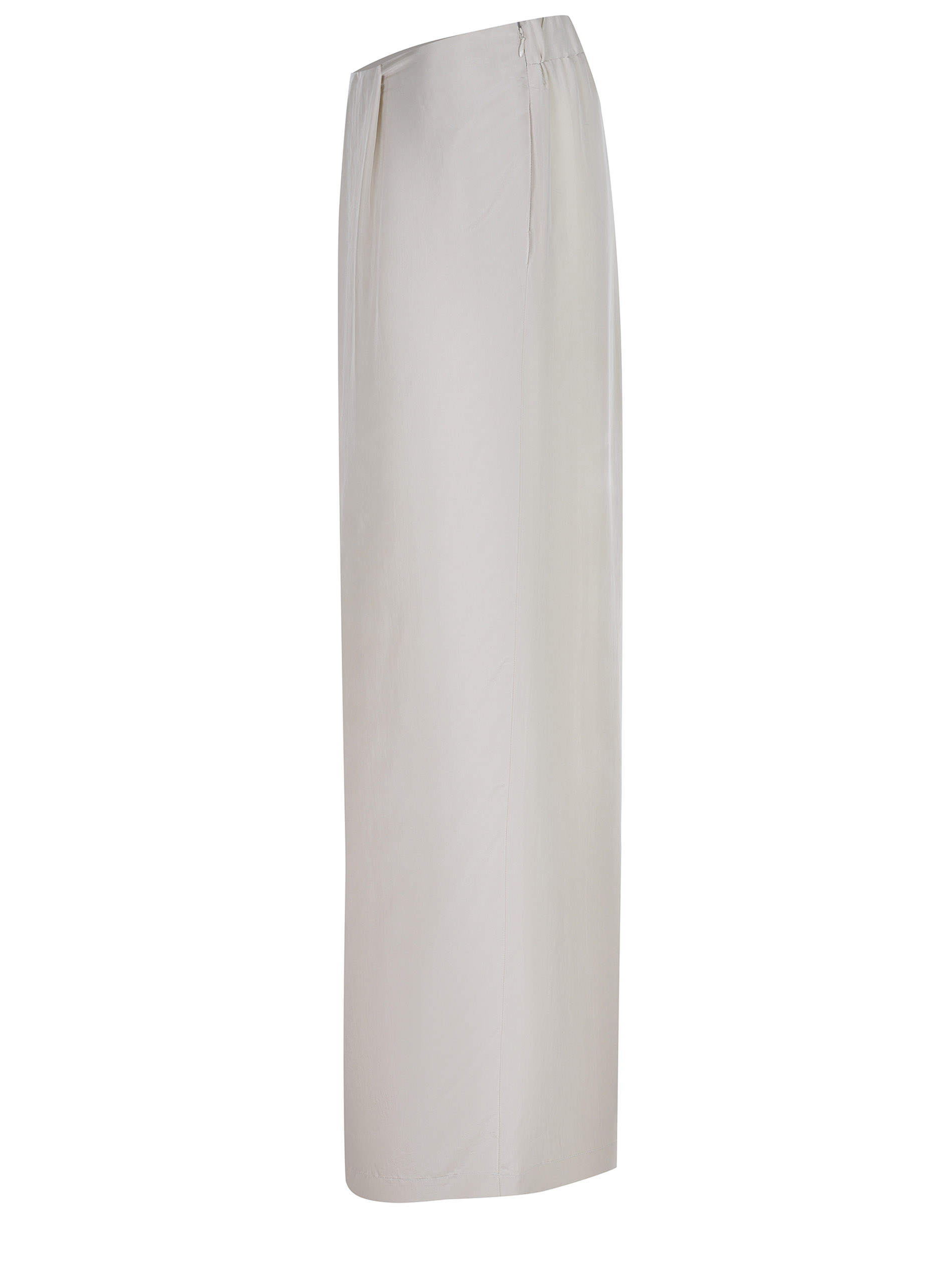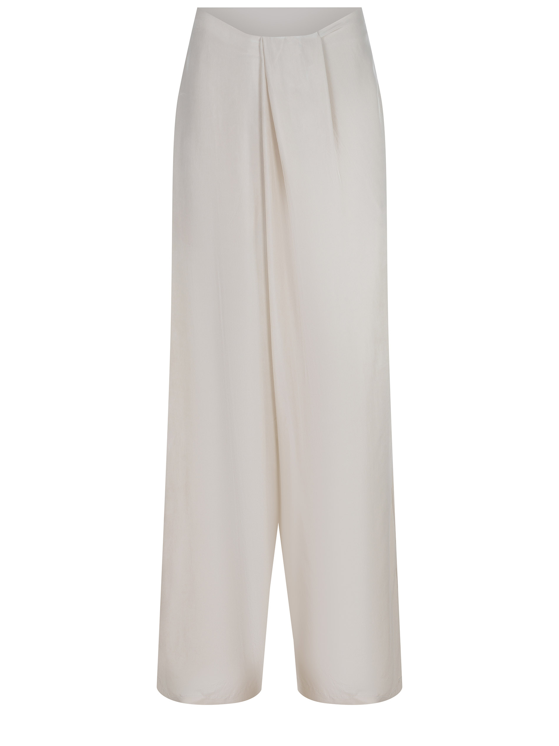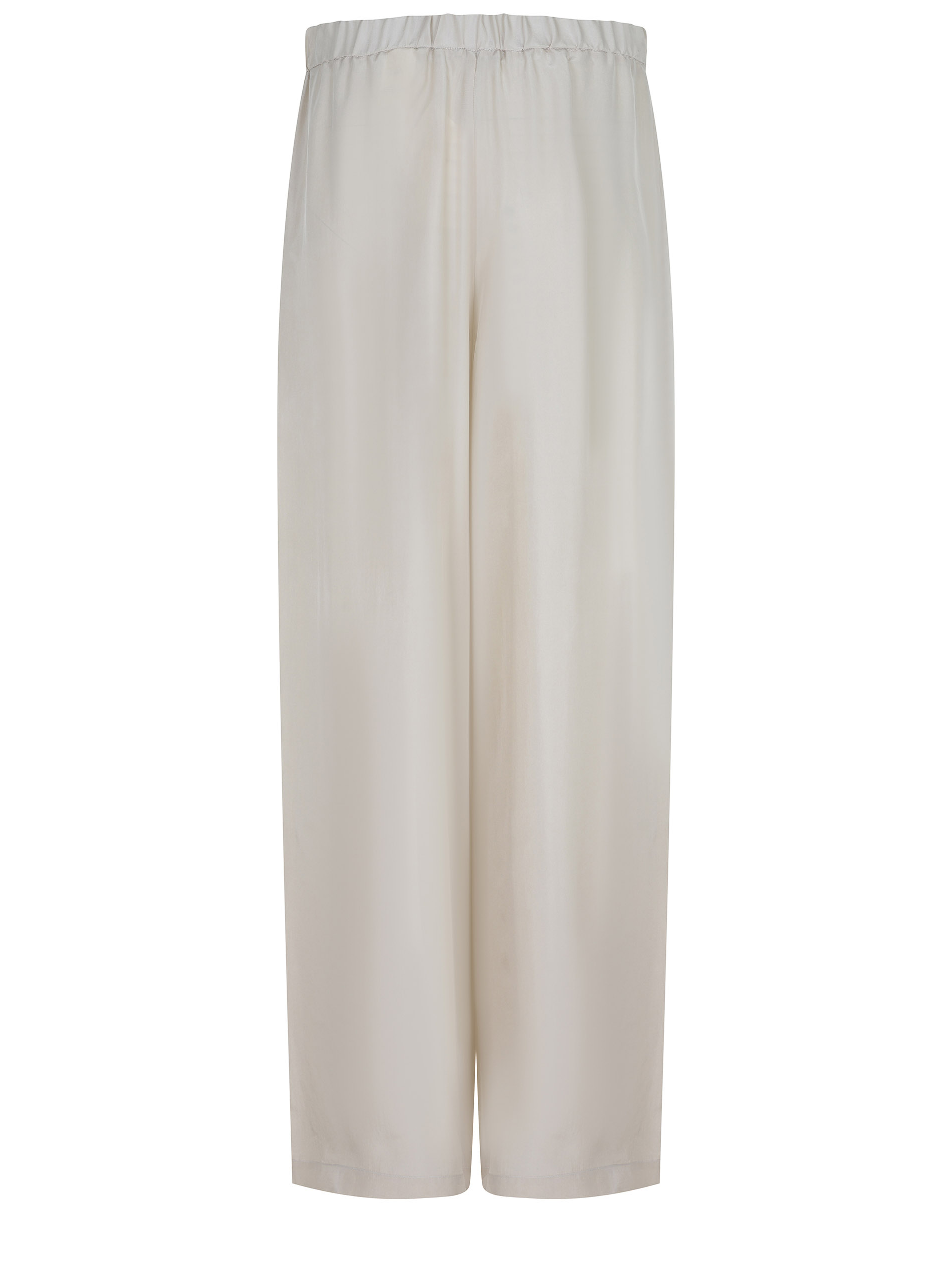 Alysi trousers made of pearl-colored silk. Draped detail at the waist. Invisible side zip closure. Side pockets. Elasticated waistband at the back. 100% silk. Made in Italy
