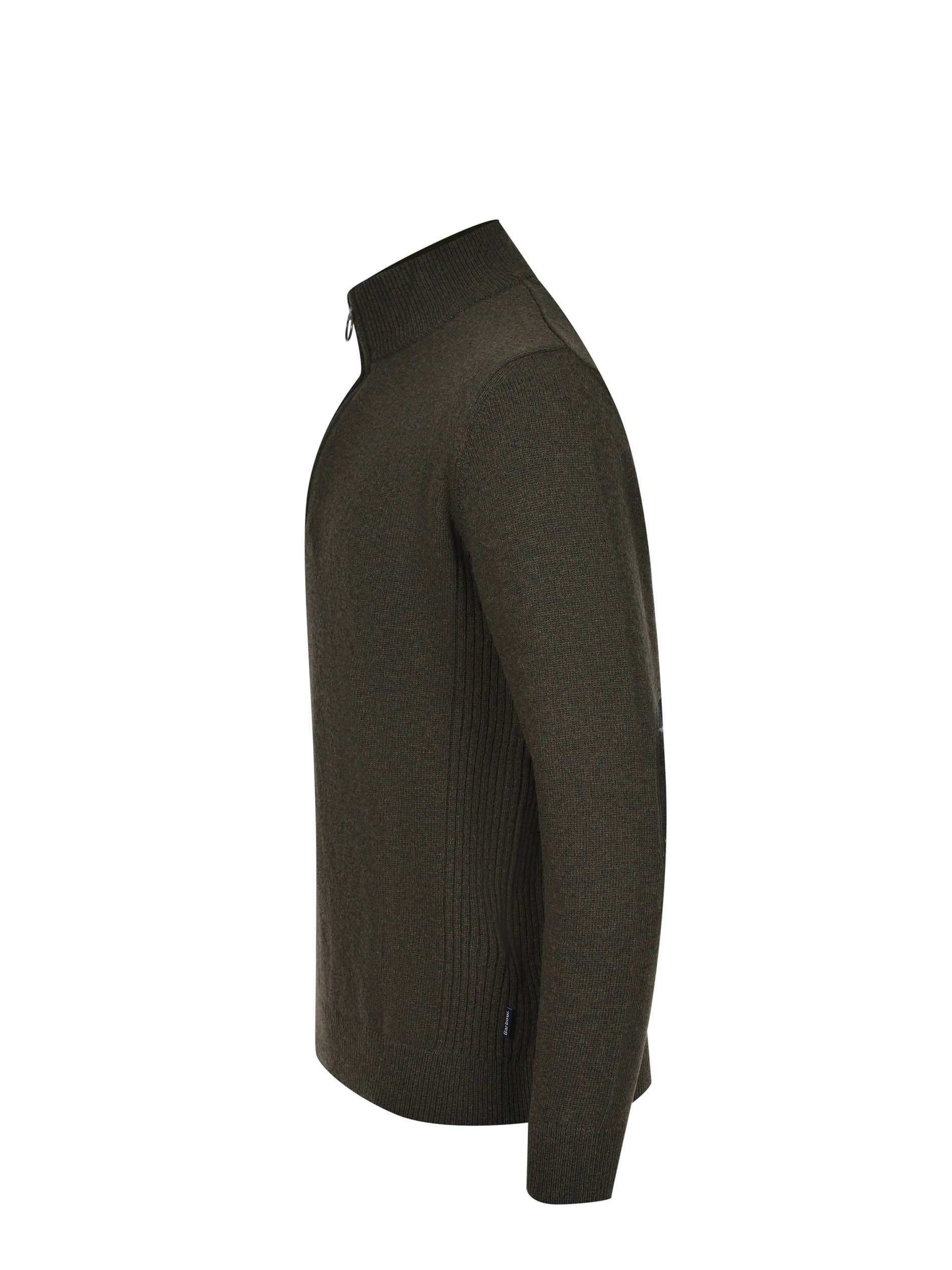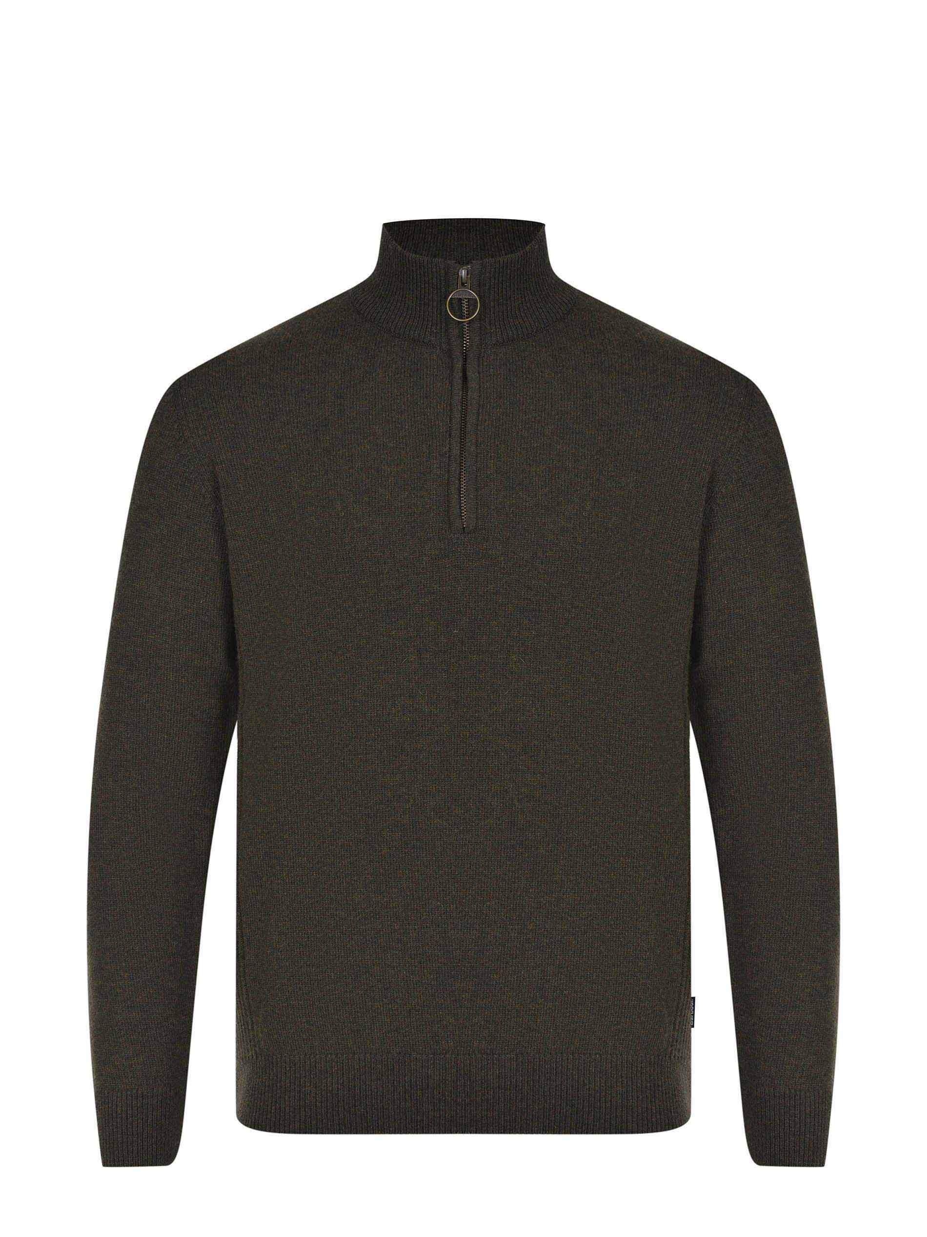 Barbour sweater made of olive-colored wool. Ribbed high collar. Chest zip. Long sleeves. Contrasting patches on the back of the sleeves. 100% wool