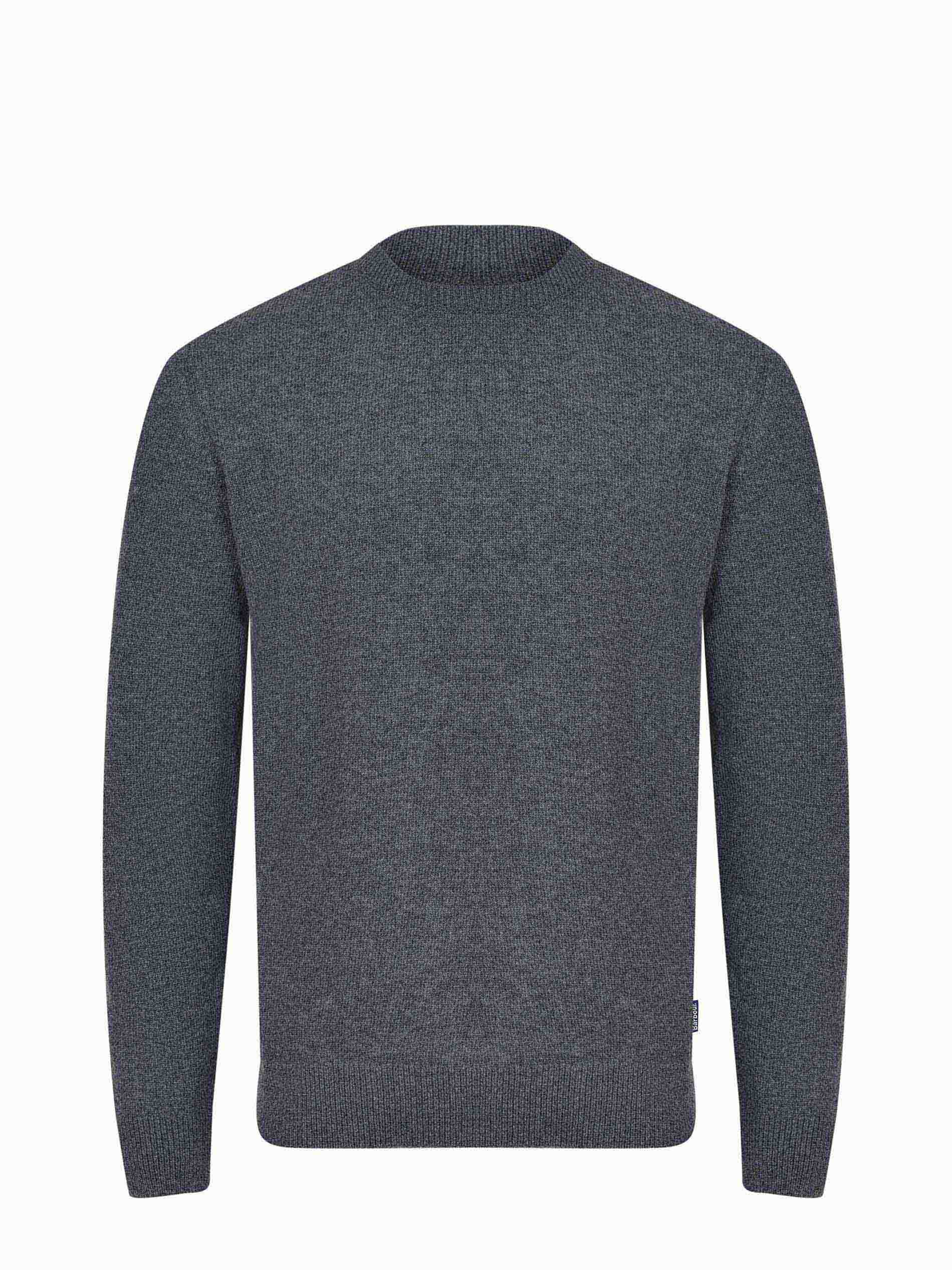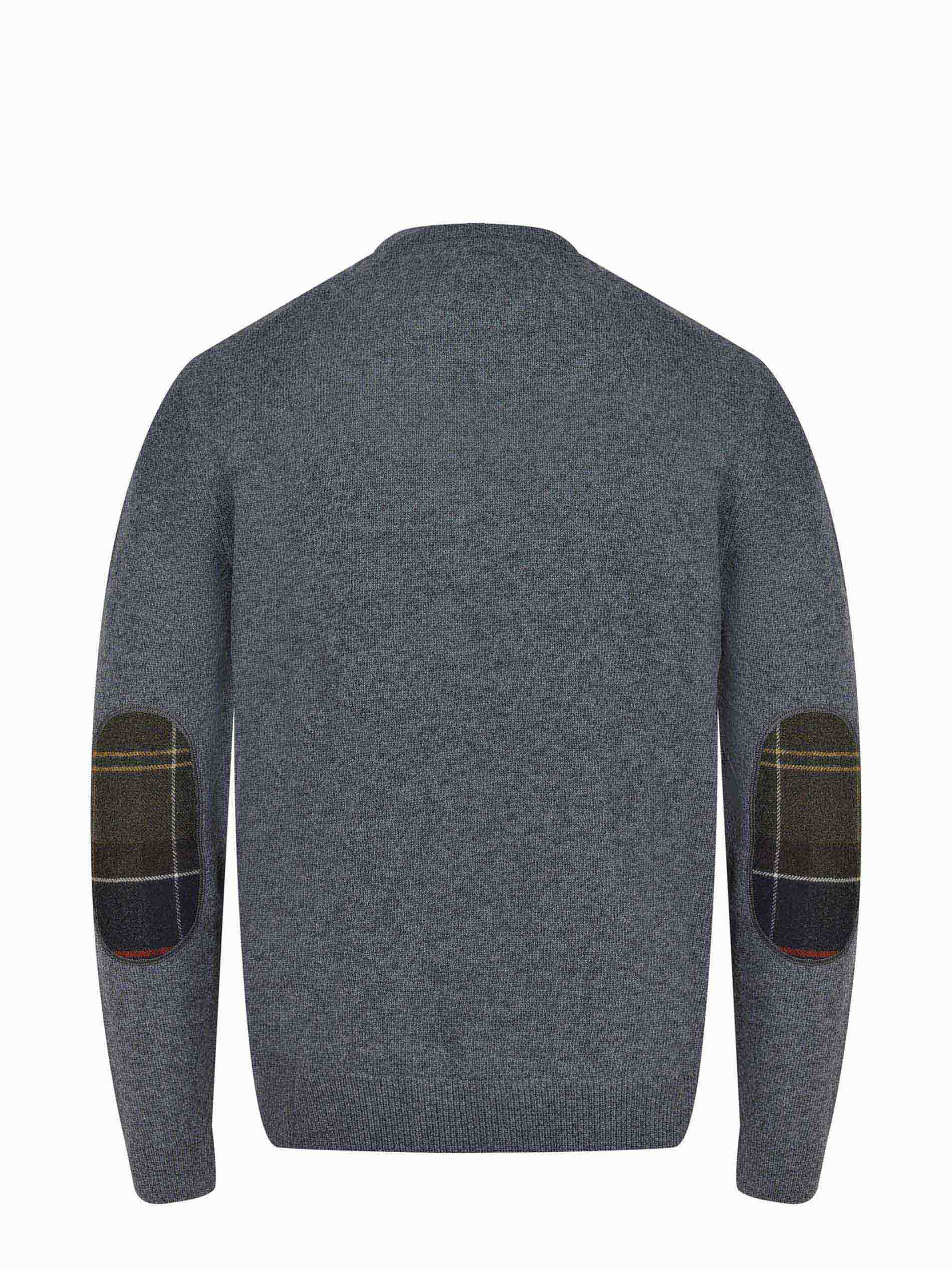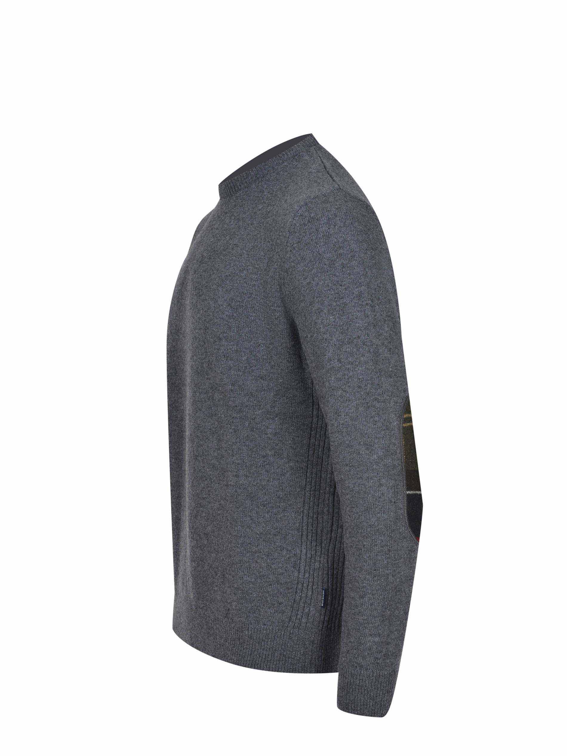 Barbour sweater made of medium gray wool. Ribbed crew neck. Long sleeves. Contrasting patches on the back of the sleeves. Ribbed side details. 100% wool