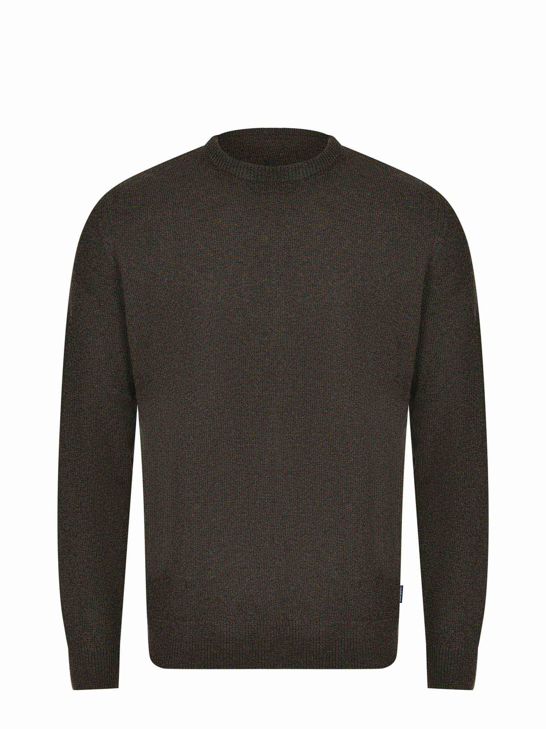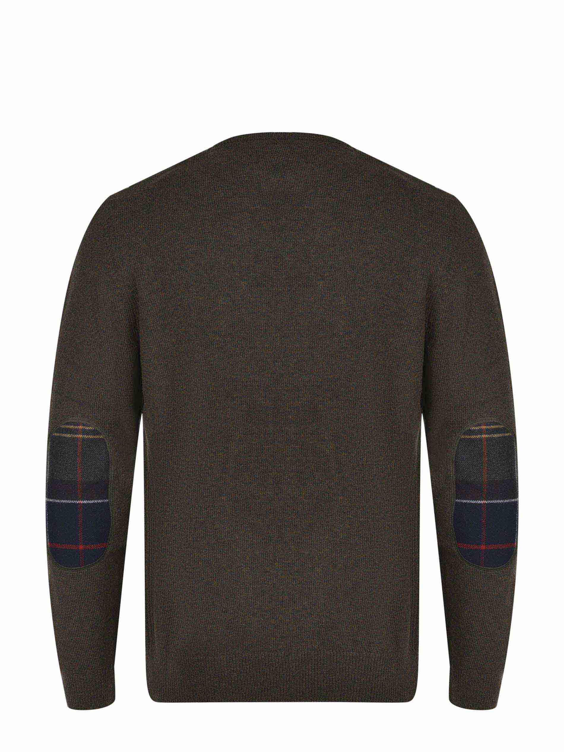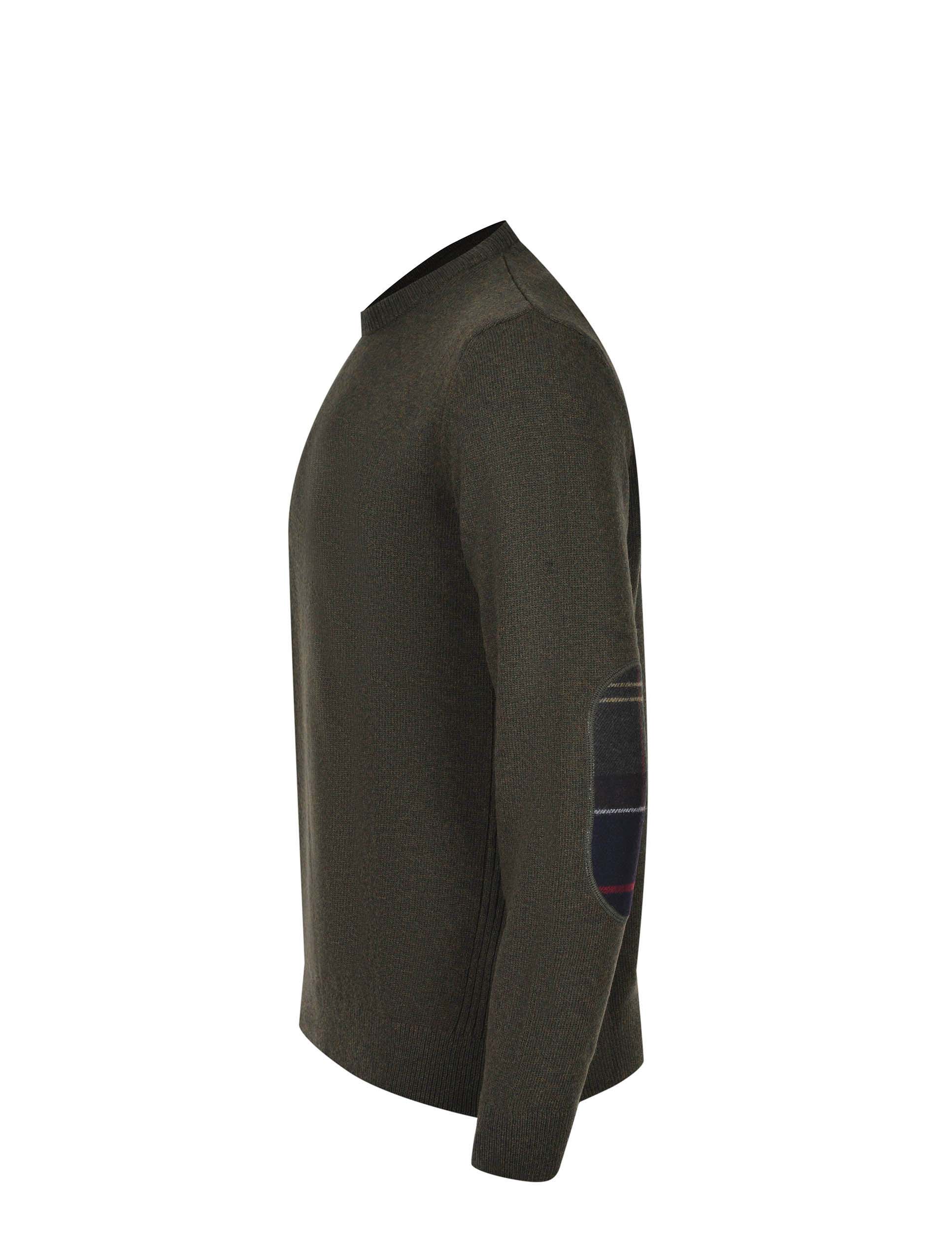 Barbour sweater made of olive-colored wool. Ribbed crew neck. Long sleeves. Contrasting patches on the back of the sleeves. Ribbed side details. 100% wool