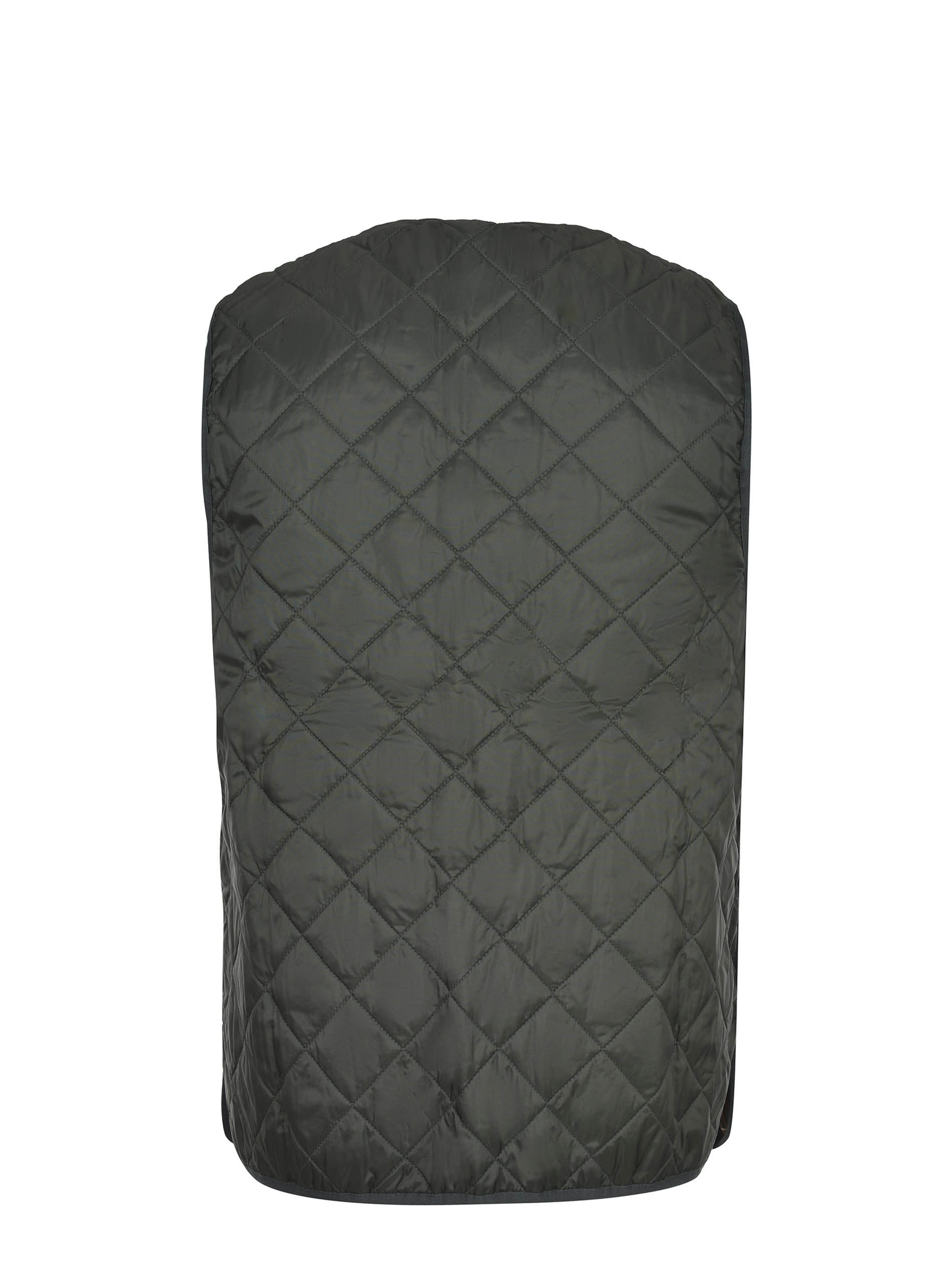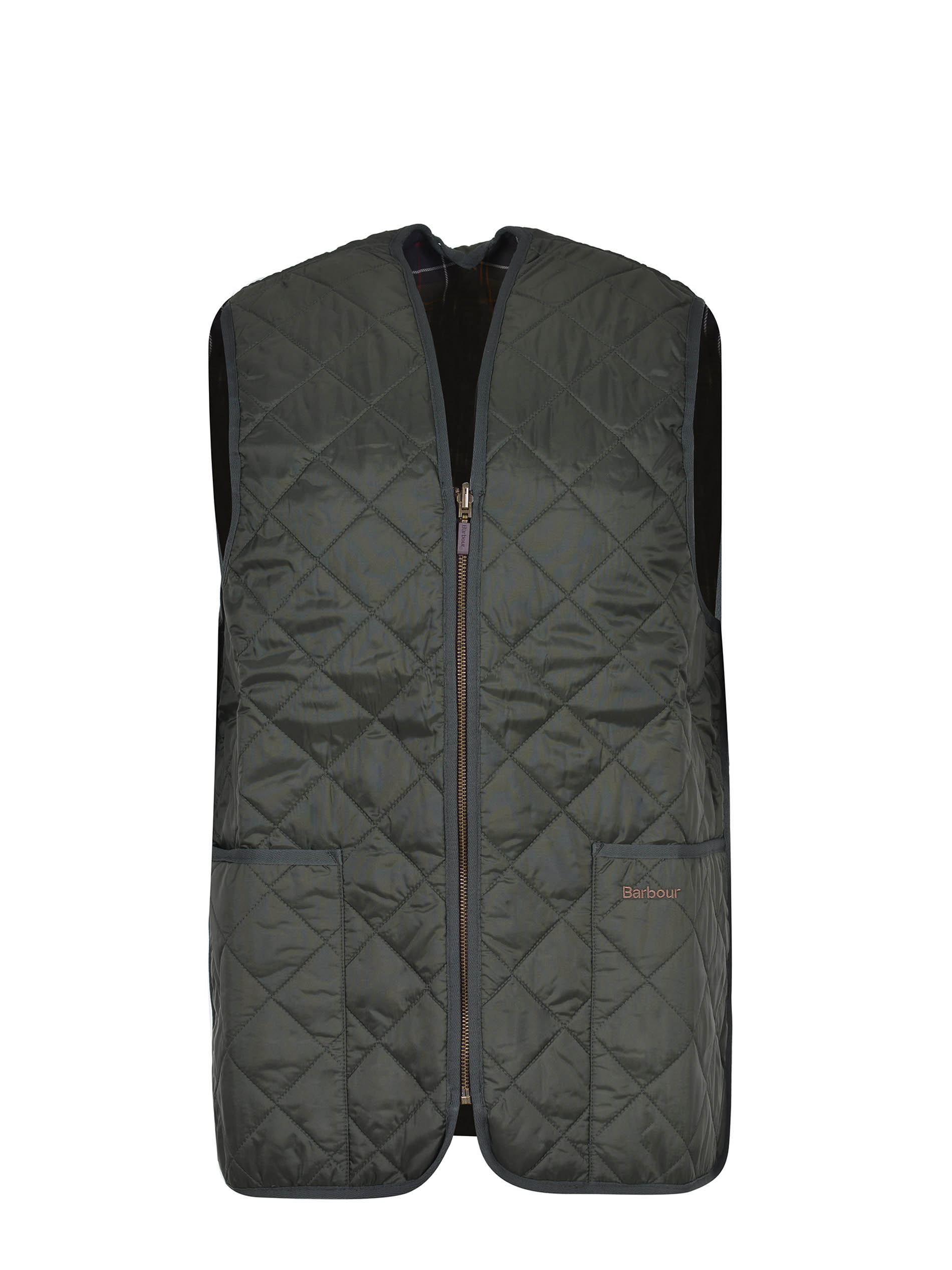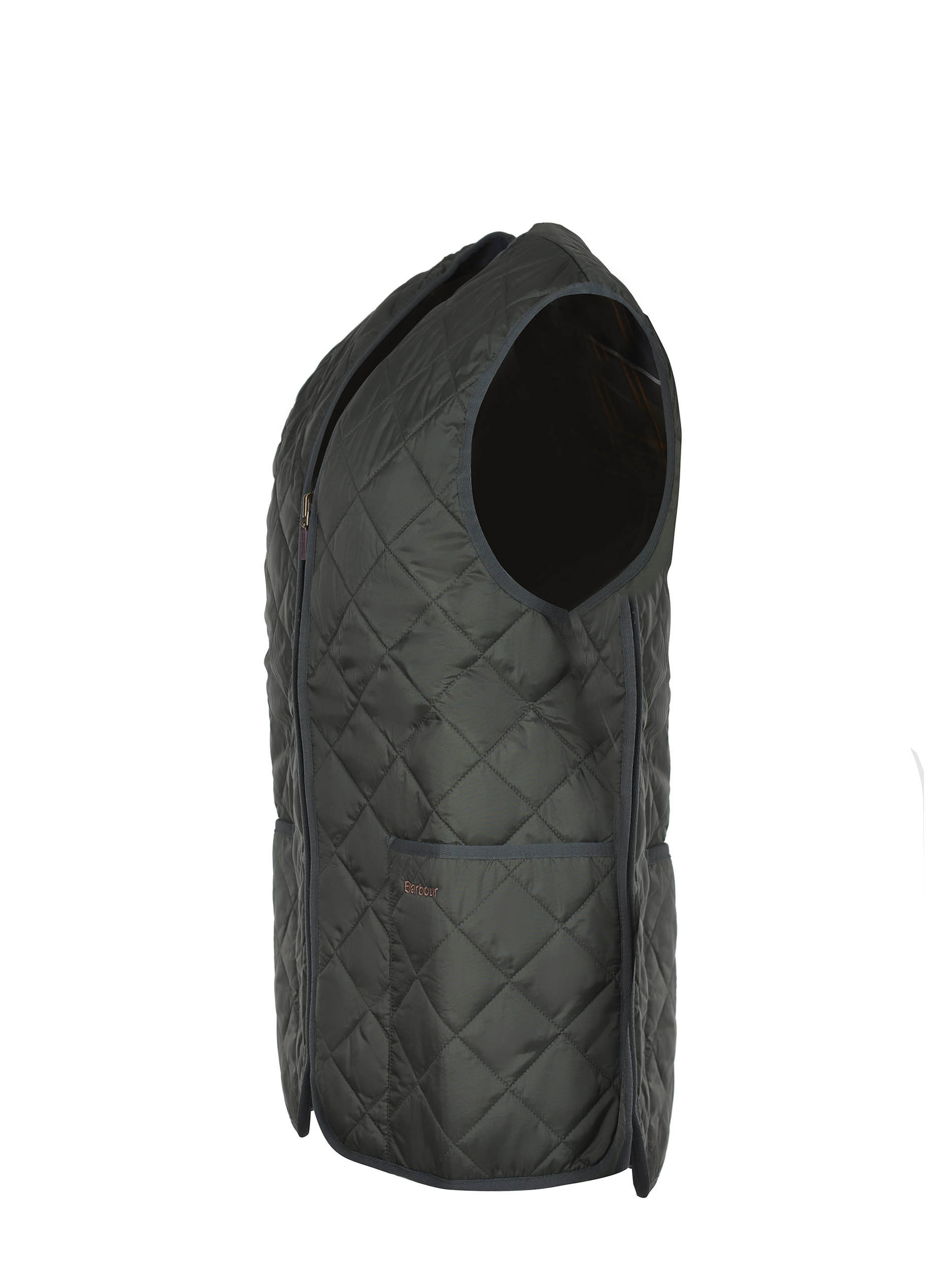 Barbour vest made of olive-colored nylon. Quilted in a diamond pattern. V-neck. Sleeveless. Front zip closure. Side pockets. Contrasting embroidered logo lettering on the side. 100% polyamide.