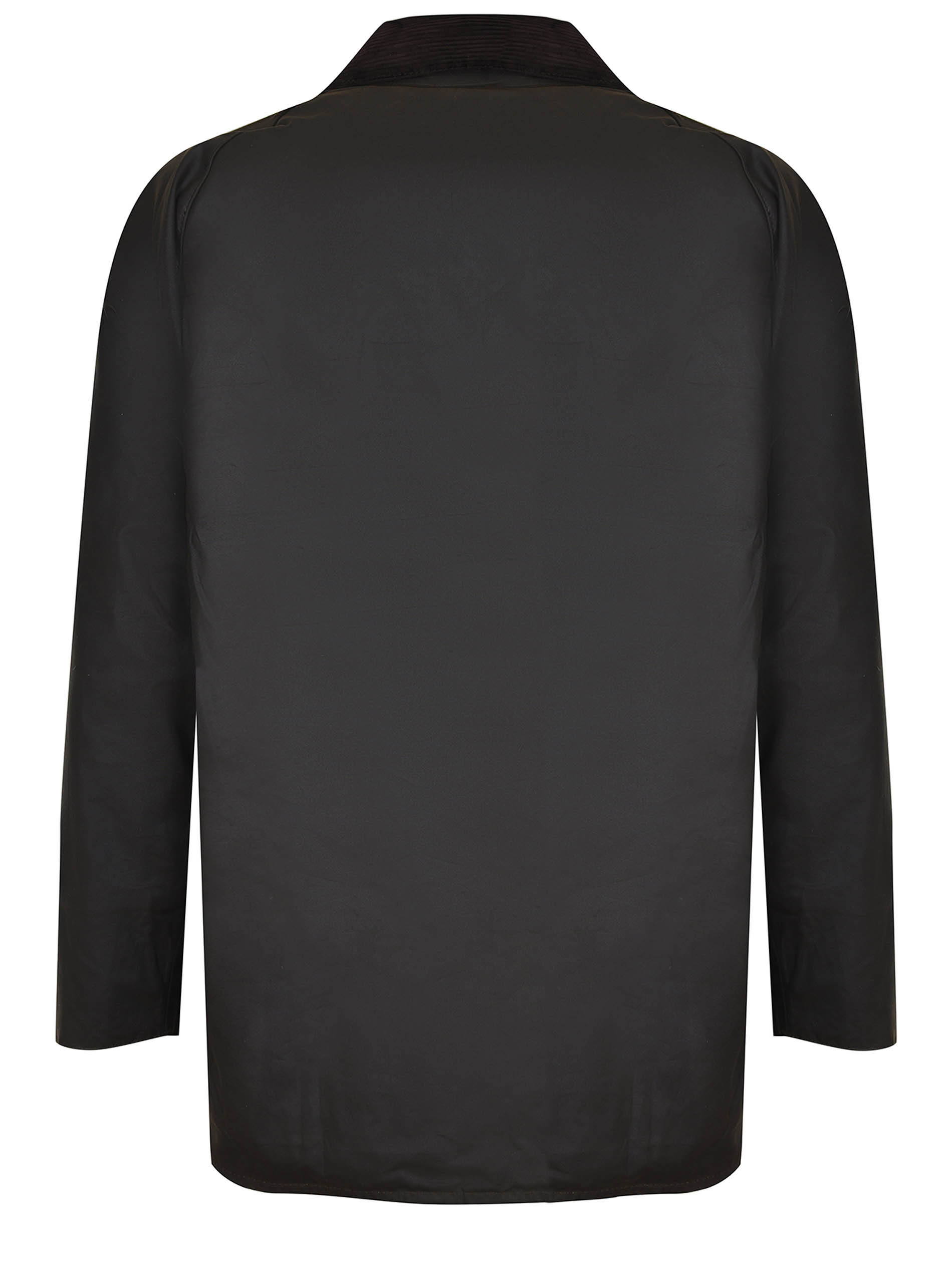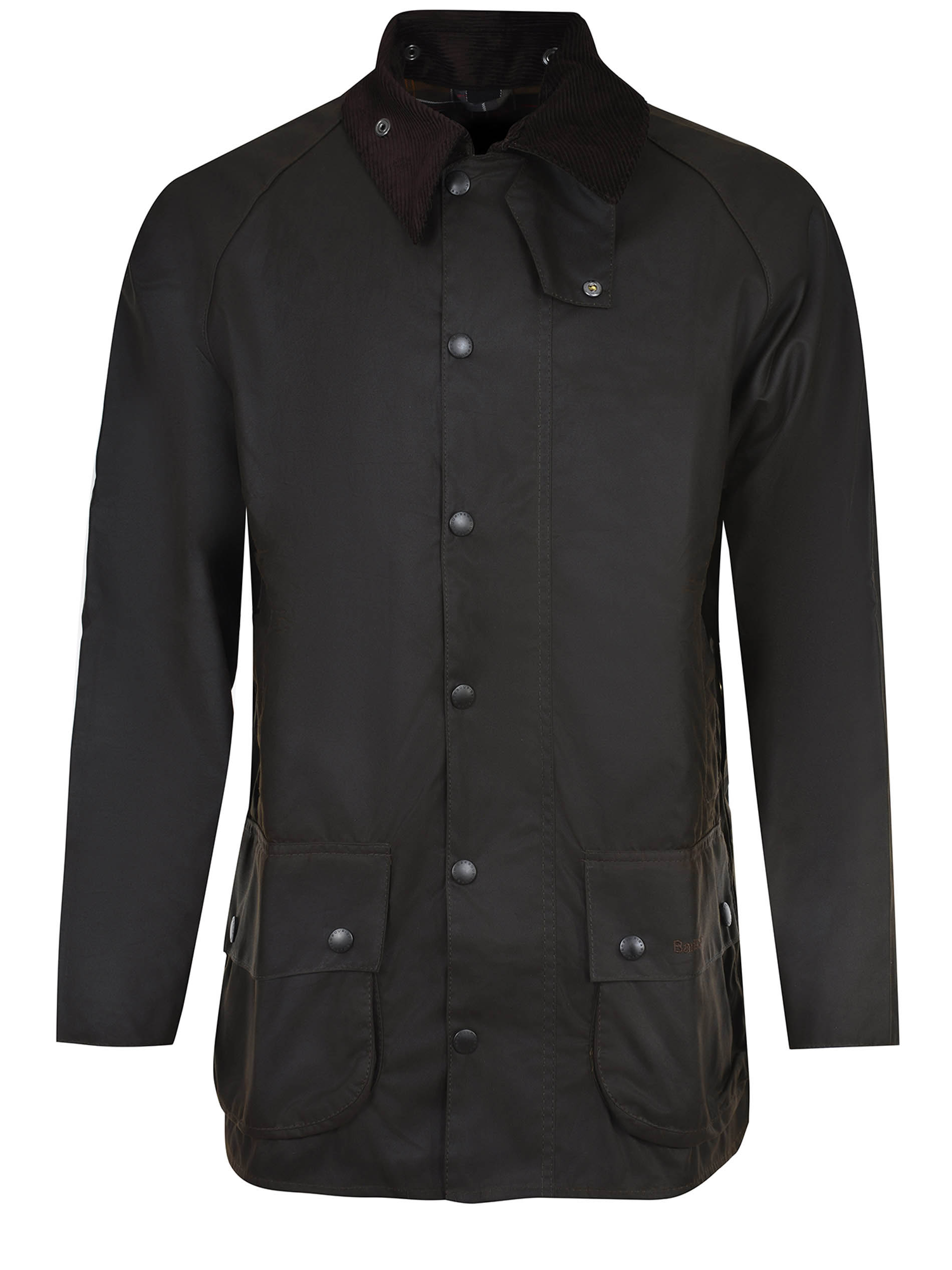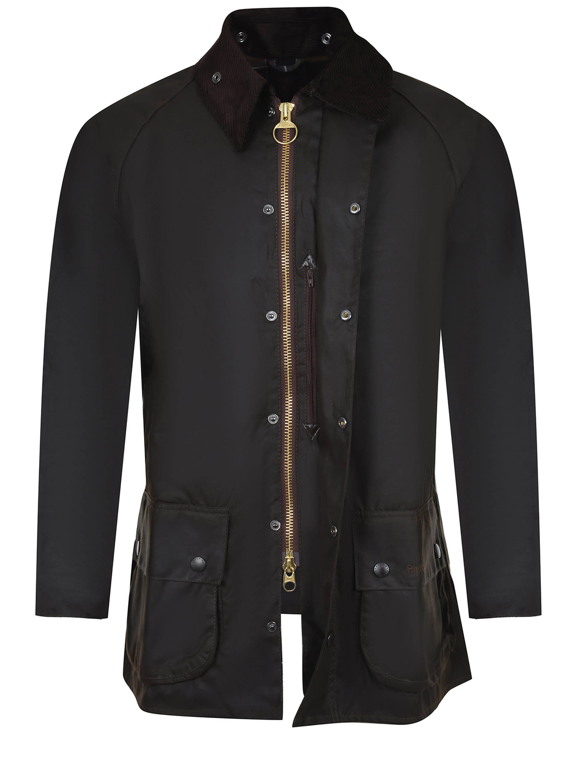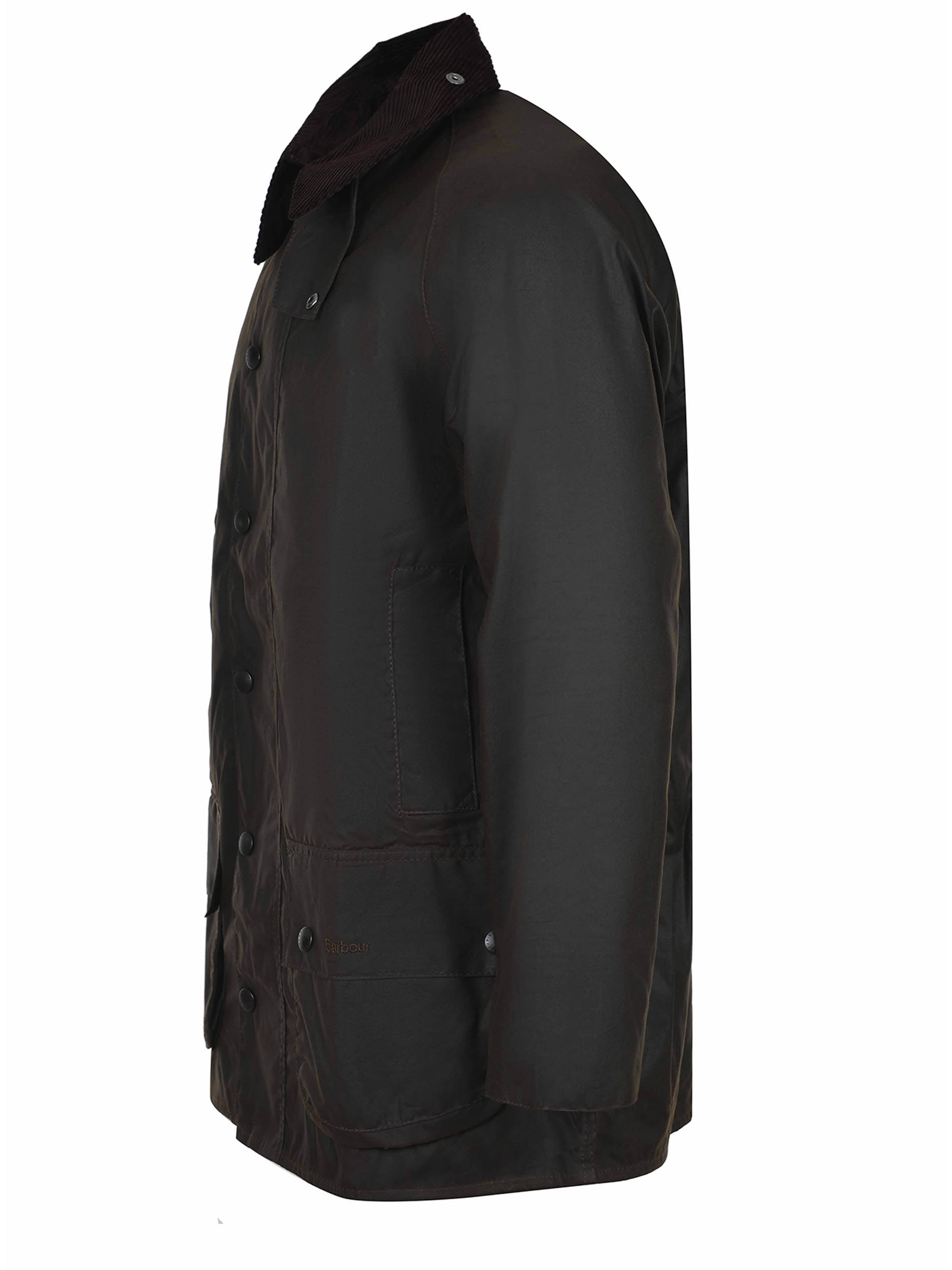 Barbour long jacket made of dark brown cotton. Corduroy ribbed collar with buttons. Front closure with a double slider zip covered by a placket with buttons. Long sleeves. Side pockets with flaps and buttons. Contrasting logo lettering embroidered on the pocket. 100% cotton