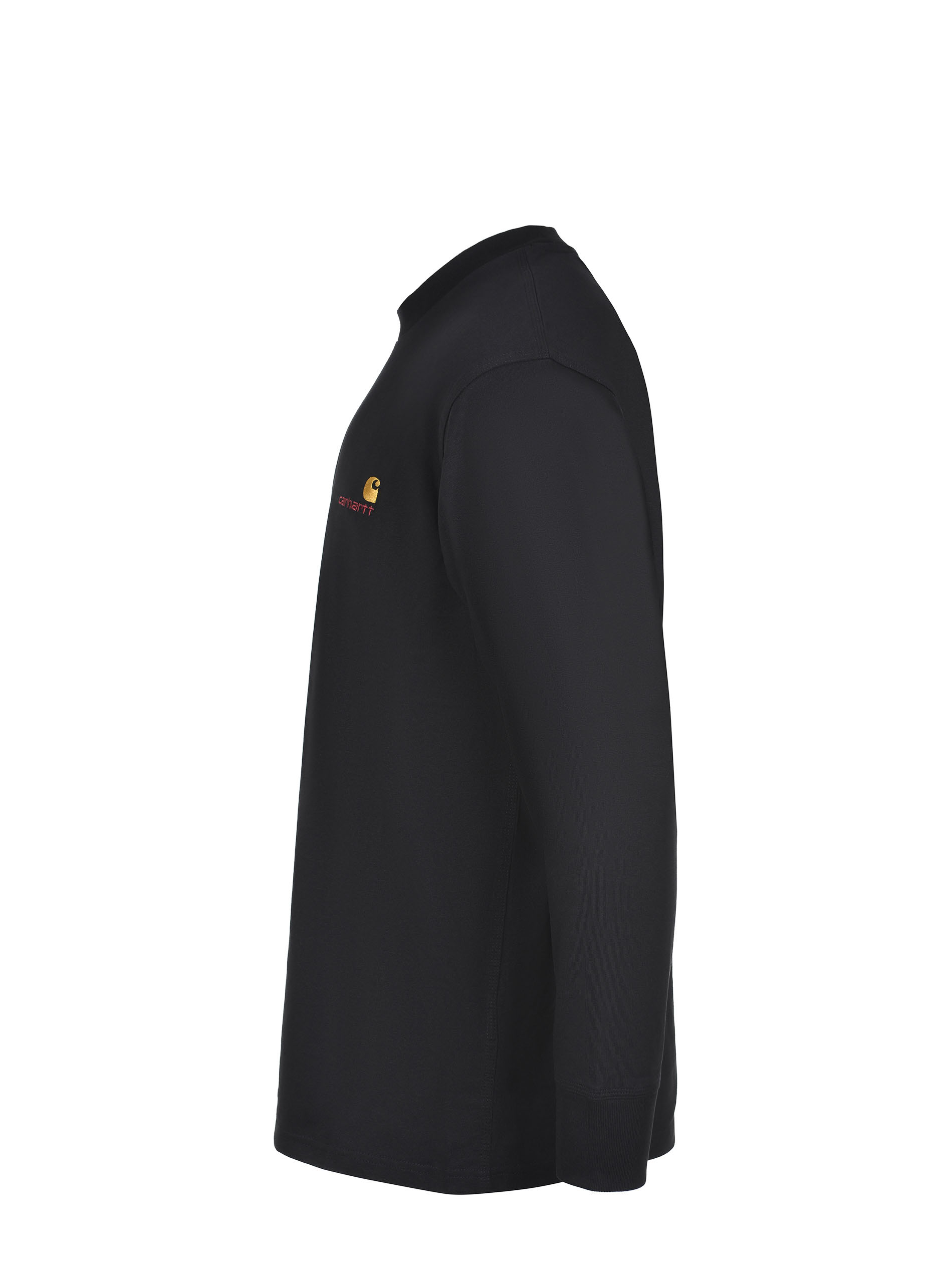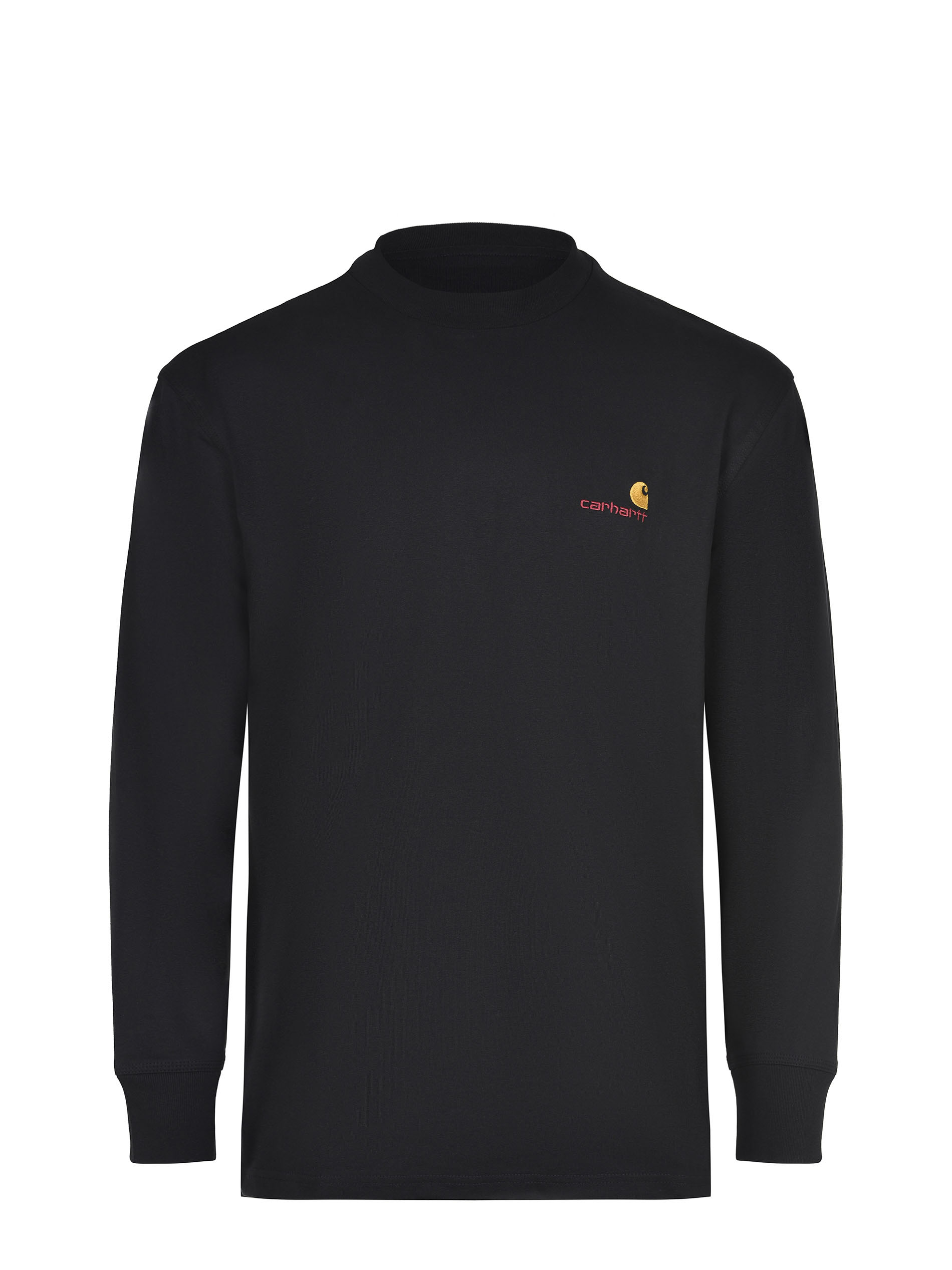 Carhartt T-shirt made of black cotton. Ribbed crew neck. Long sleeves with ribbed cuffs. Contrast embroidered logo lettering on the chest. 100% cotton