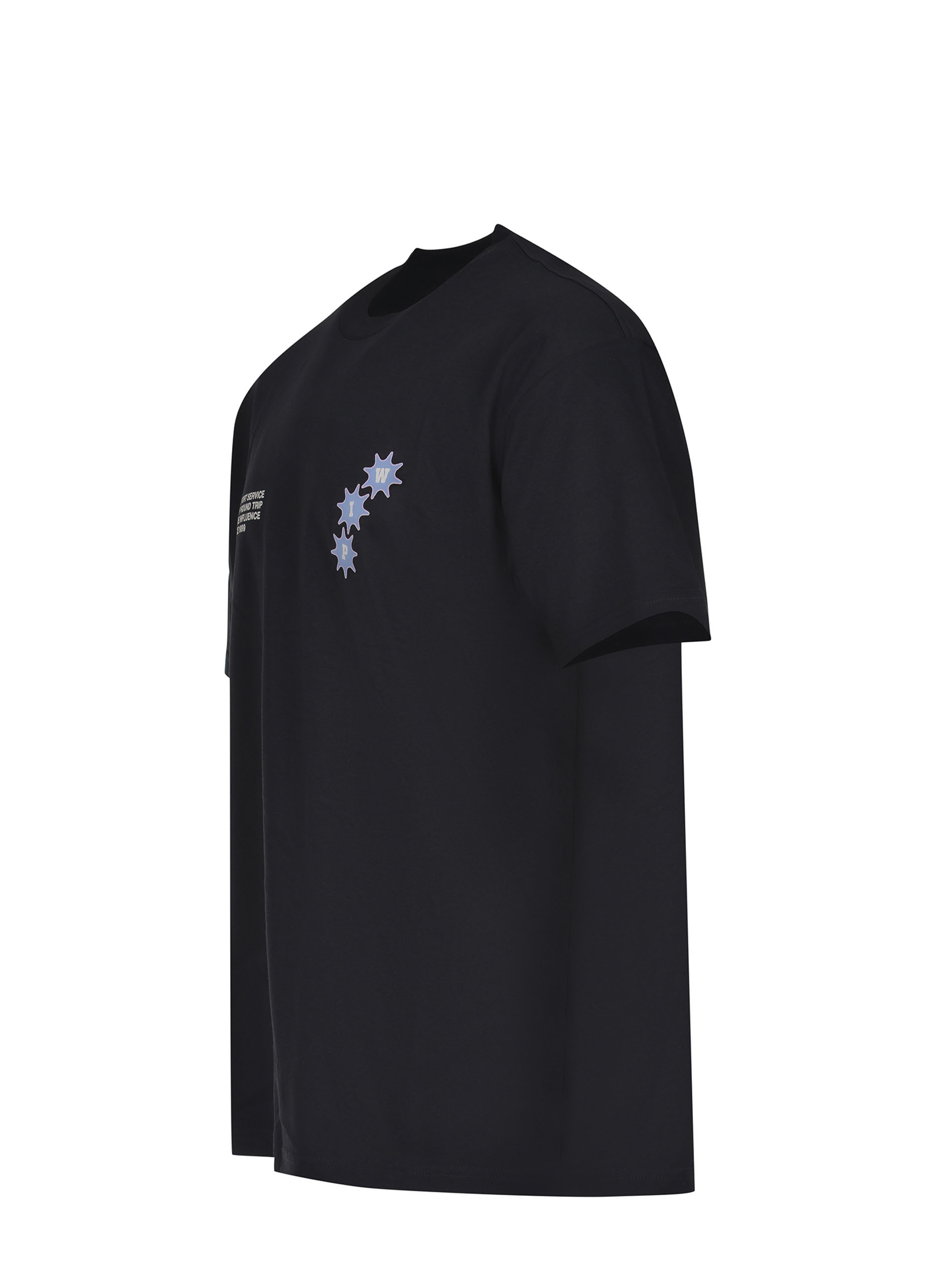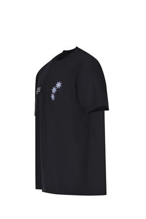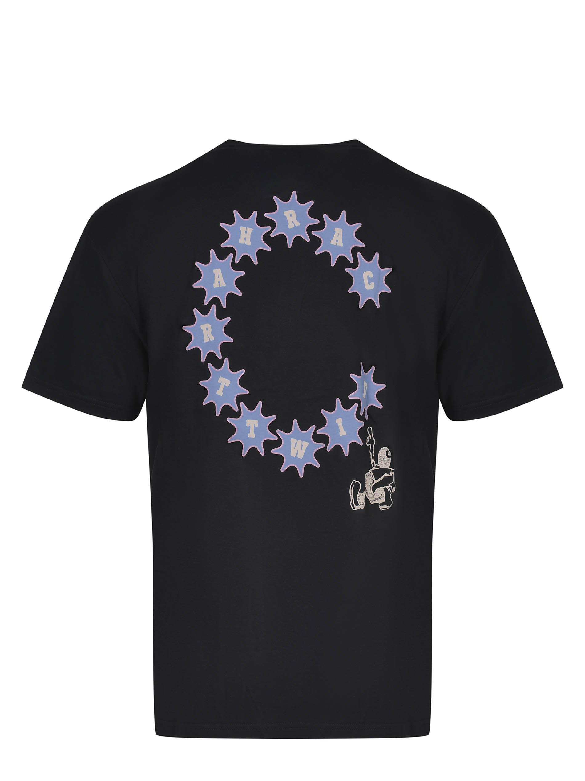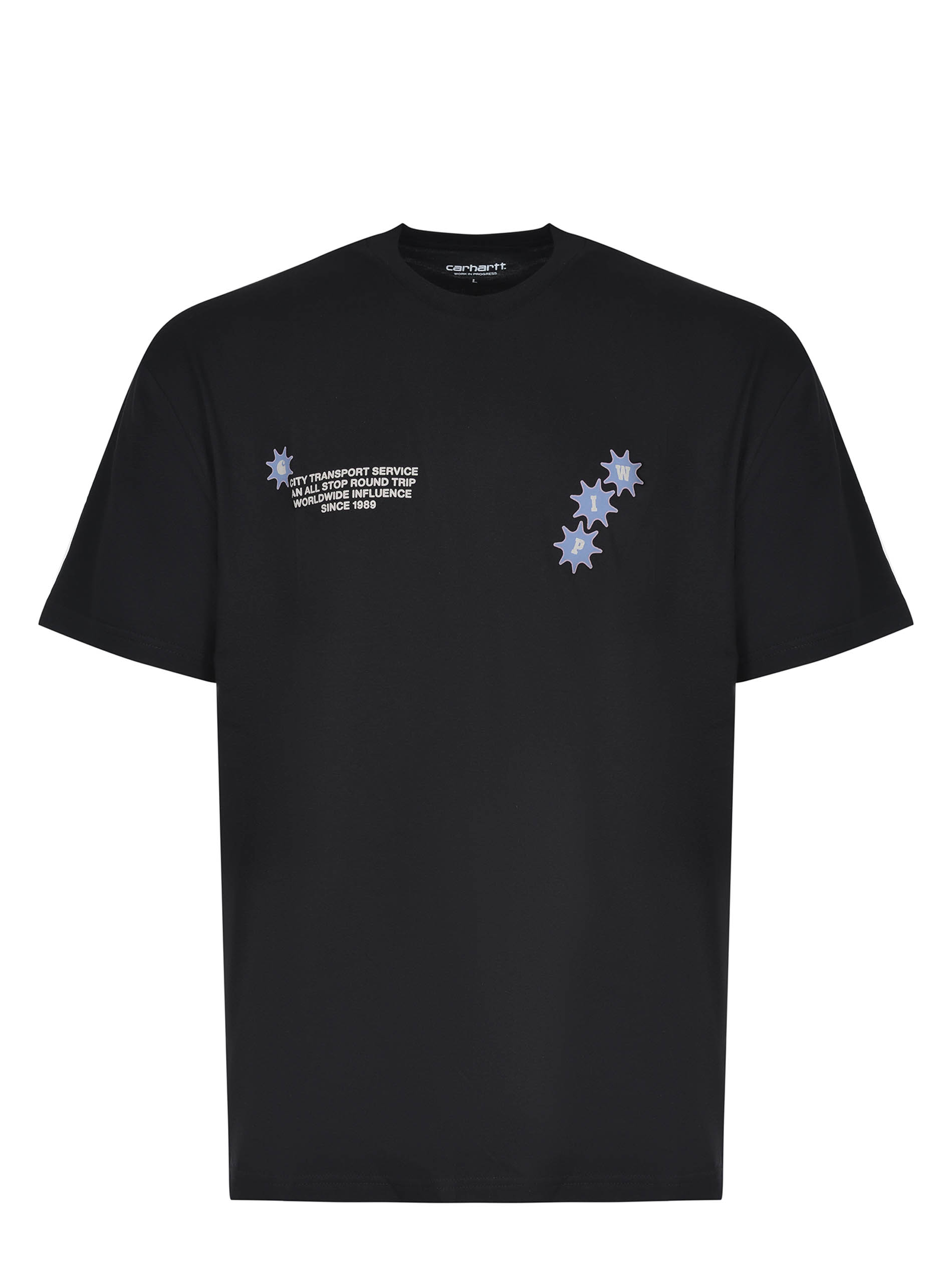 Carhartt T-shirt made of black cotton. Ribbed crew neck. Short sleeves. Contrasting prints on the chest. Large print and logo lettering on the back in contrast. 100% cotton