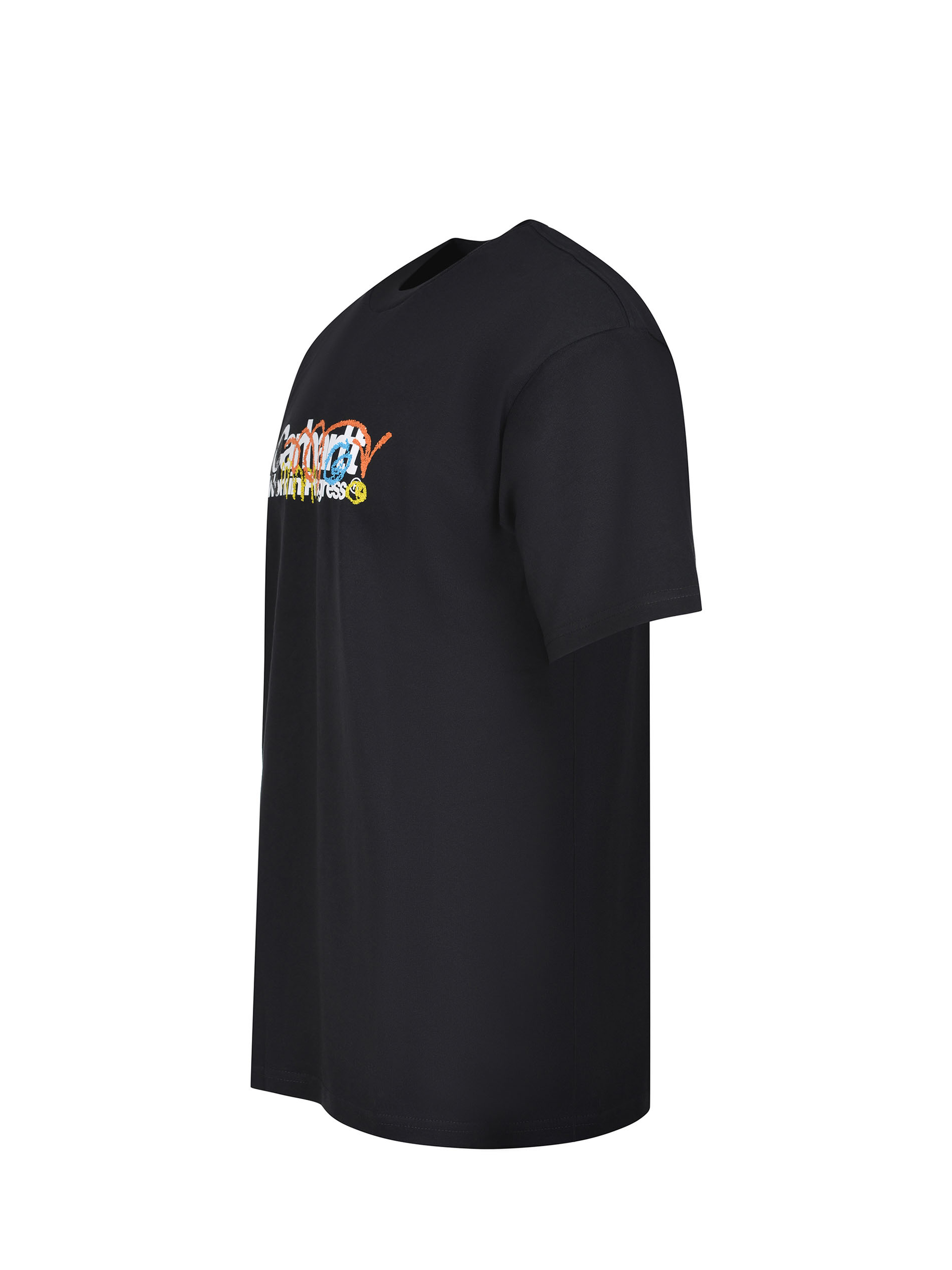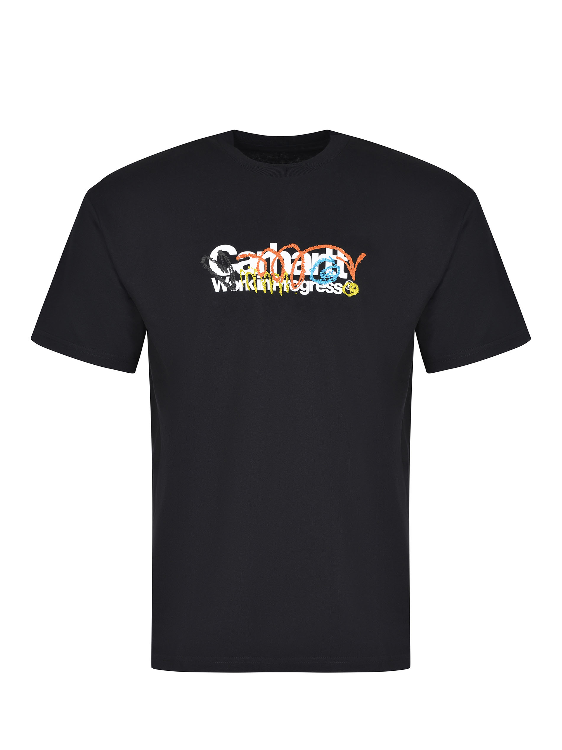Carhartt T-shirt made of black cotton. Ribbed crew neck. Short sleeves. Logo lettering with contrasting patterns printed on the chest and back. 100% cotton.