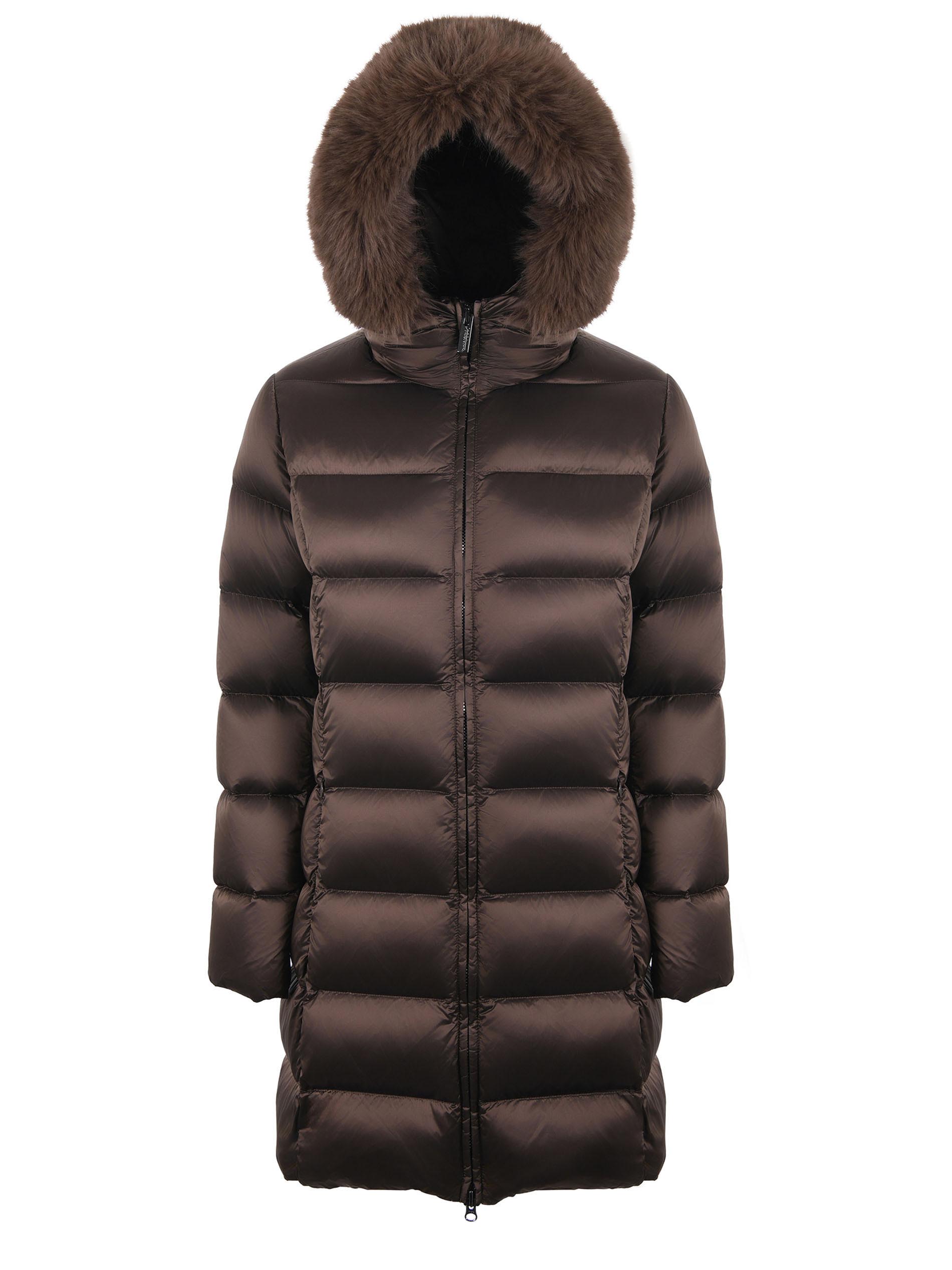 Colmar Originals quilted semi-gloss nylon down jacket. Mid-length. Padded with goose down. Removable hood with real fur trim. Double-slider zip closure. Zip pockets. Logo patch on the left sleeve. Slim fit.
