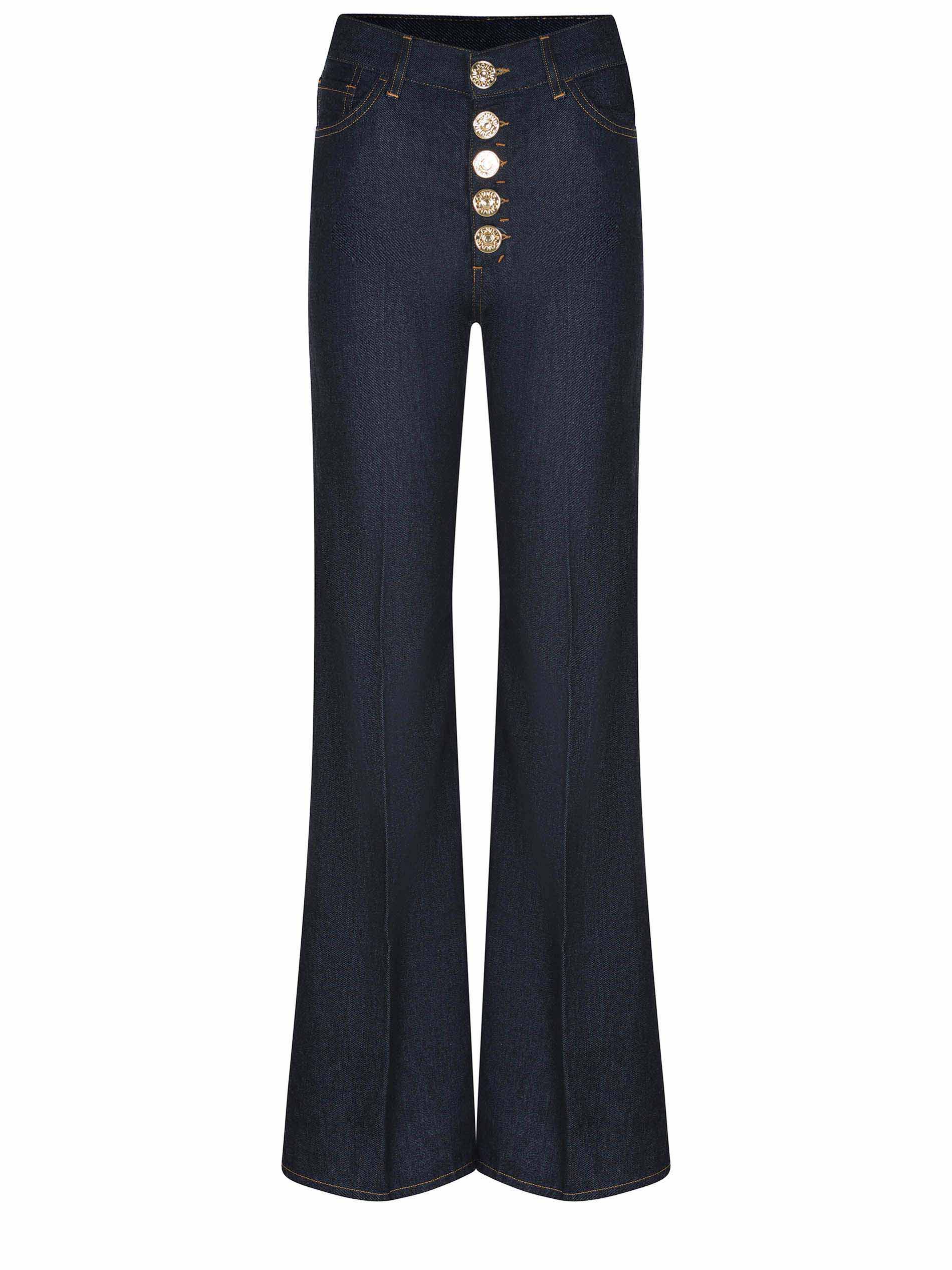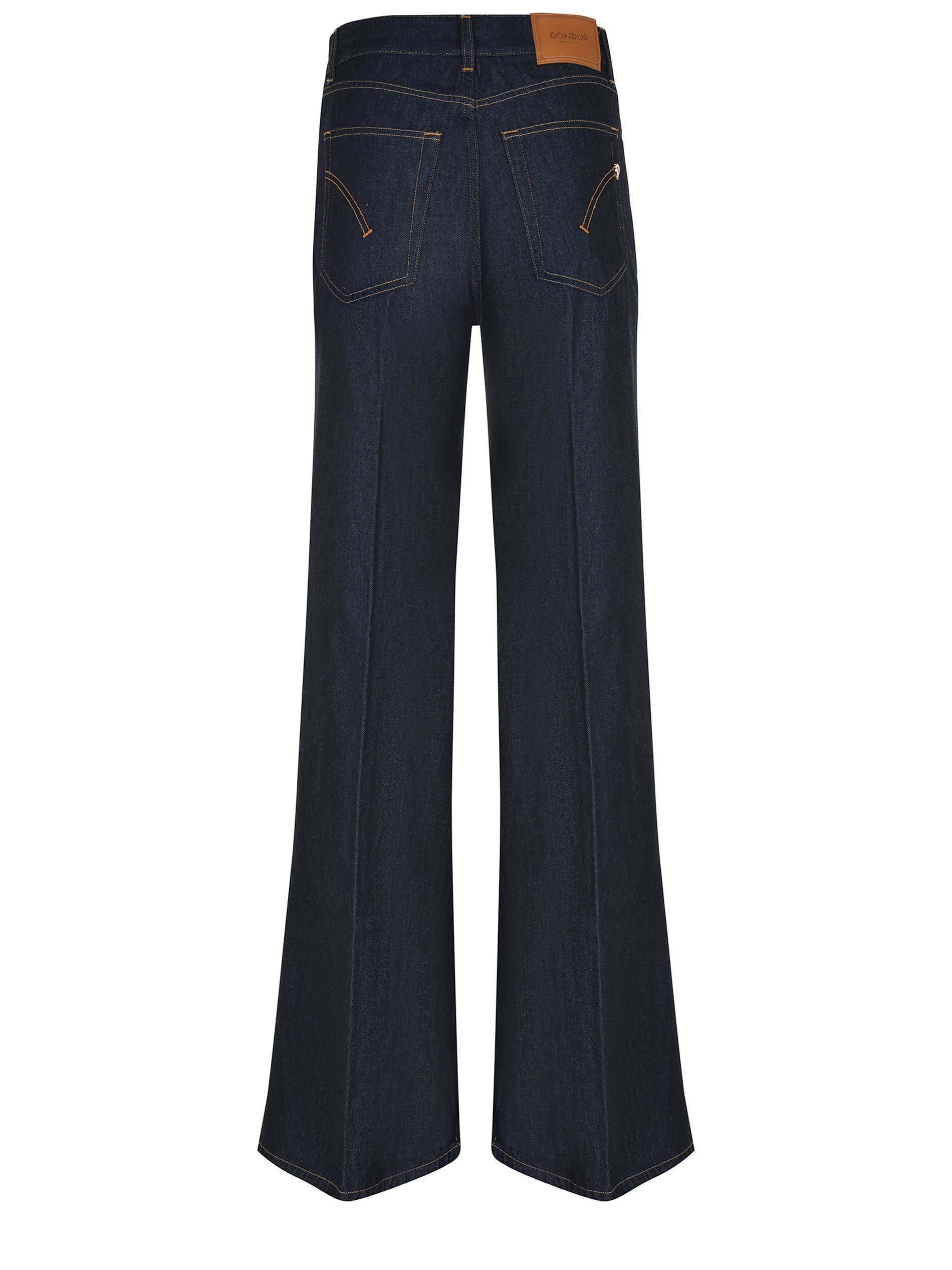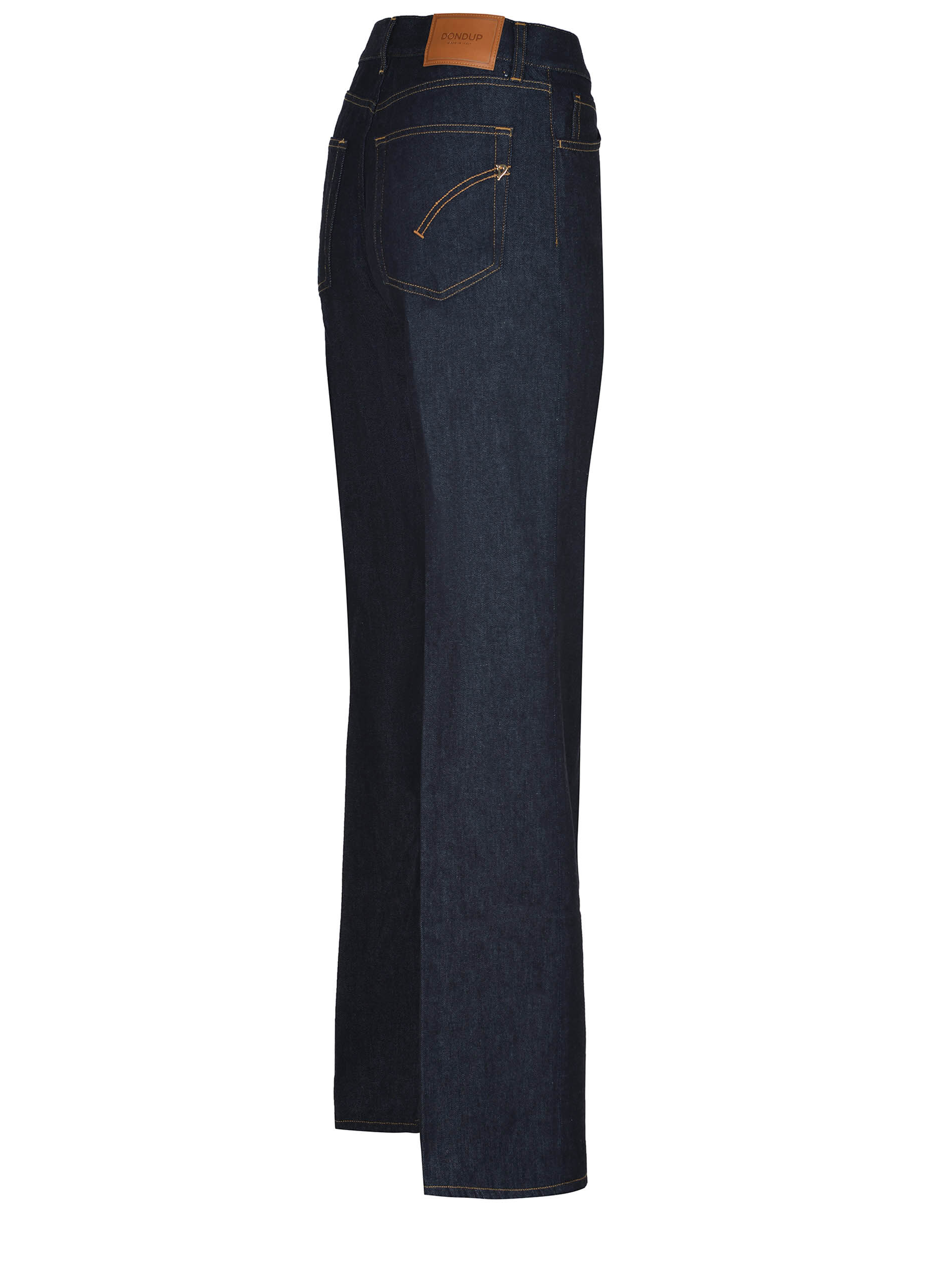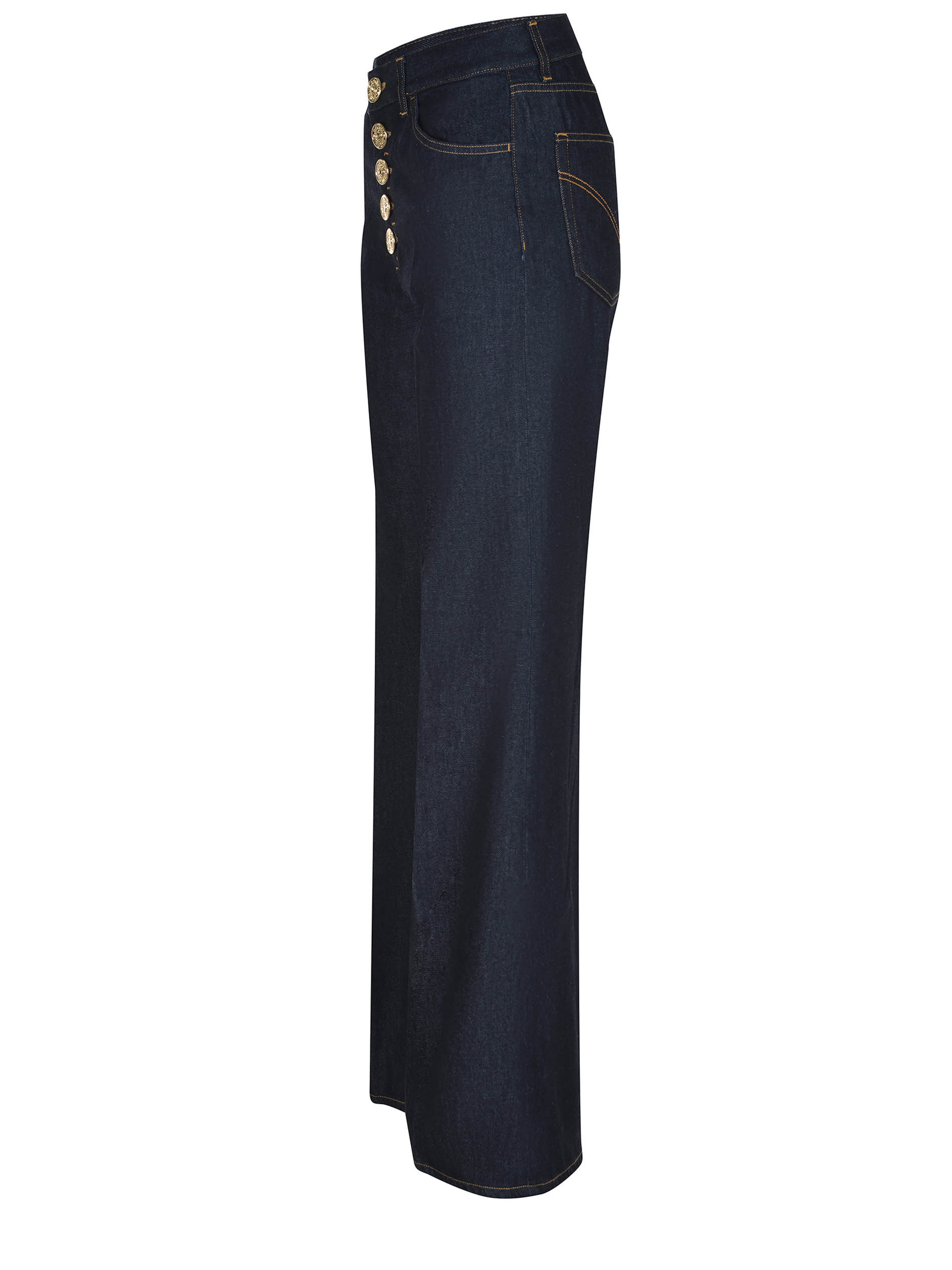 Dondup "Amber" jeans made of dark blue denim. Five pockets. Front button closure with visible gold buttons. Belt loops at the waist. Logo label applied on the back in contrast. Silver-colored metal "D" monogram on the back. Straight fit. 80% cotton, 20% recycled cotton. Made in Italy
