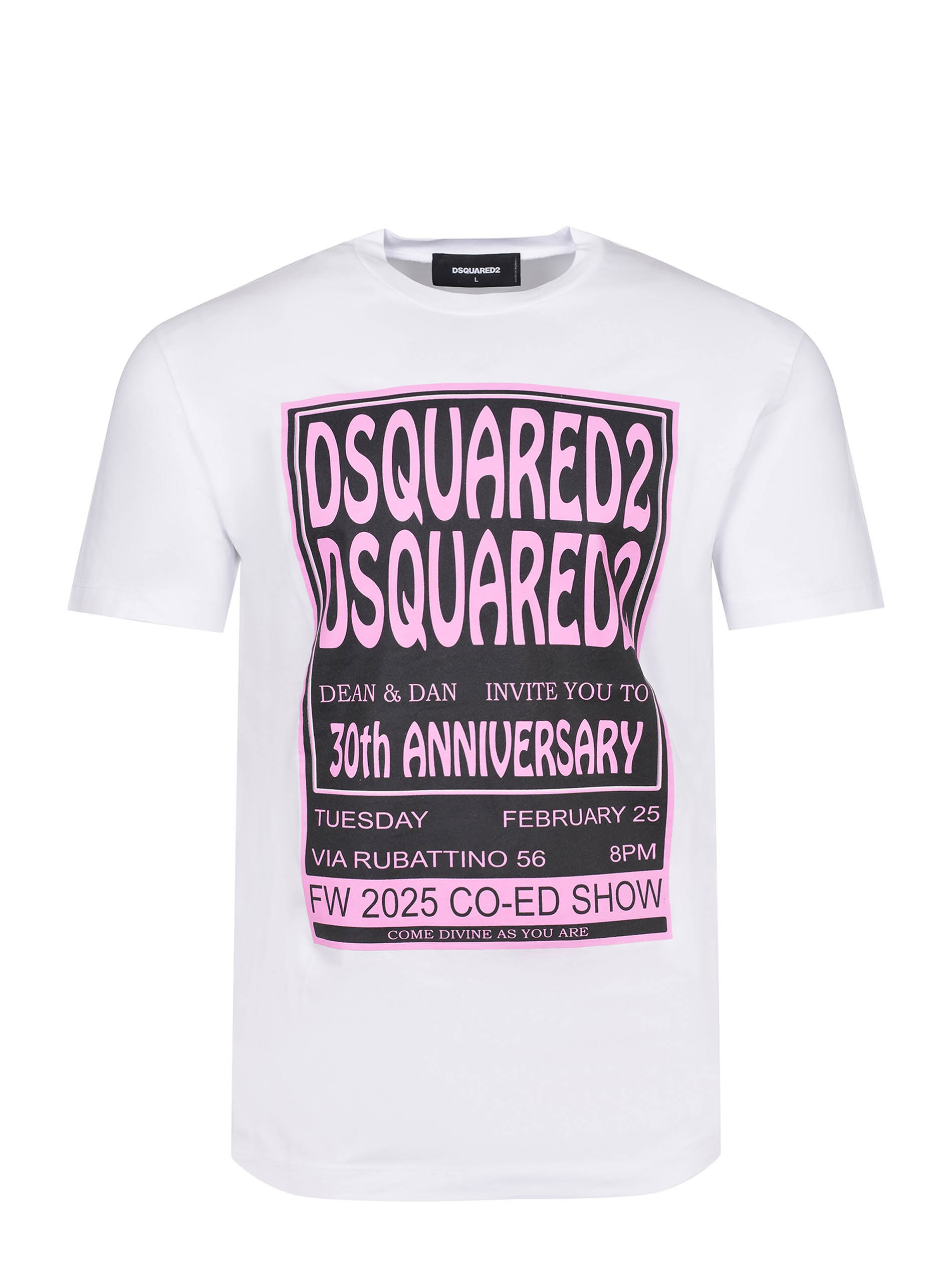 Dsquared2 T-shirt made of white cotton. Ribbed crew neck. Short sleeves. Large print and logo lettering on the front in contrast. 100% cotton