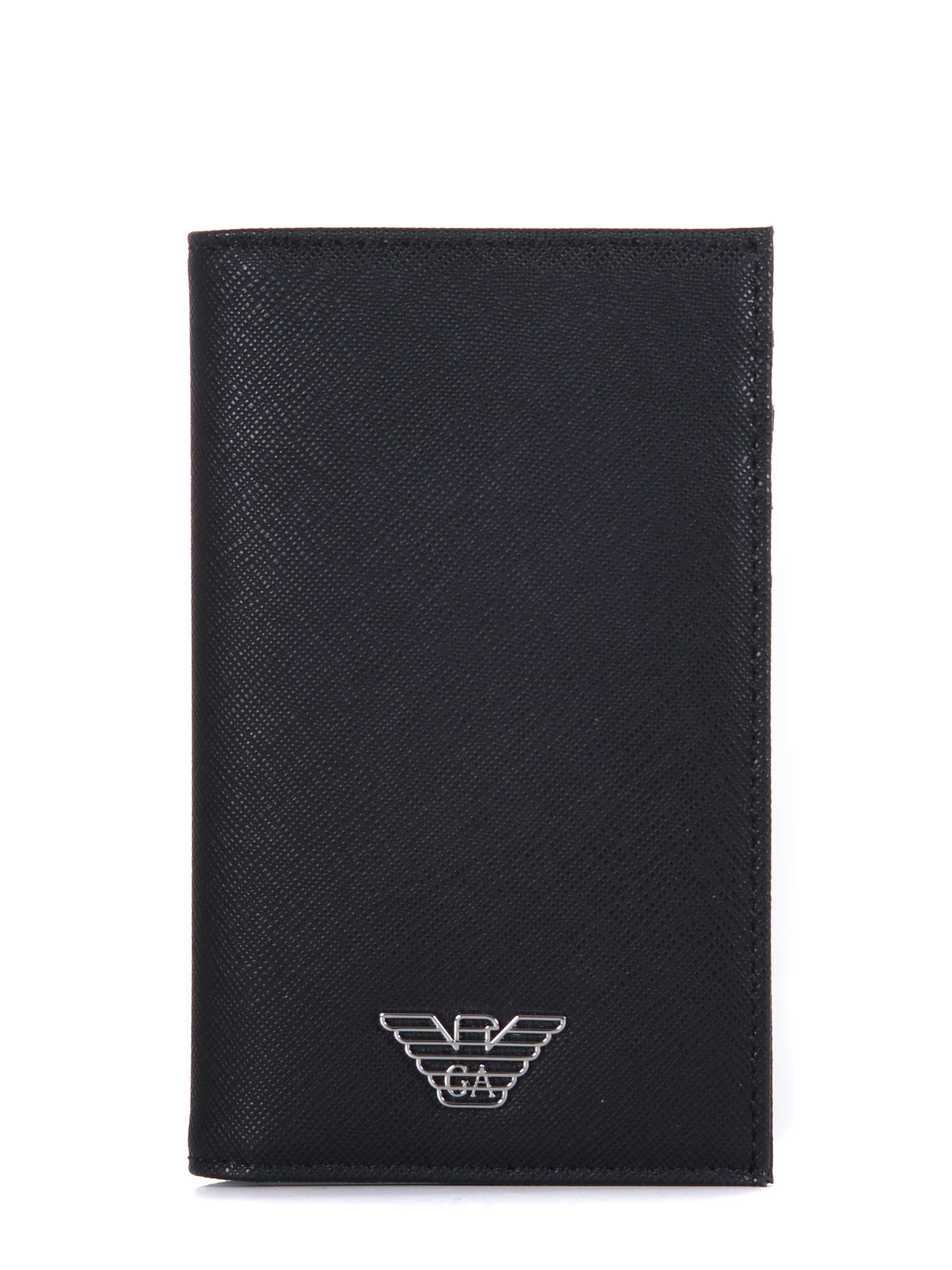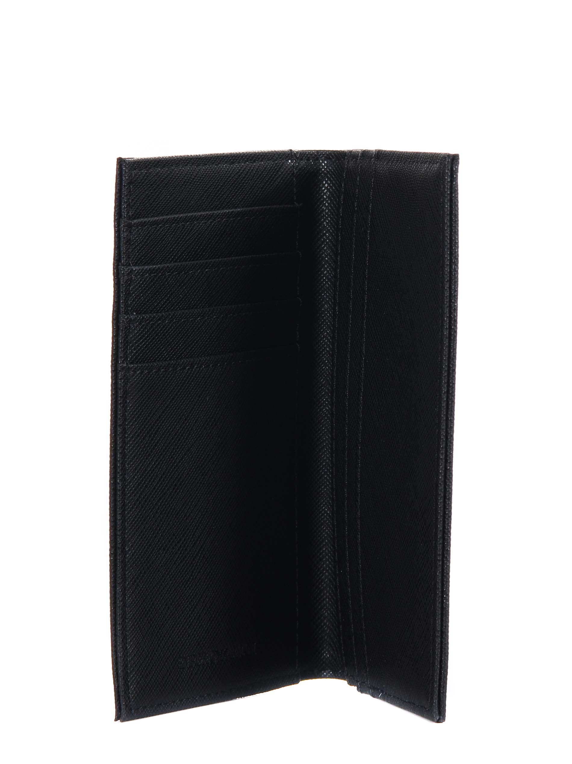 Emporio Armani card holder in black saffiano faux leather. Credit card slots.