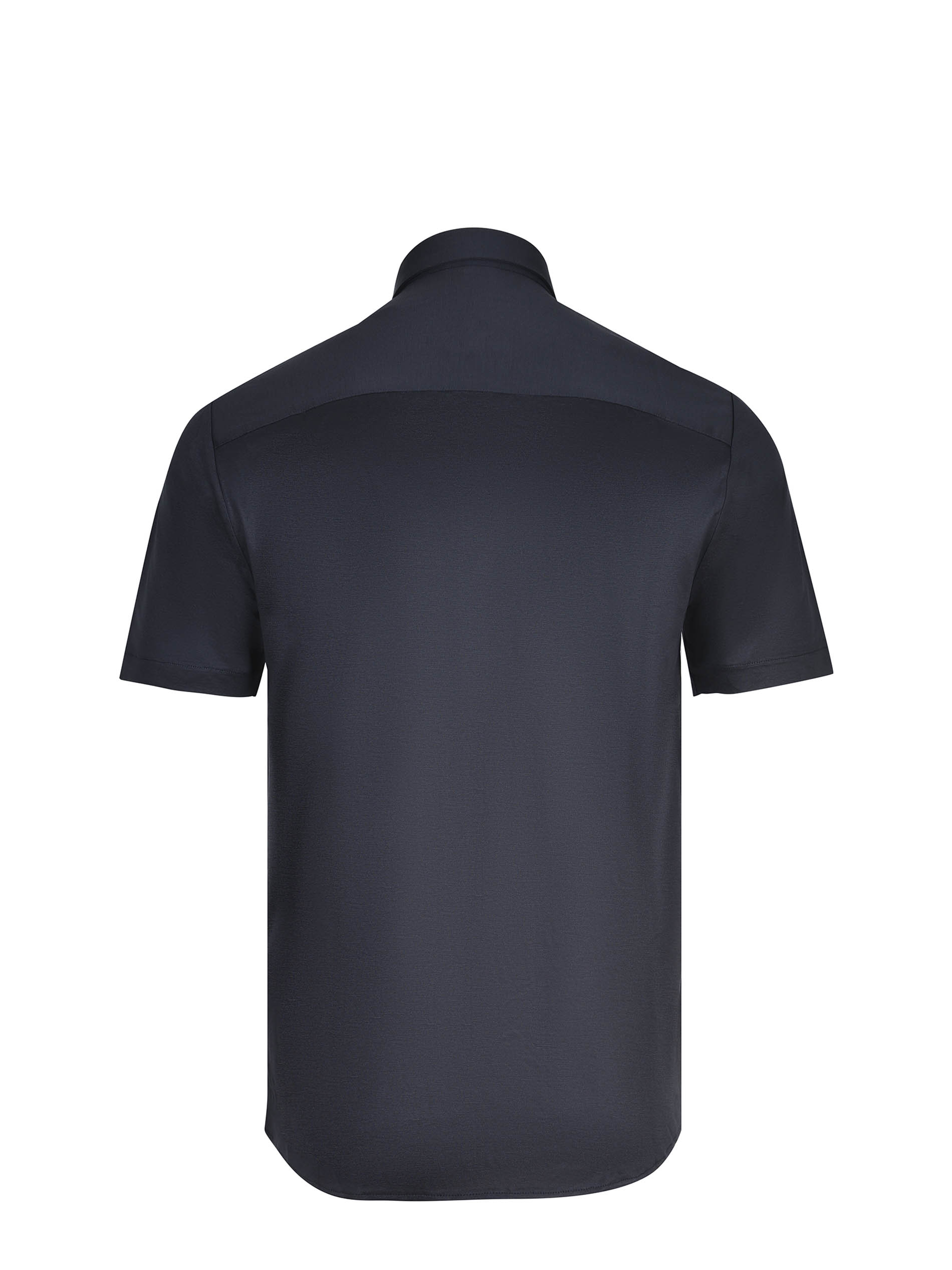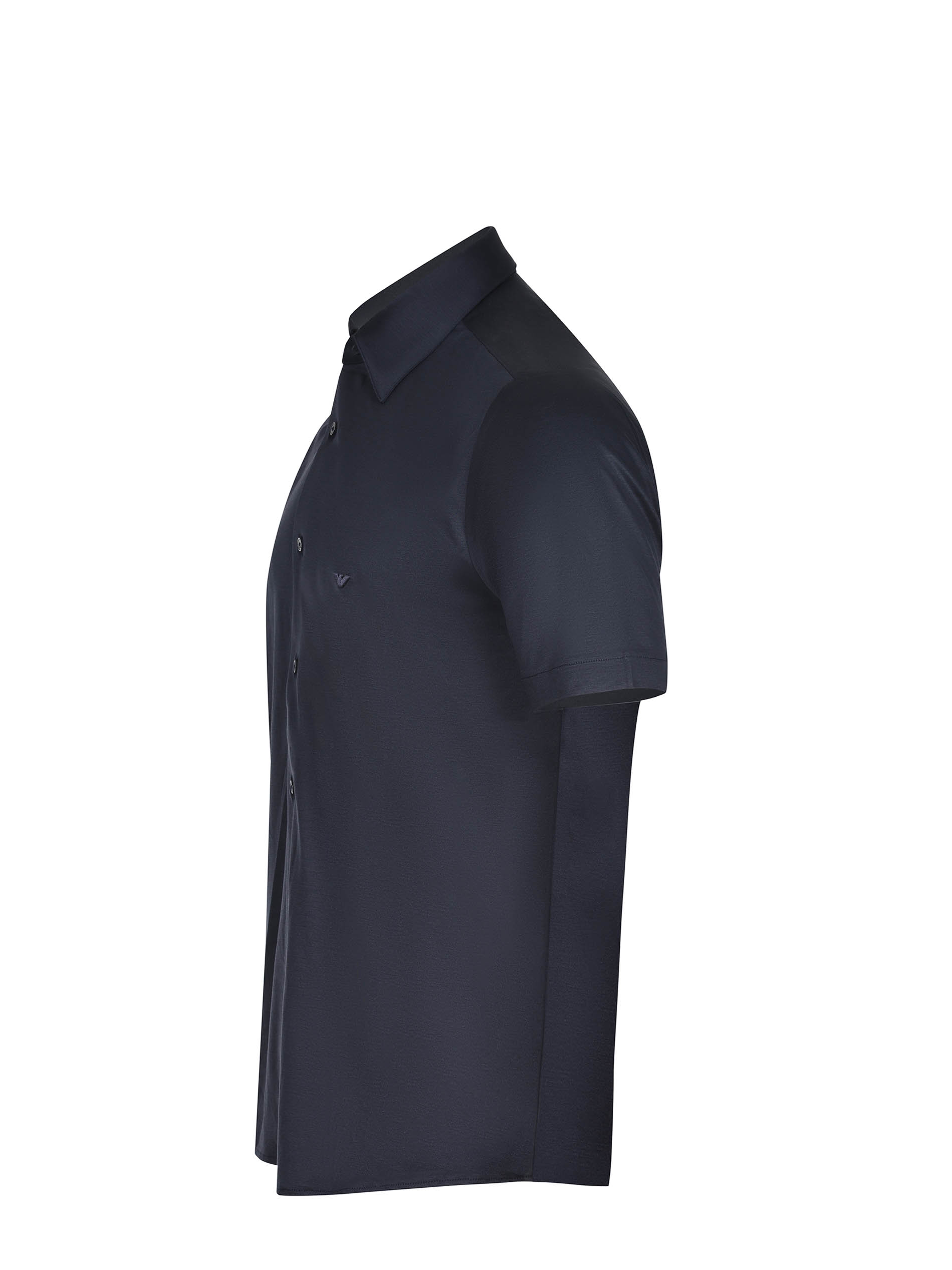 Emporio Armani shirt made of blue night cotton blend. Classic collar. Front button closure. Short sleeves. Tone-on-tone embroidered logo monogram on the chest. 70% lyocell, 30% cotton.