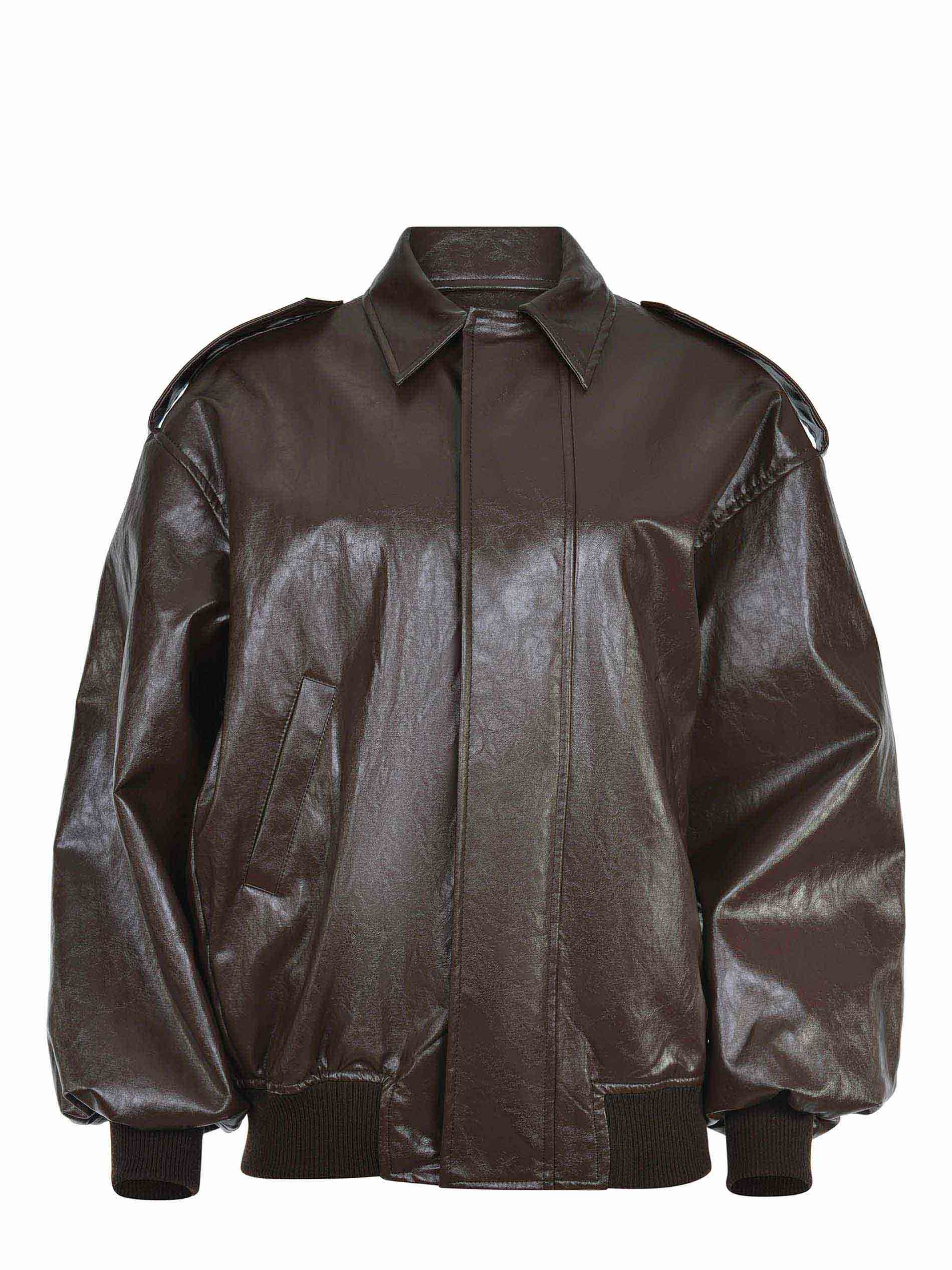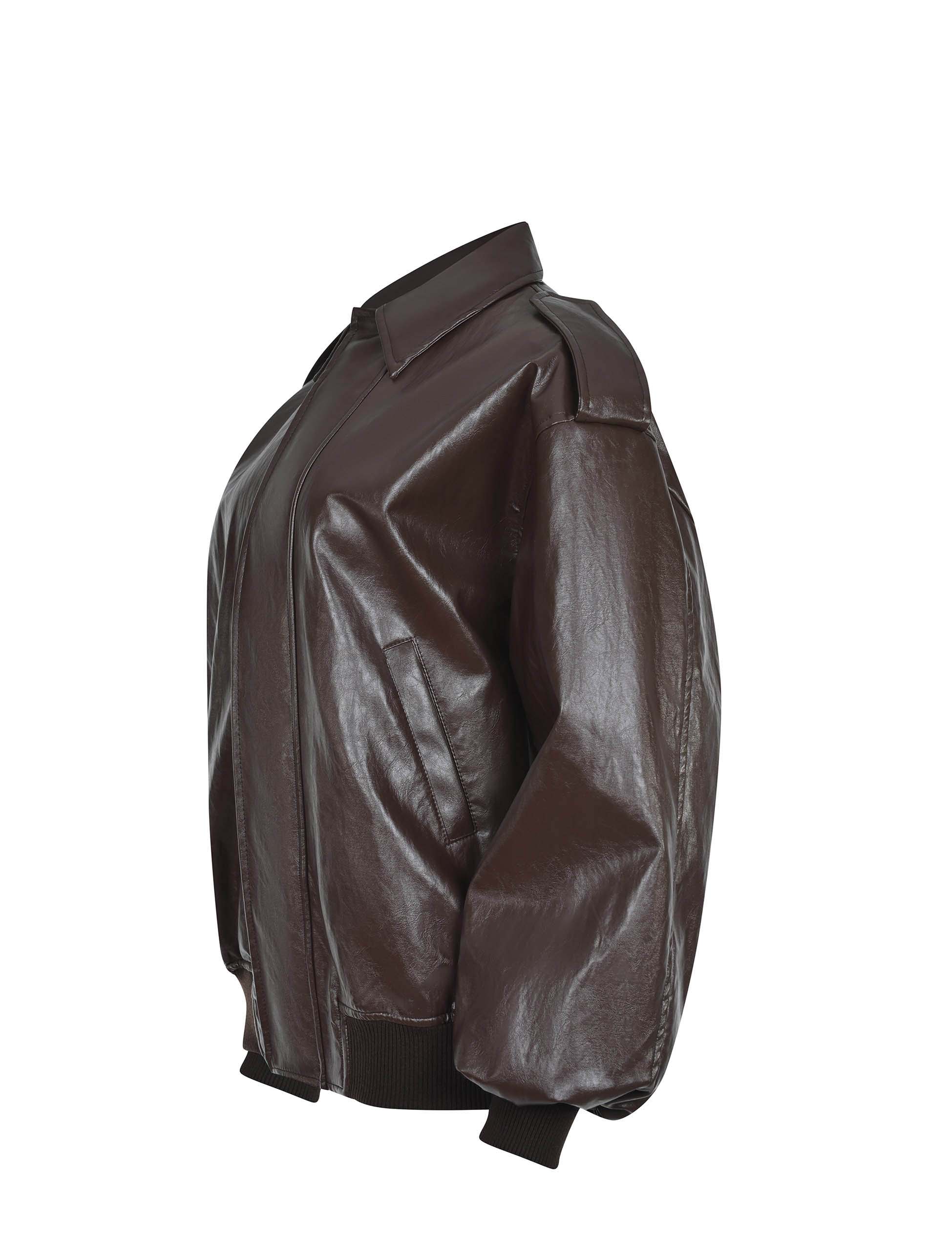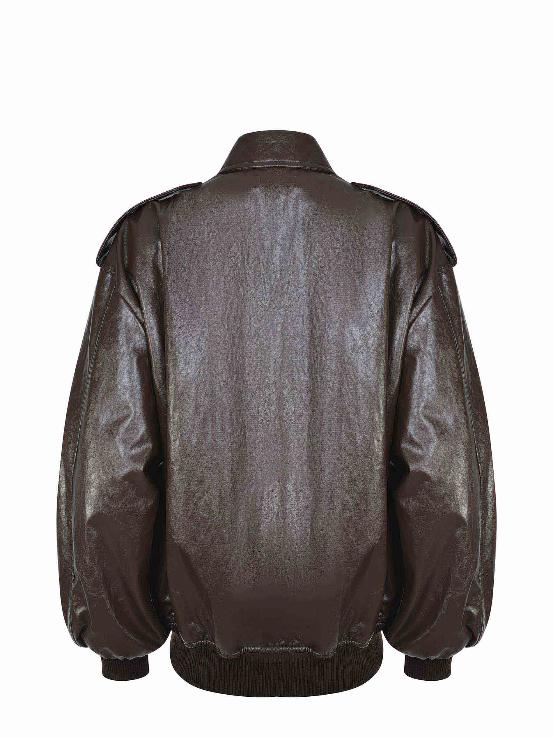 Federica Tosi bomber jacket made of brown leather. Shirt collar. Closure with zipper concealed by a flap. Long sleeves. Ribbed fabric cuffs. Side pockets. Ribbed hem. 70% polyurethane, 21% viscose, 4% polyester, 3% cotton, 2% metal Made in Italy
