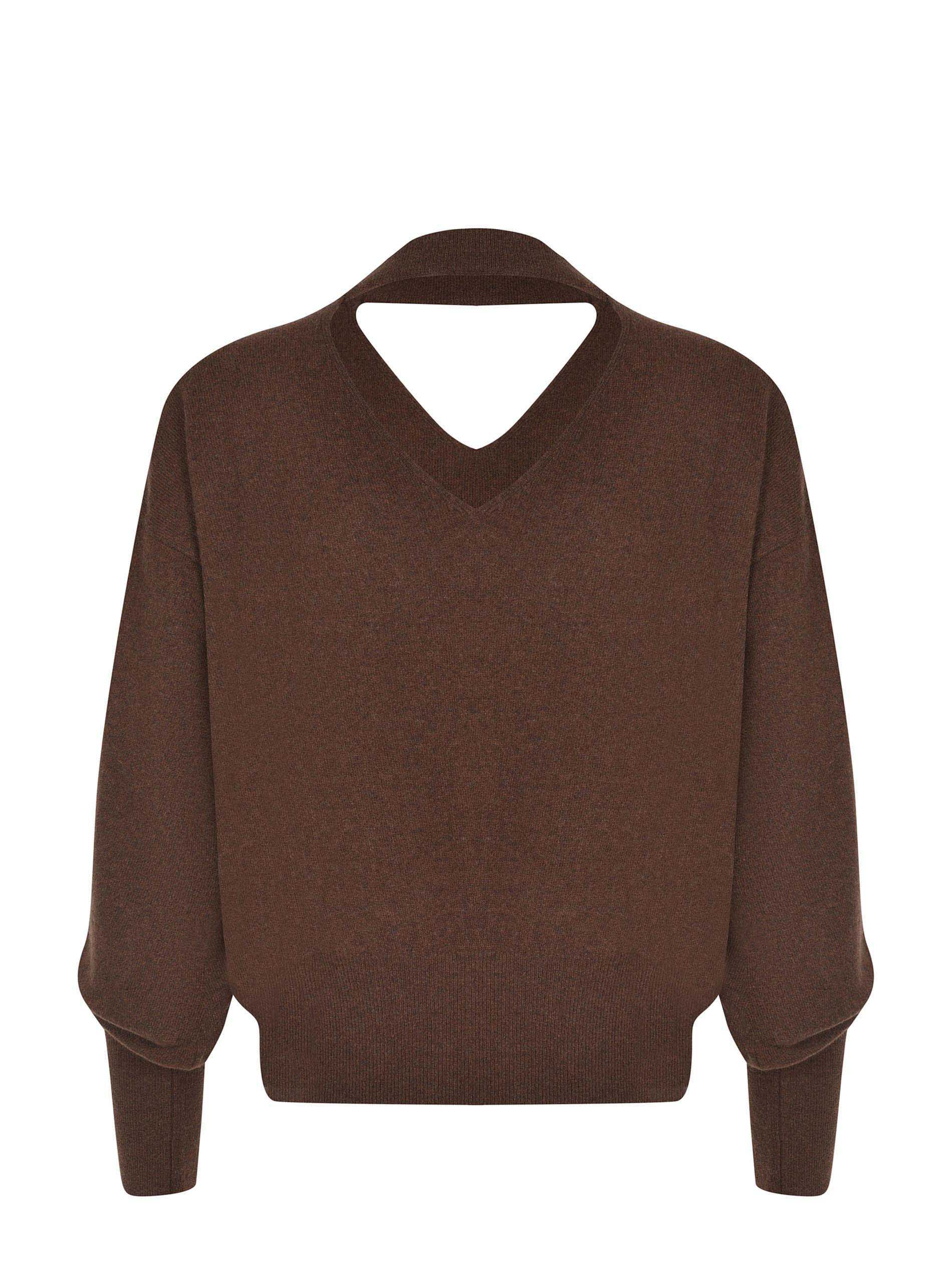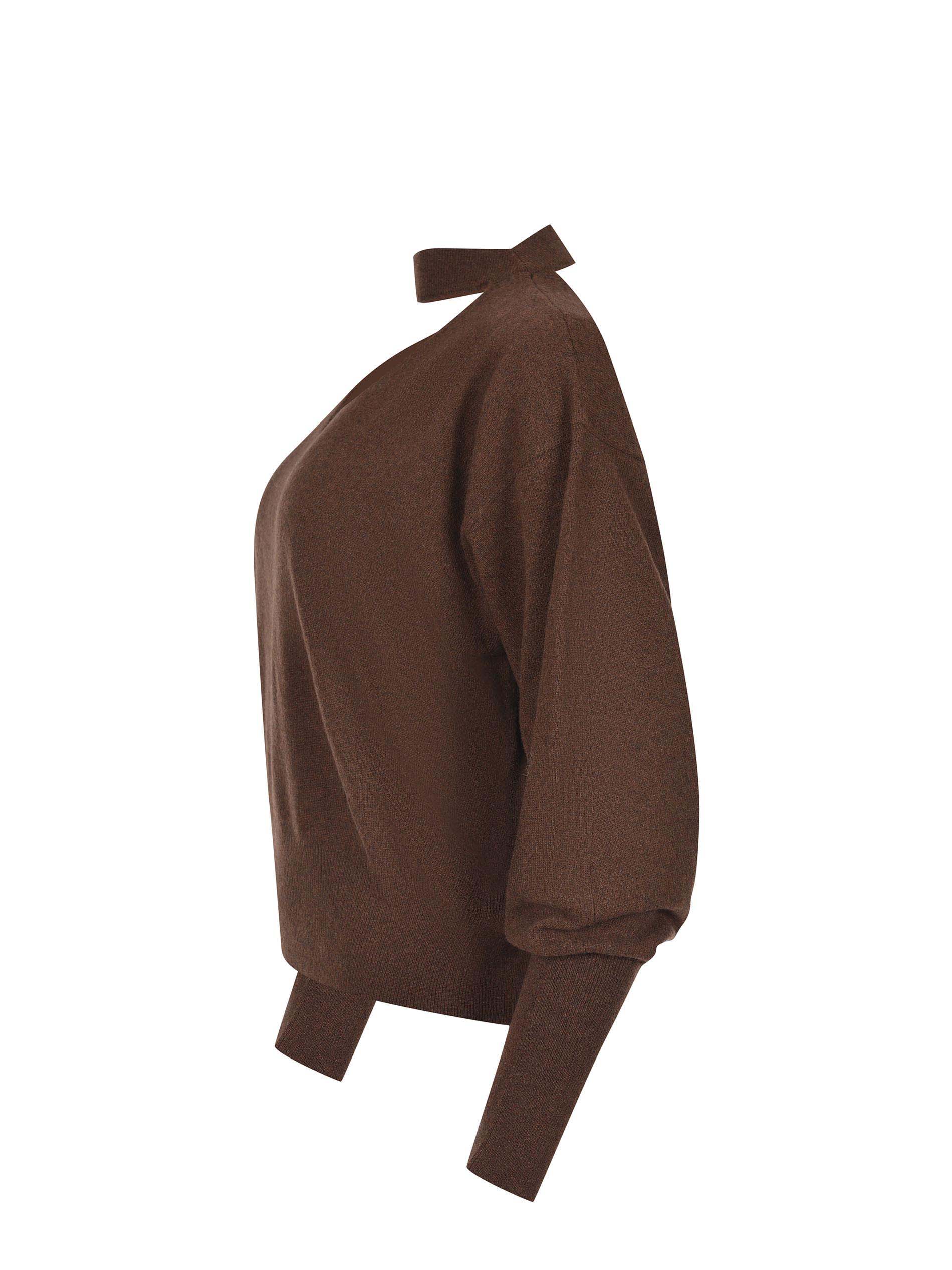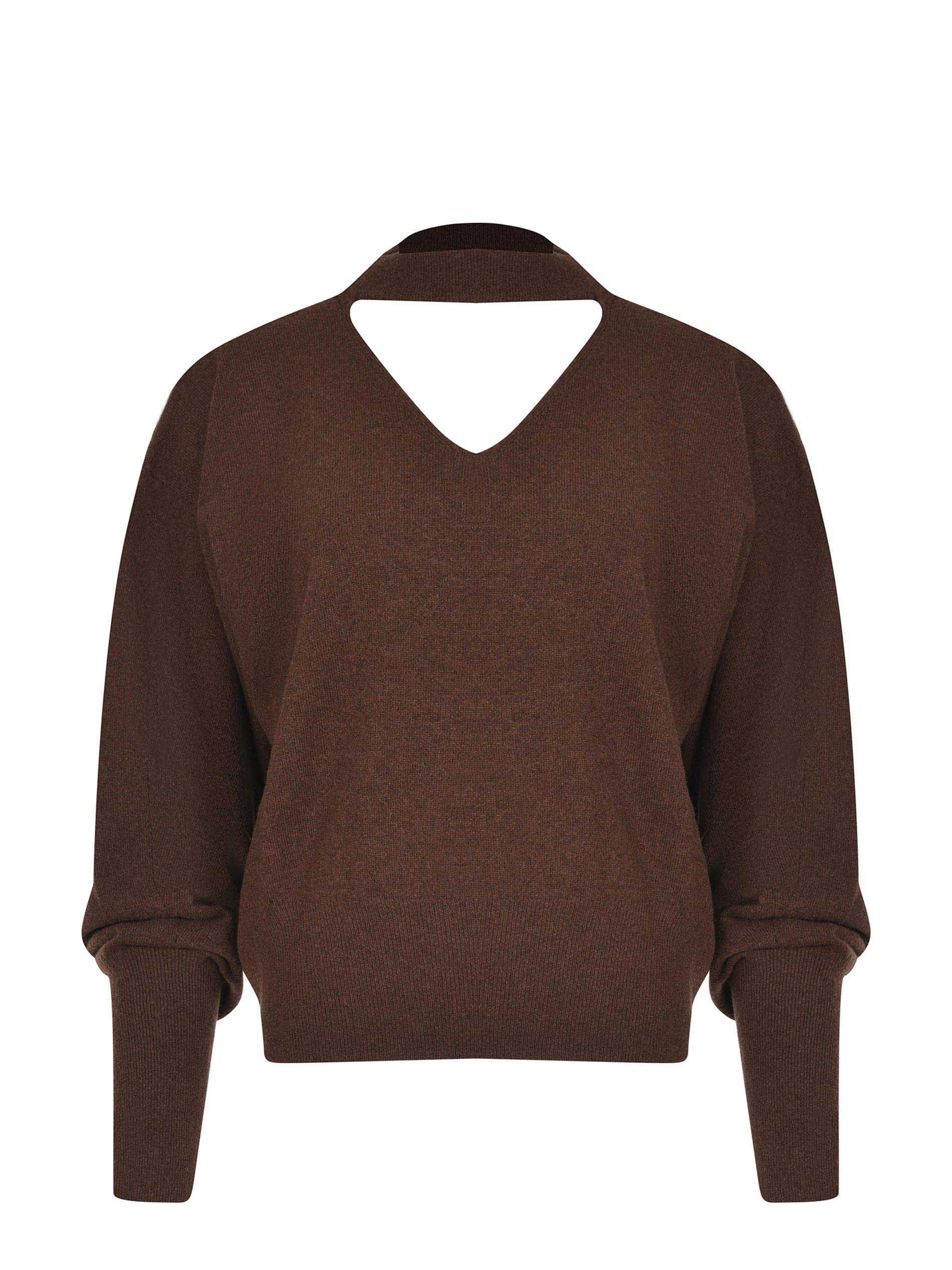 Federica Tosi sweater made of a wool and cashmere blend in brown. Ribbed crew neck. Cut-out on the chest and back. Long sleeves. Ribbed hem. 70% wool, 30% cashmere. Made in Italy