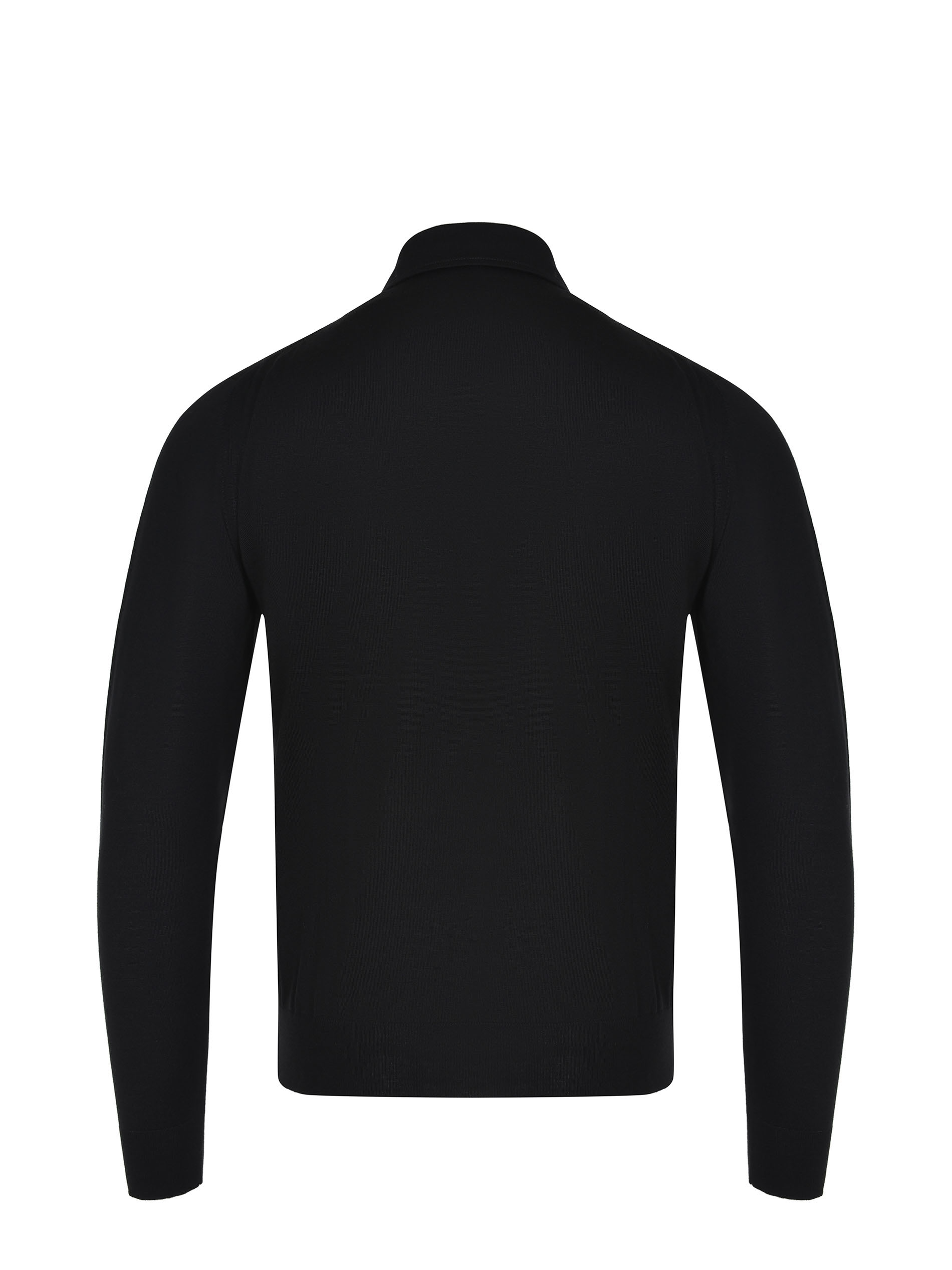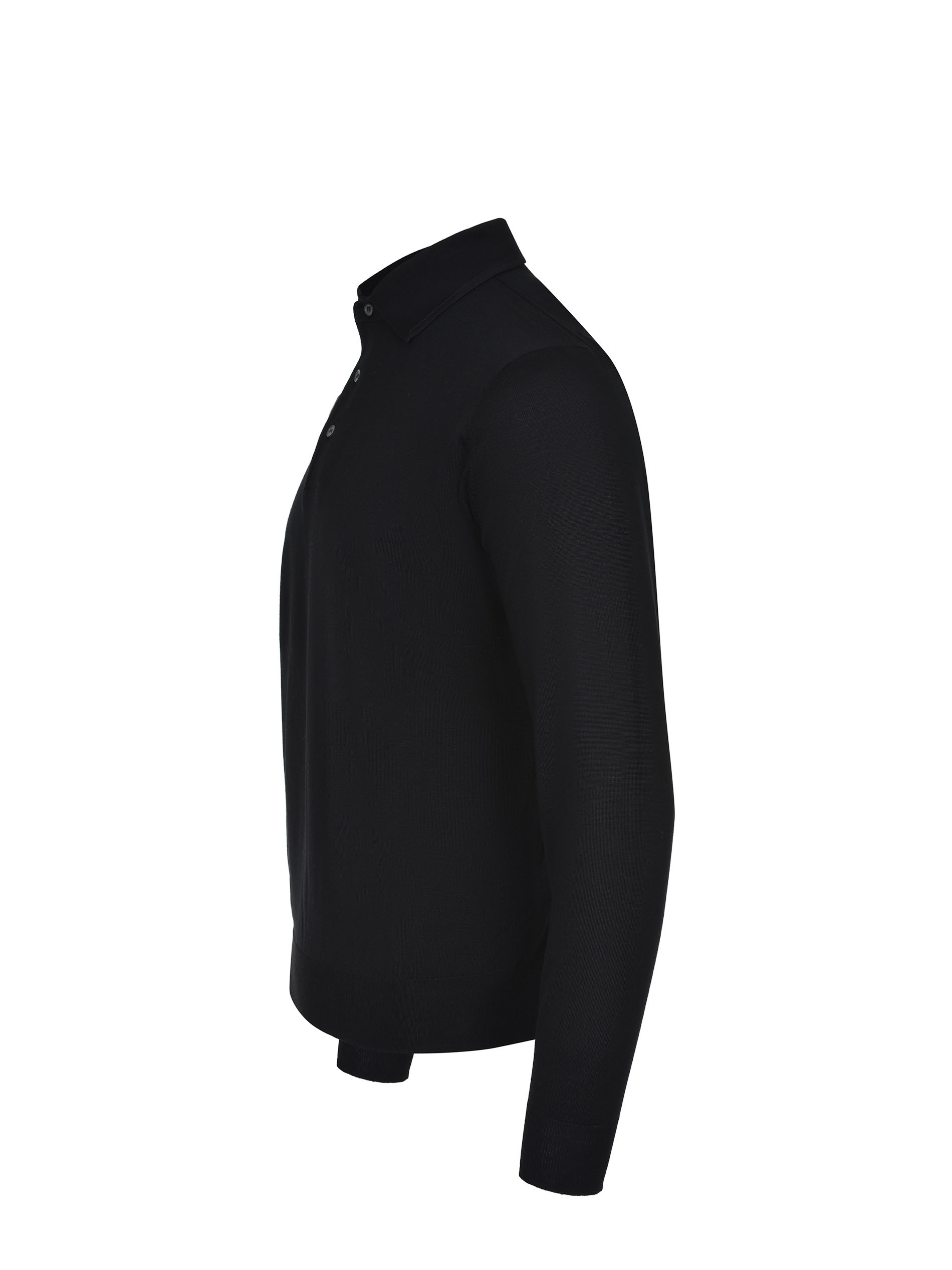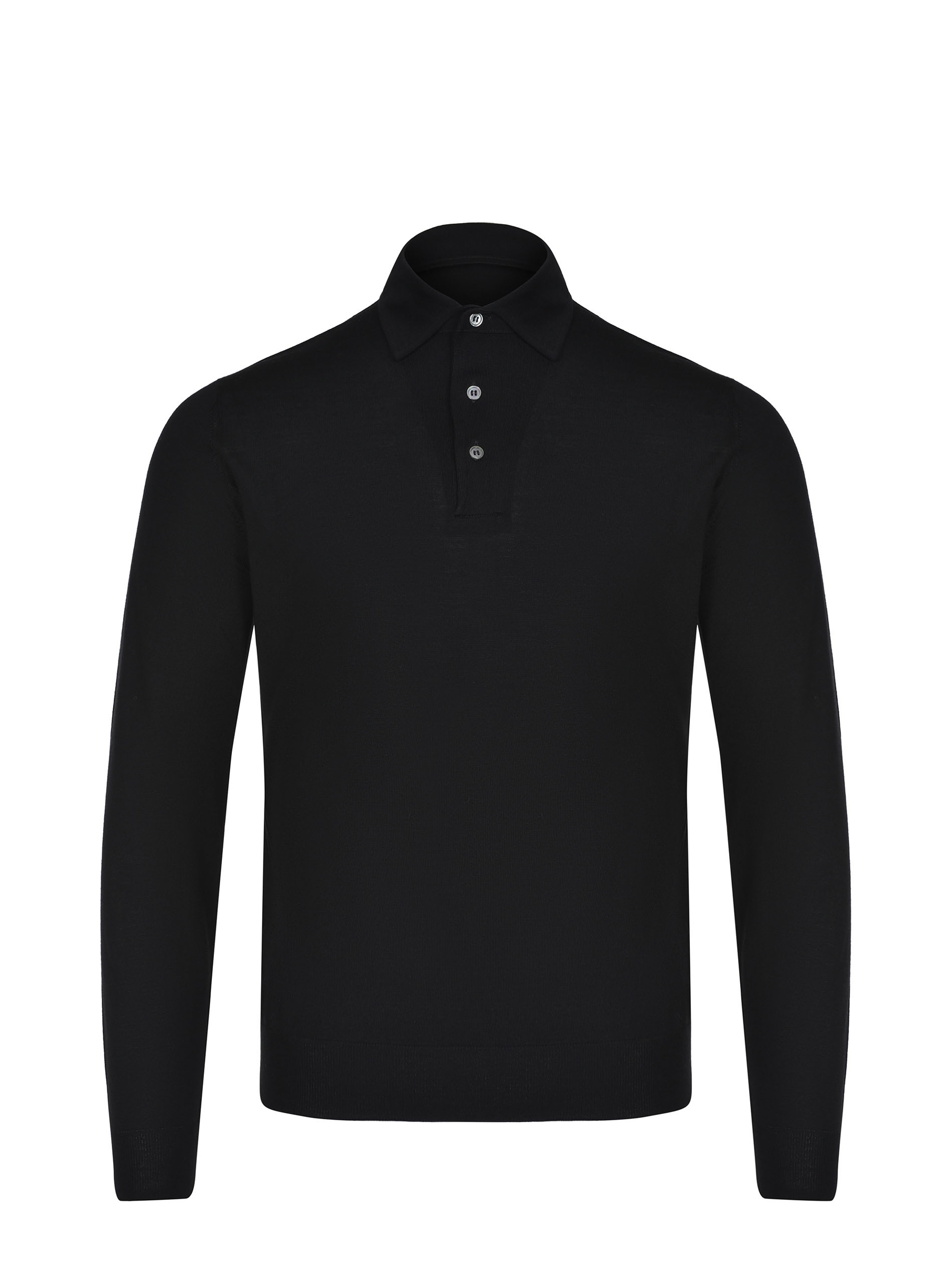 Polo by Filippo De Laurentis made of black wool. Classic collar. Three buttons on the chest. Long sleeves. Ribbed cuffs and hem. 100% wool. Made in Italy