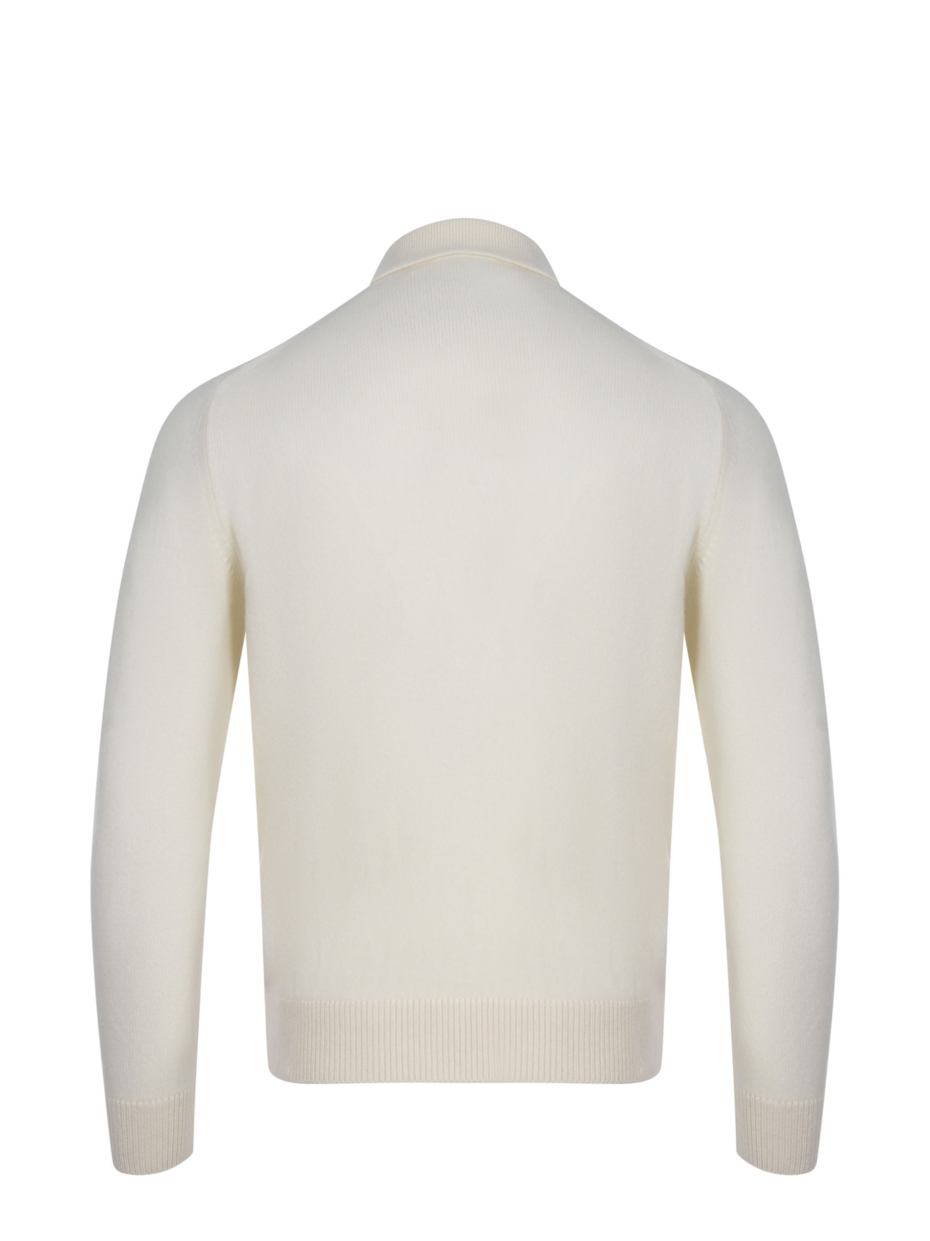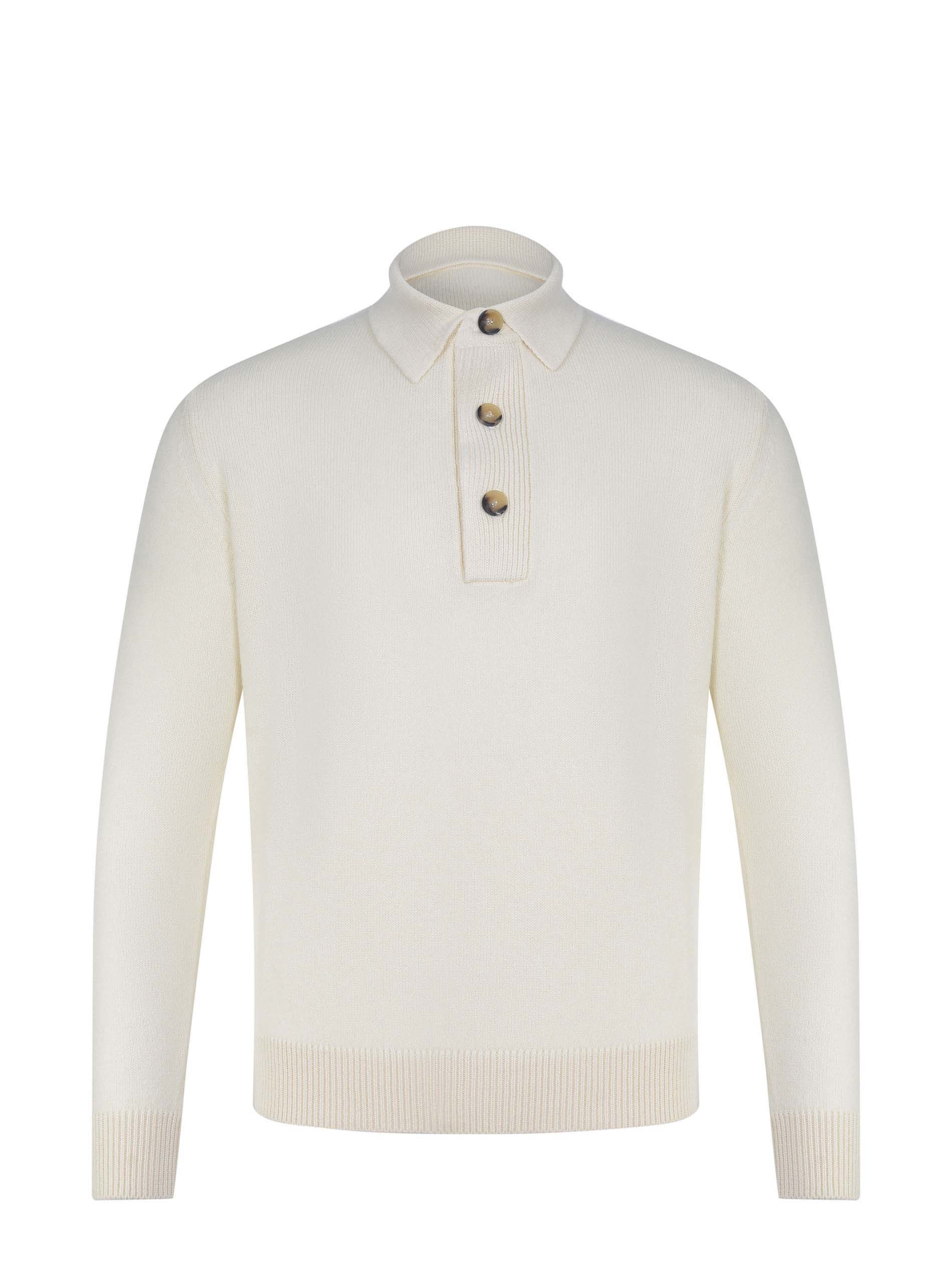 Polo by Filippo De Laurentis made from a wool and cashmere blend in Cream color. Classic collar. Three buttons on the chest. Long sleeves. Ribbed cuffs and hem. 90% merino wool, 10% cashmere. Made in Italy.