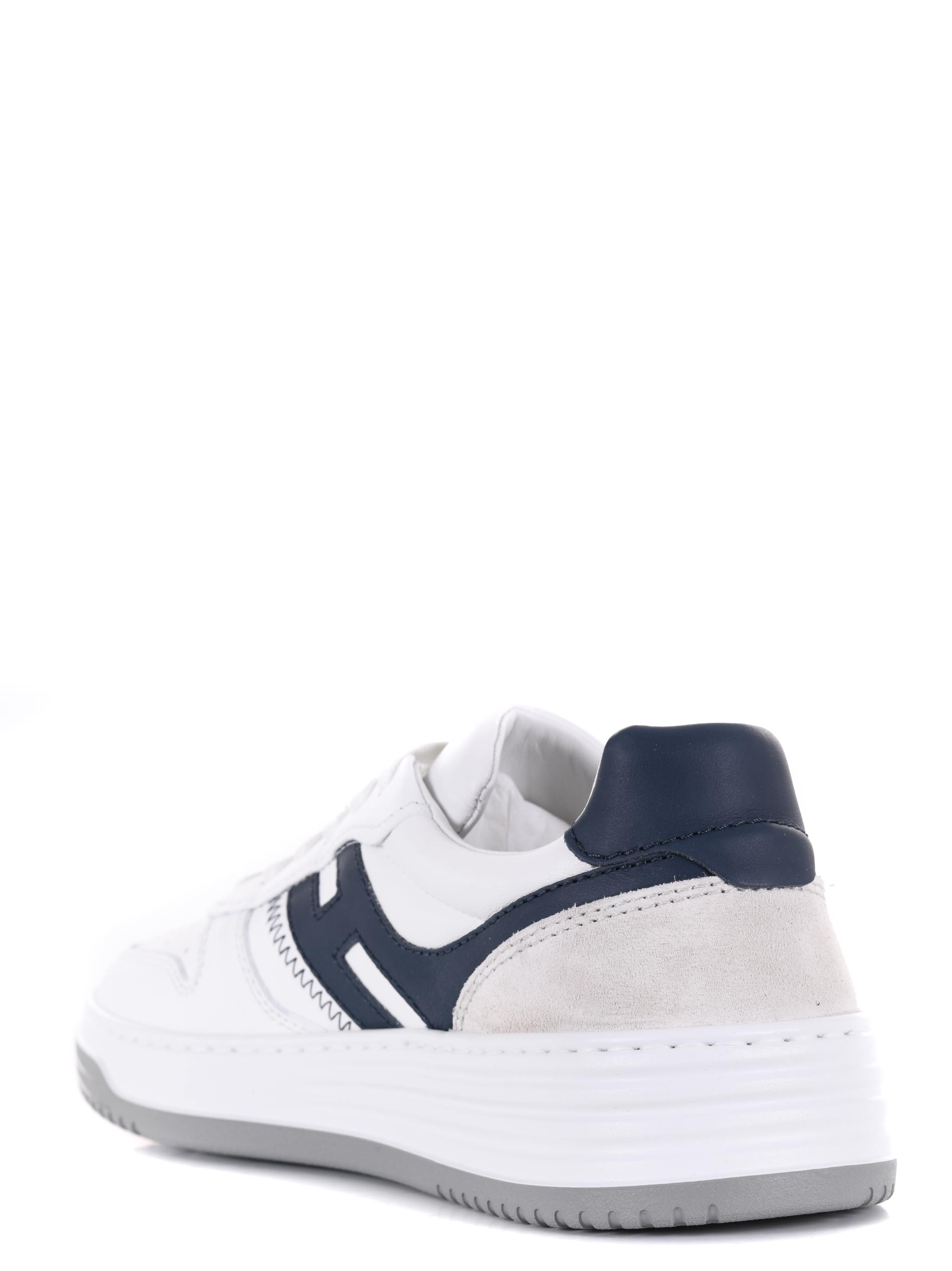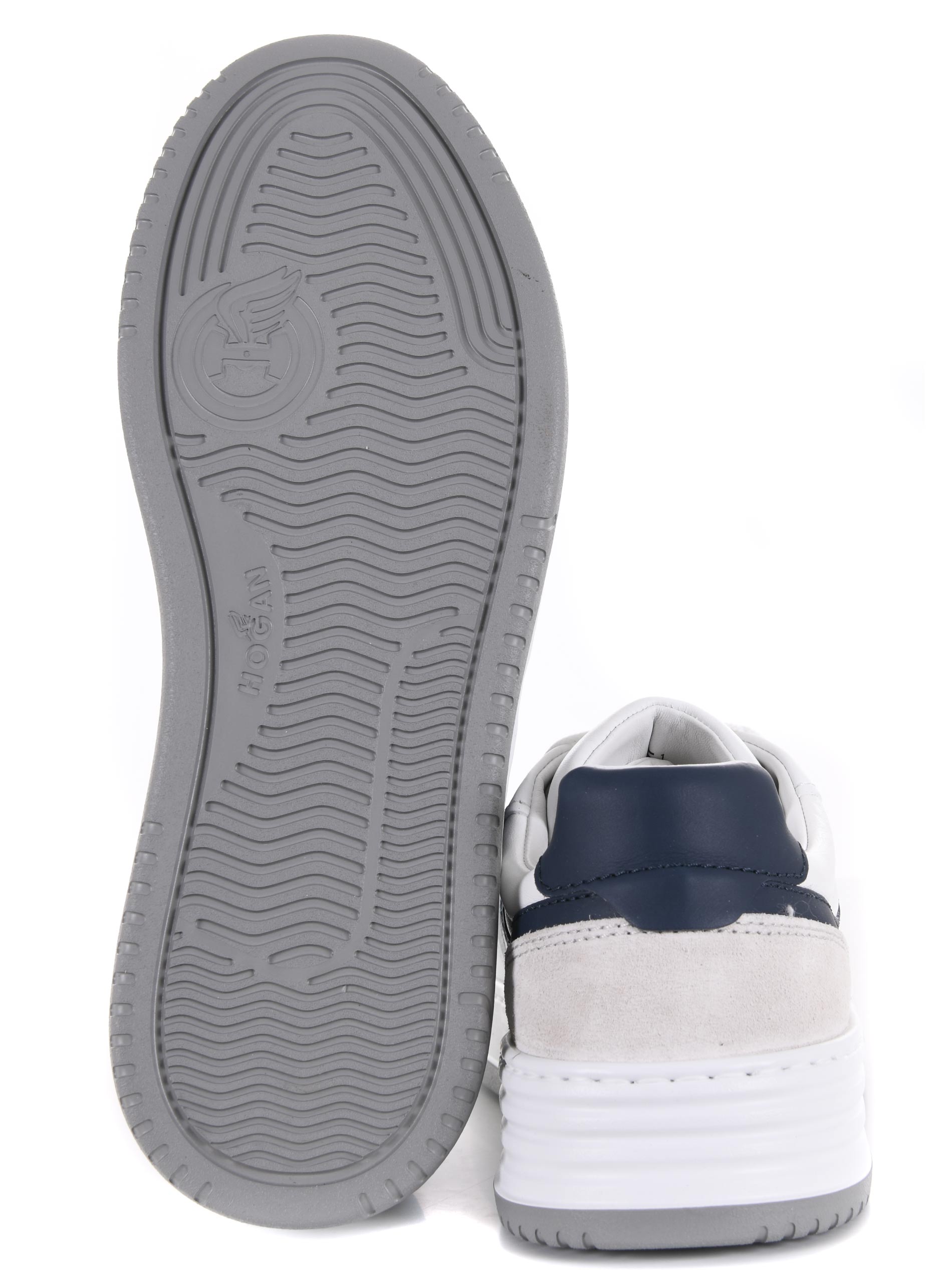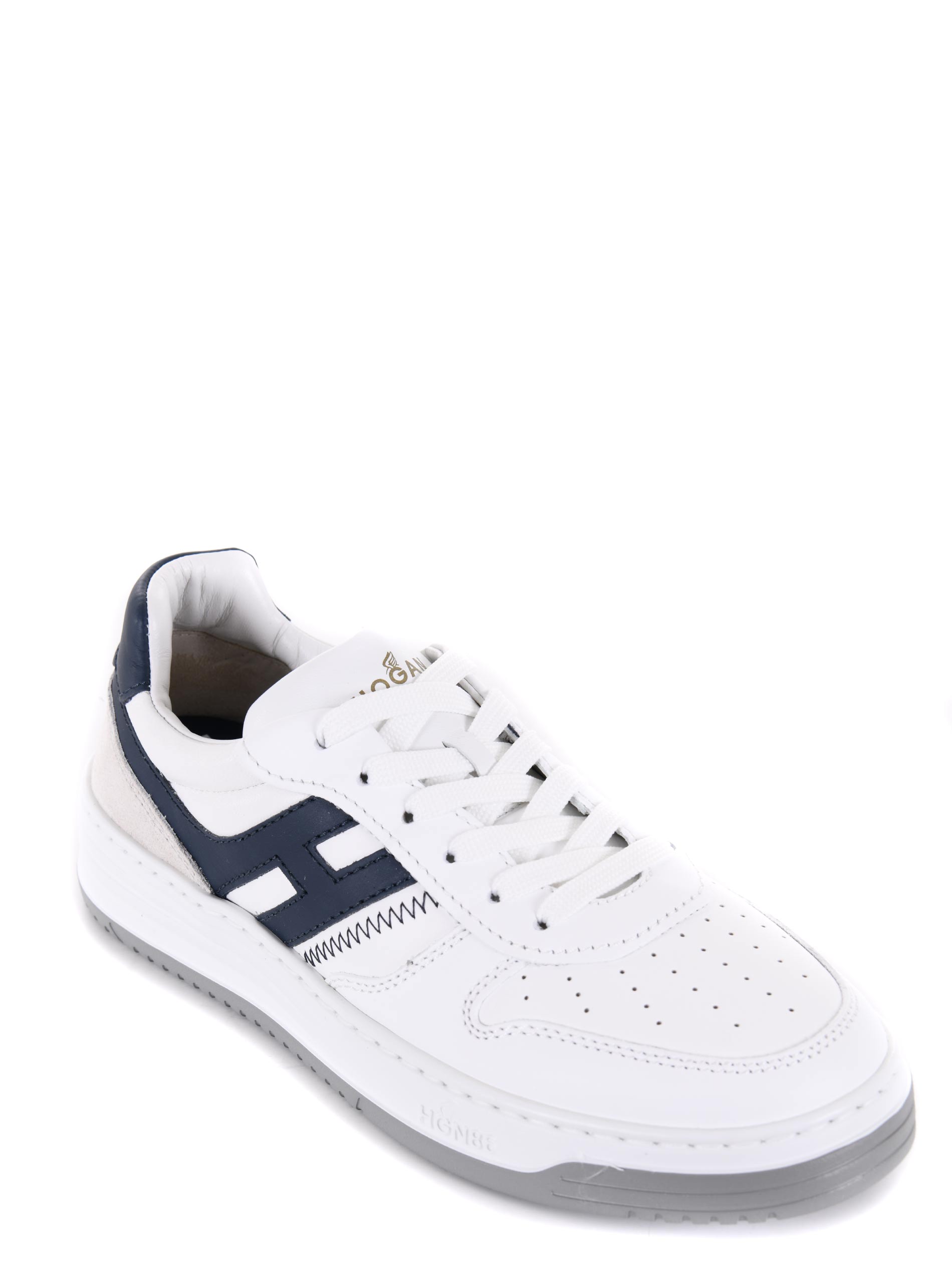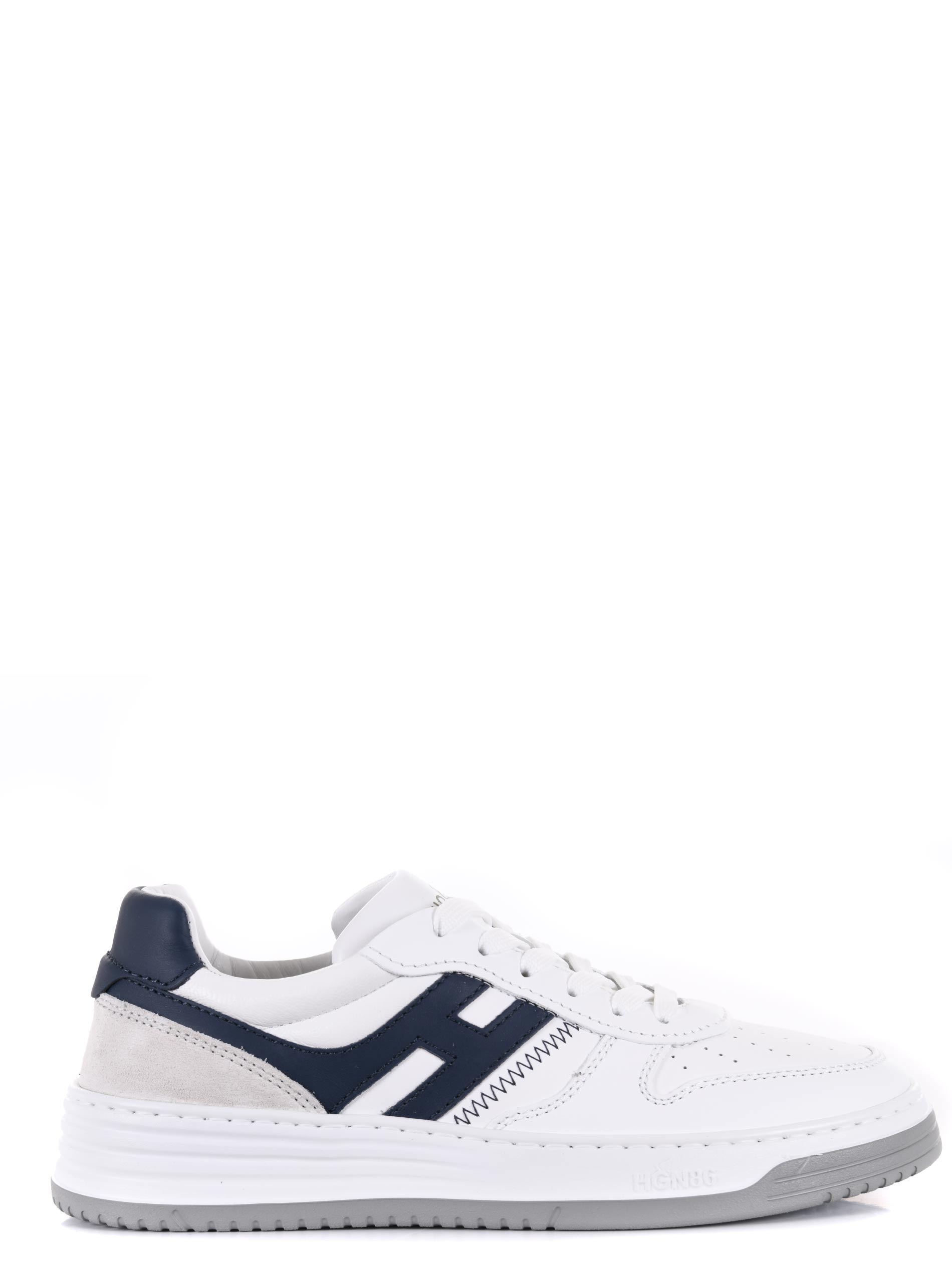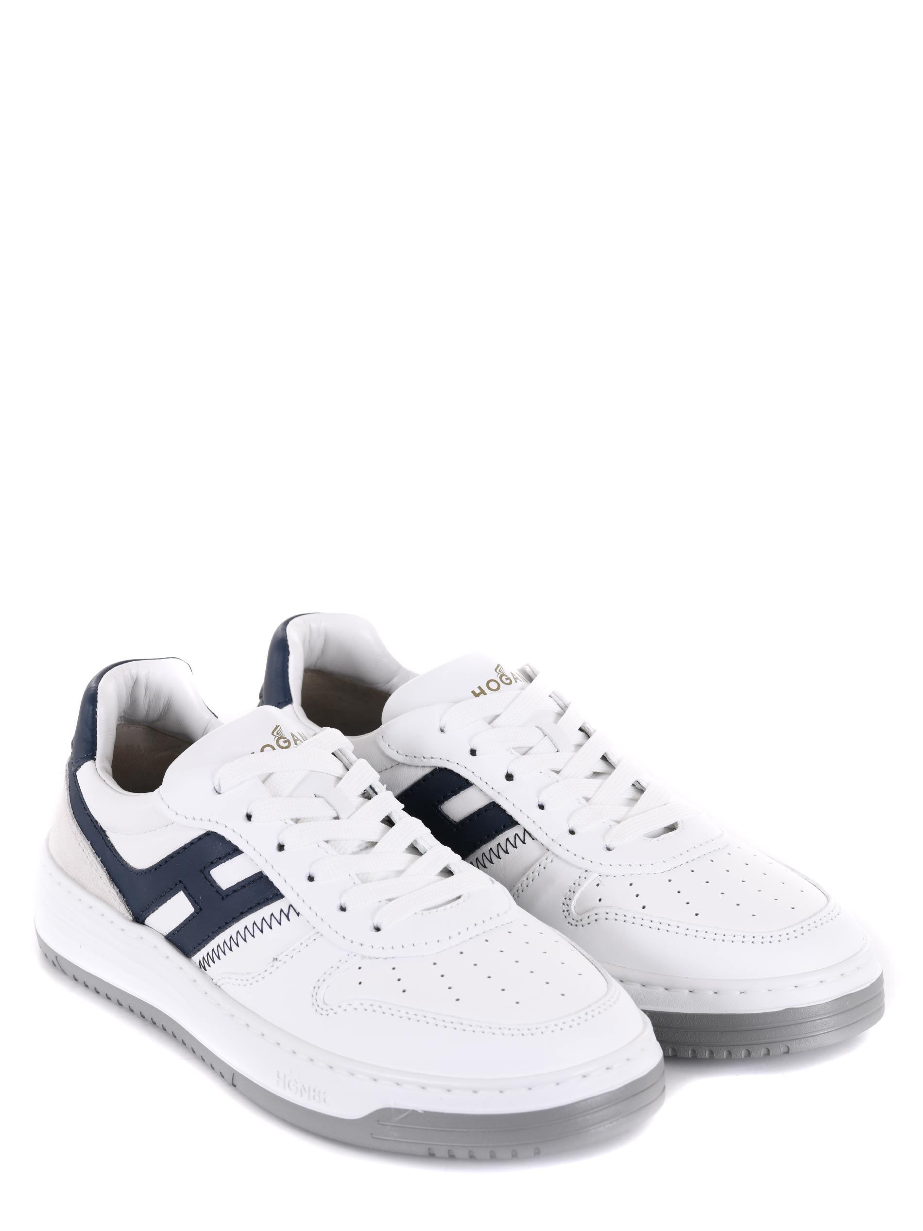 White leather Hogan "H630" sneakers. Suede inserts. Perforated round toe. "Hogan" logo lettering on the tongue. Stinged. Side "H" logo in Blue leather. Fussbett in memory foam. Rubber sole. "HGN86" logo embossed on the rubber.