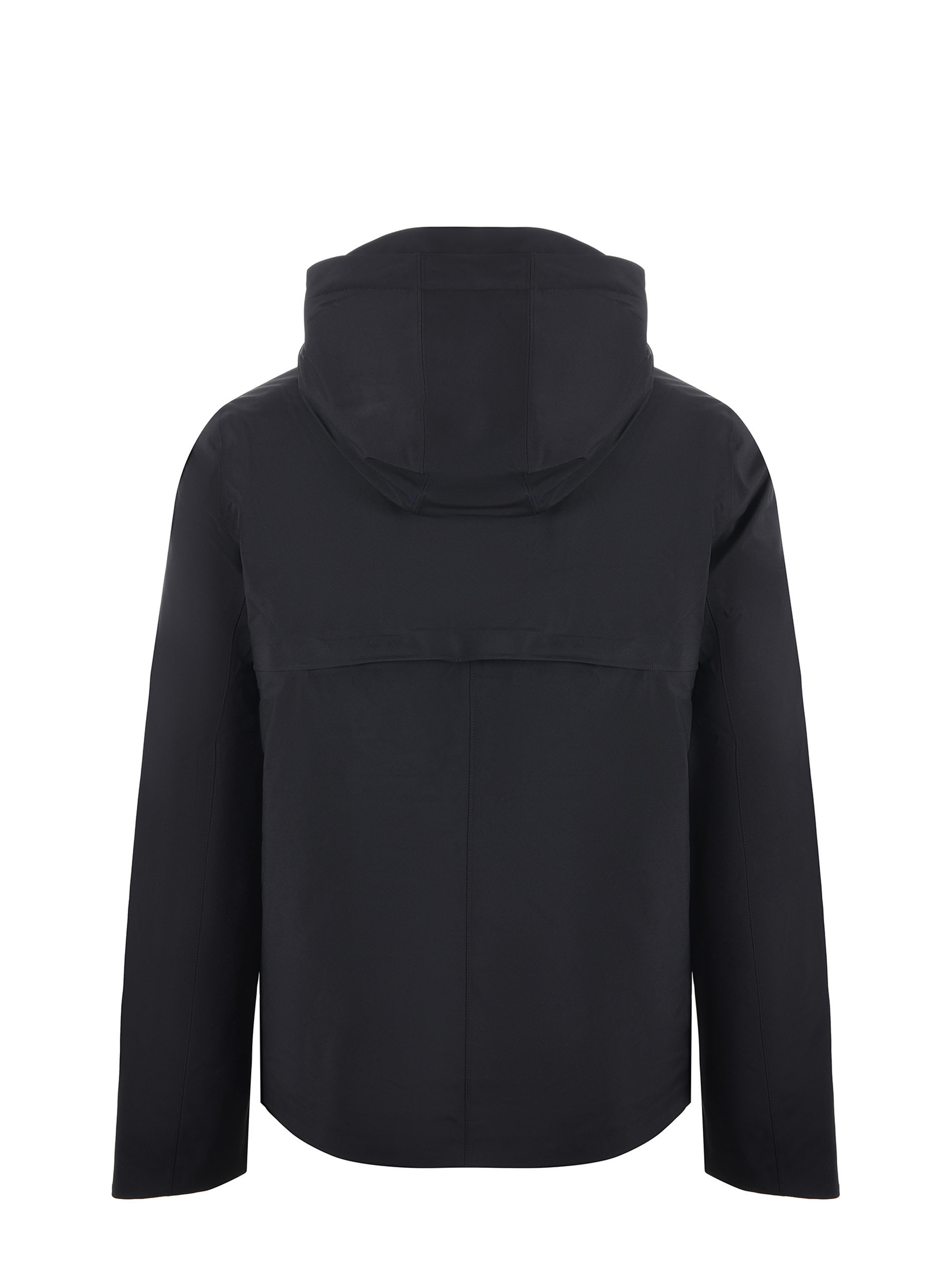 K-Way 3-layer nylon jacket Dark blue. Lined with padded quilting in wadding. Hood with drawstring and visibility. Windproof flap on the back. Inserted pockets. Internal pockets. Drawstring at the bottom. Double slider zip closure and snap buttons.