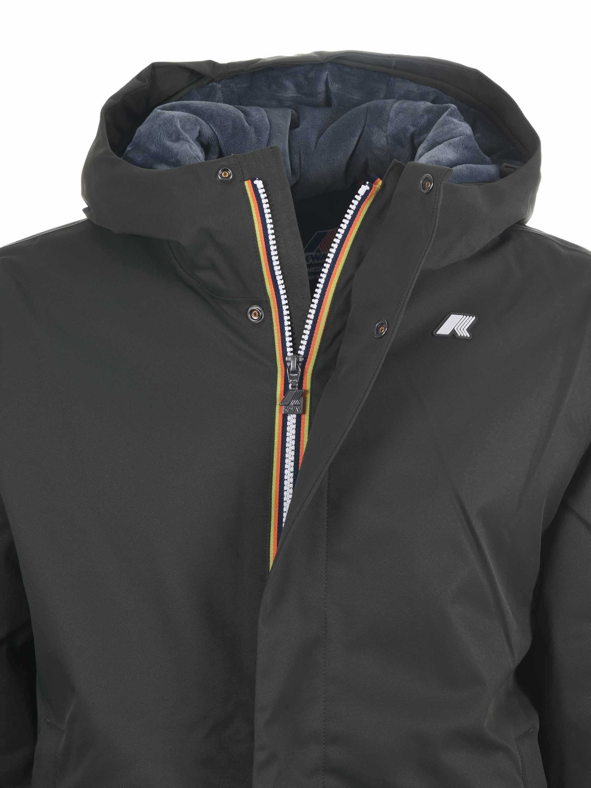 K-Way nylon twill jacket. Primaloft padded. Drawstring hood. Zip and snap button closure with flap. Side pockets. "Marmotta" fleece lining. Inside pockets. Front logo. Medium warmth.