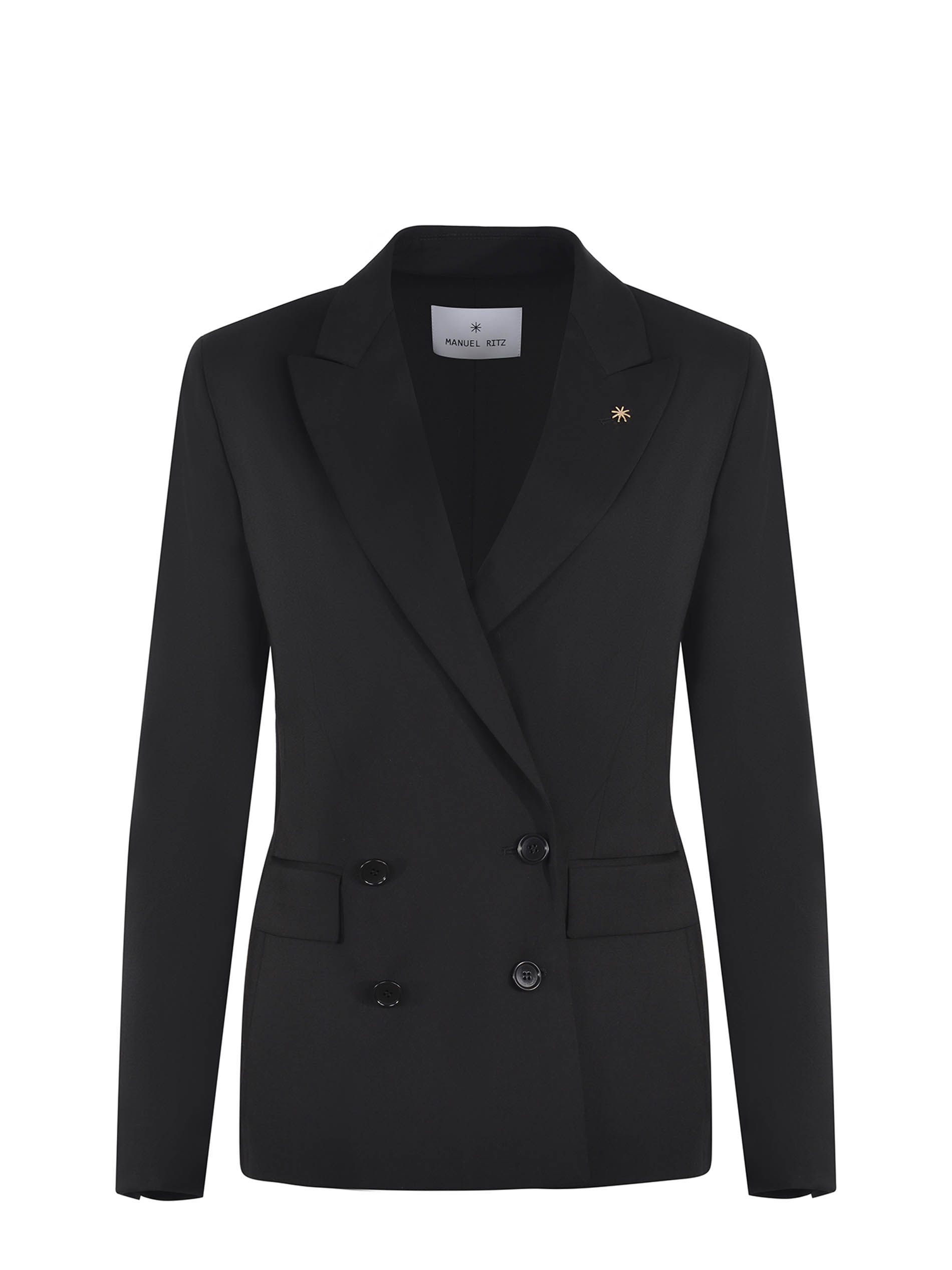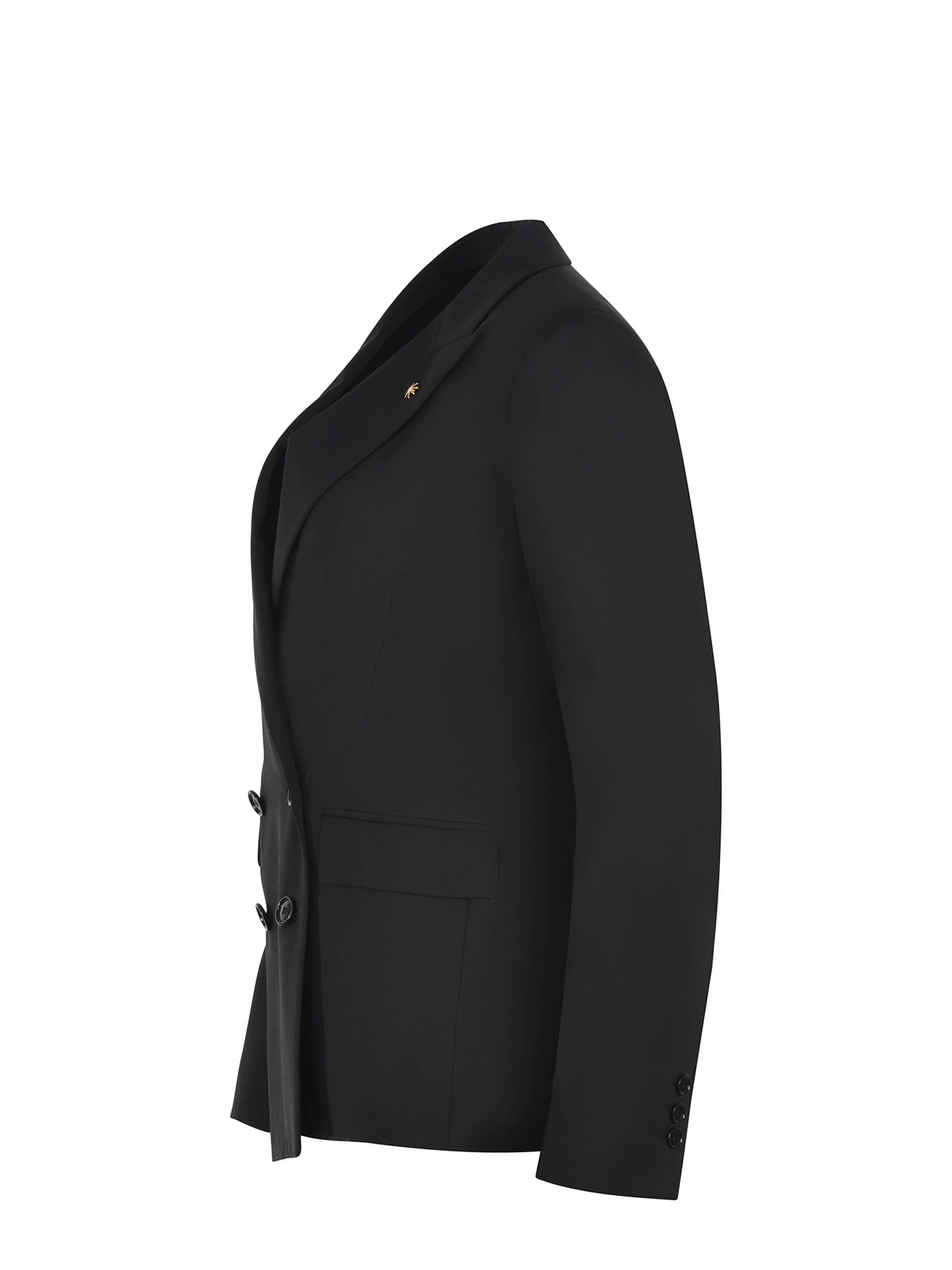 Double-breasted. Two-button closure. Two side flap pockets. Central vent on the back. Wide peak lapel.