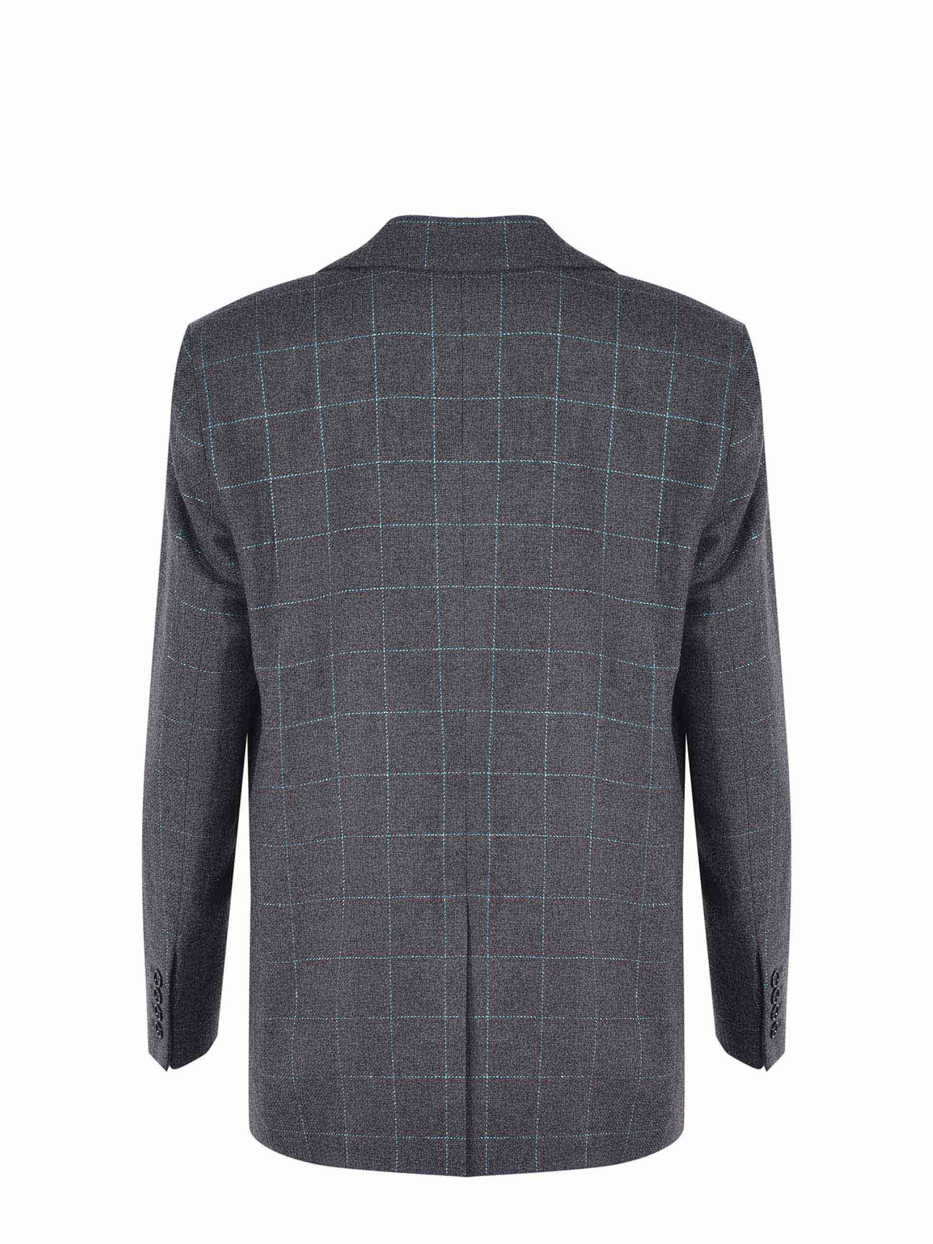 Manuel Ritz wool blend jacket in charcoal grey. Contrasting check pattern. Wide peak lapels.