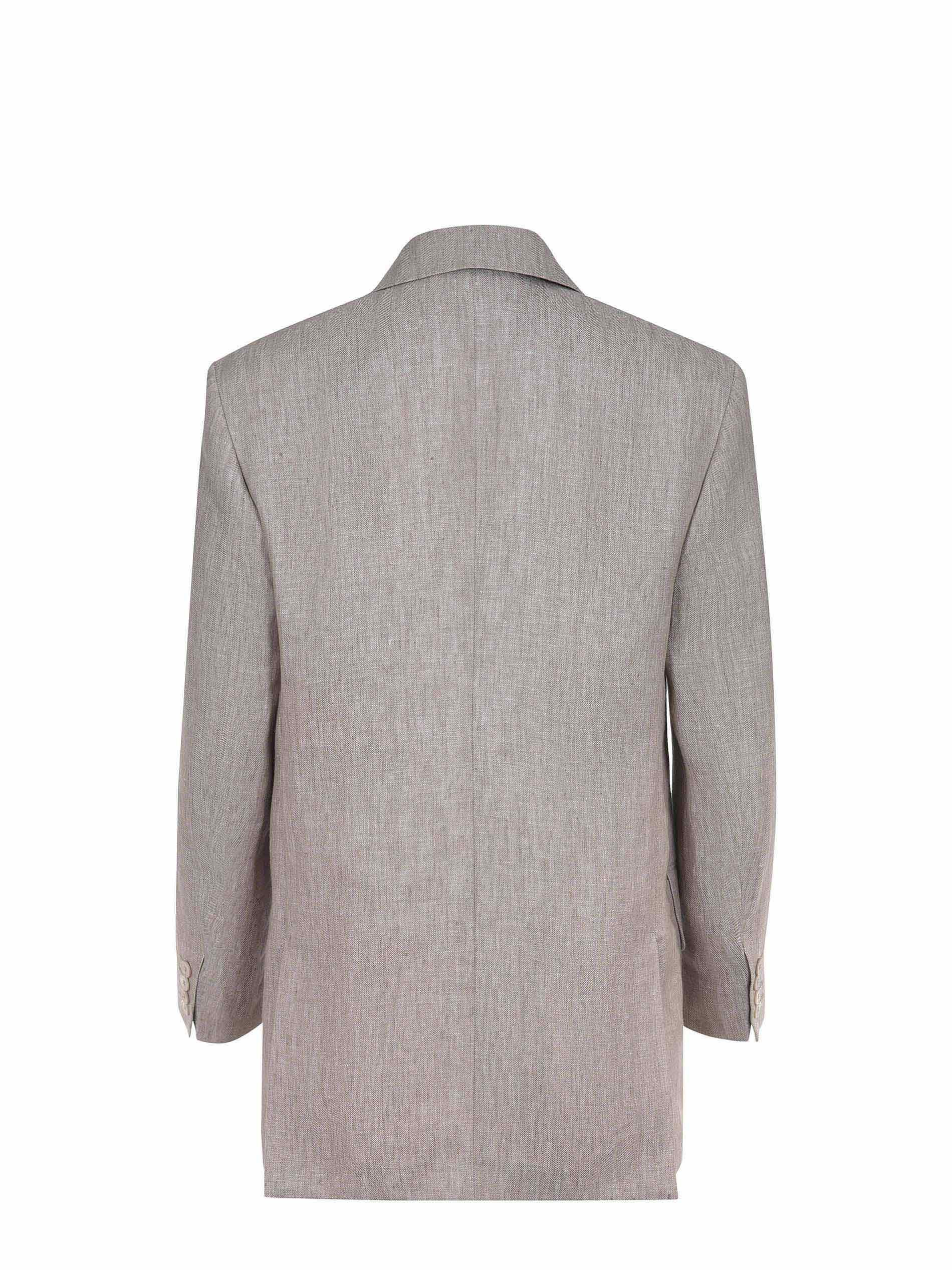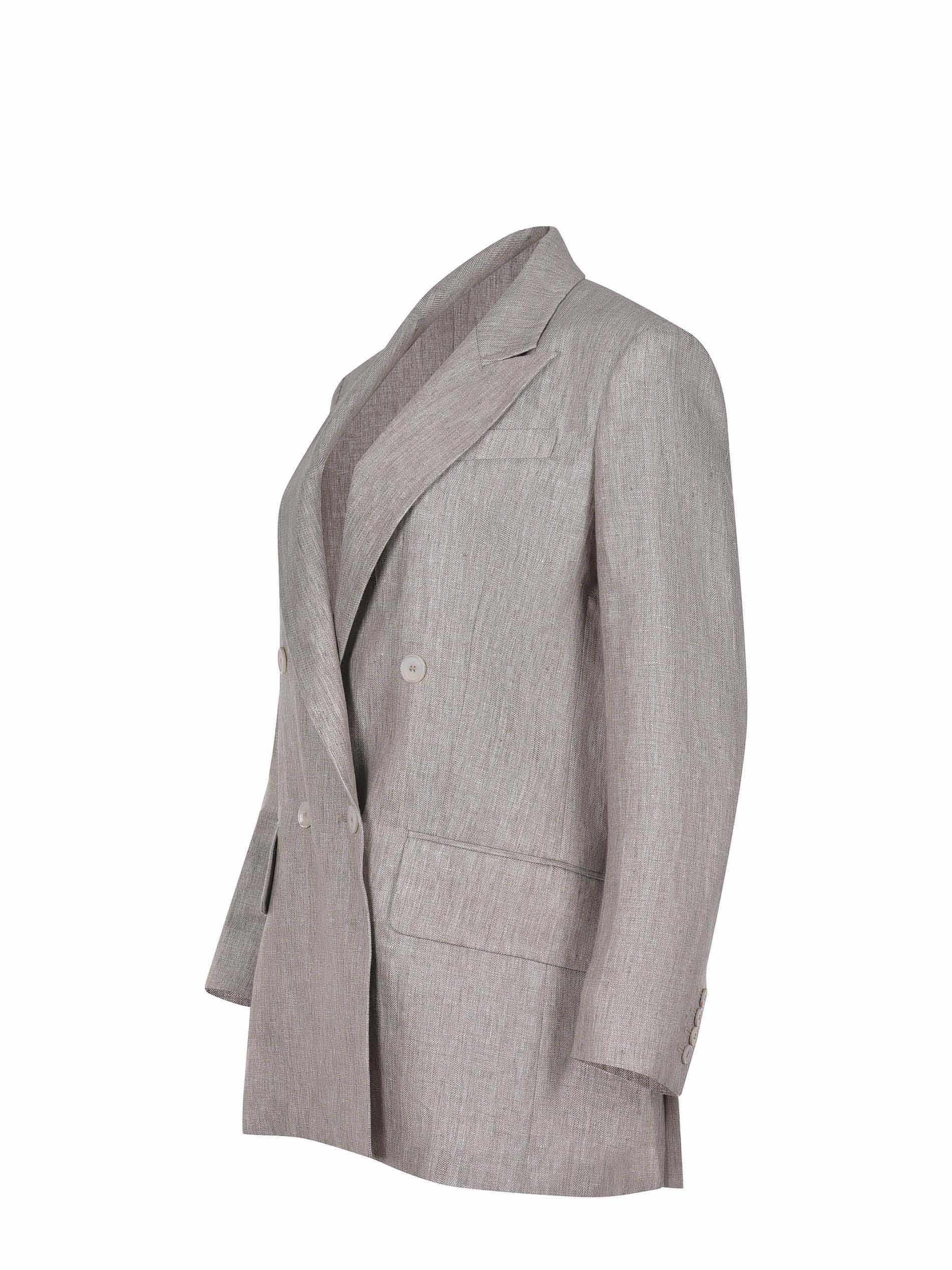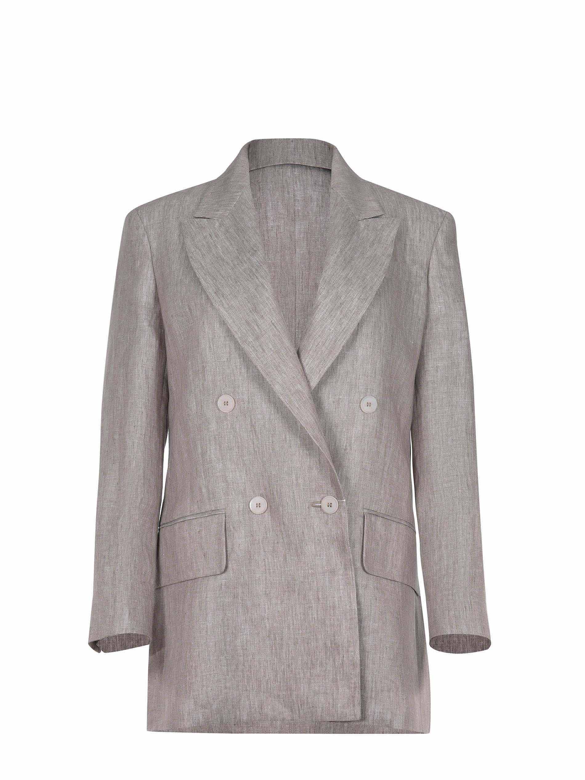 Max Mara jacket "Mxmolimpia1" made of beige linen. Double-breasted. Notched collar. Long sleeves. Cuffs with buttons. Front closure with buttons. Chest pocket. Side flap pockets. Lateral back vents. 100% linen. Made in Italy