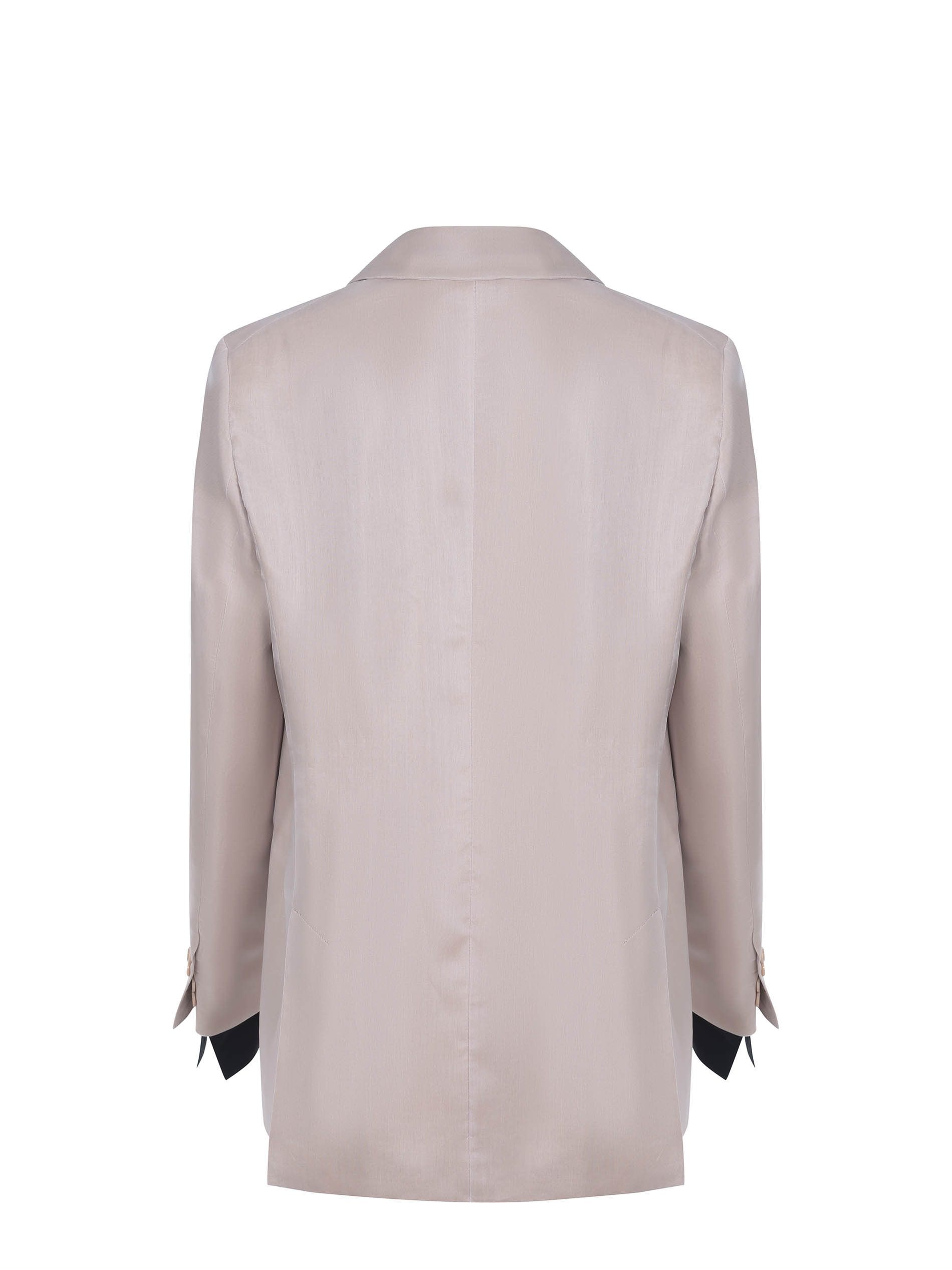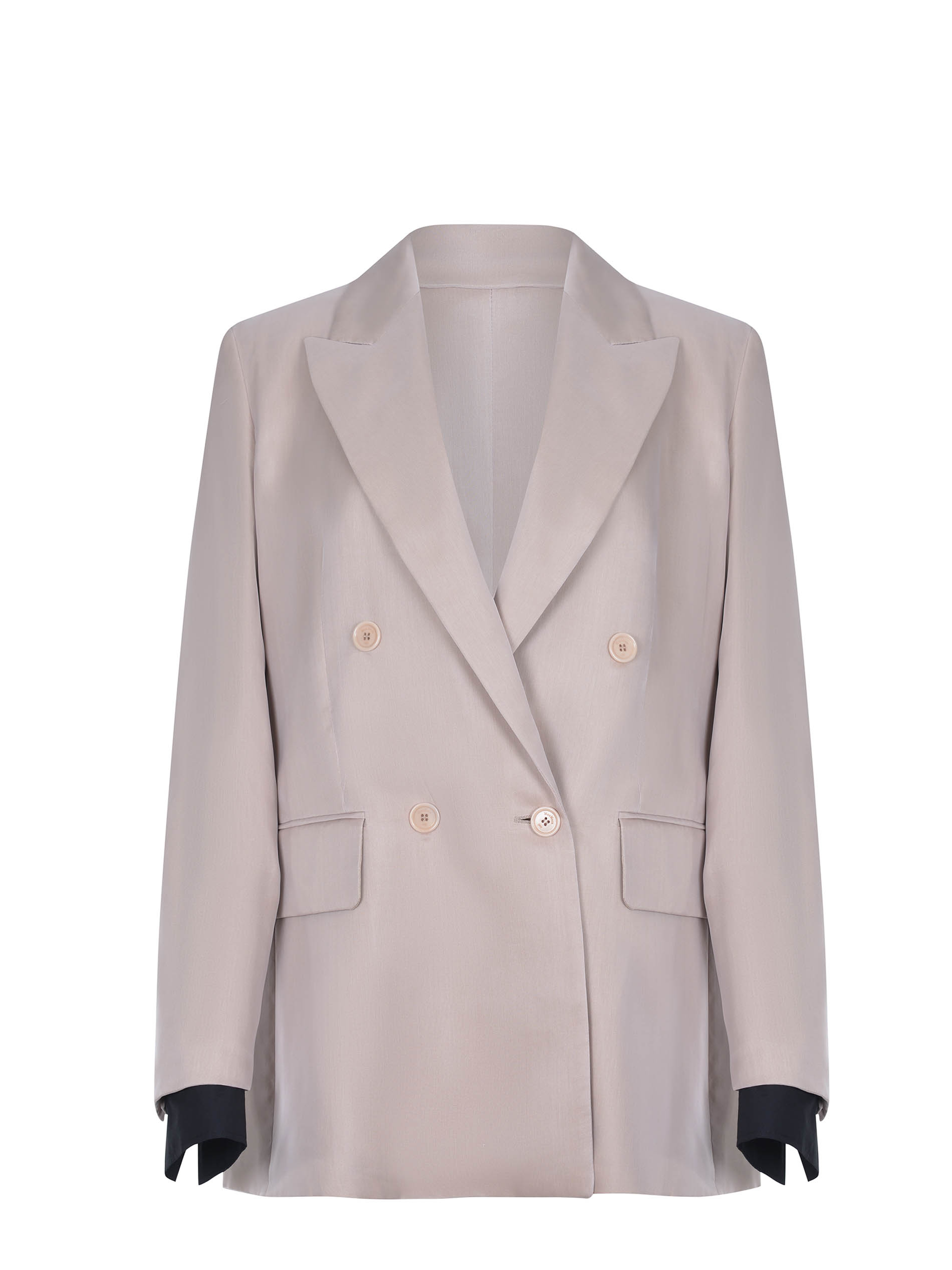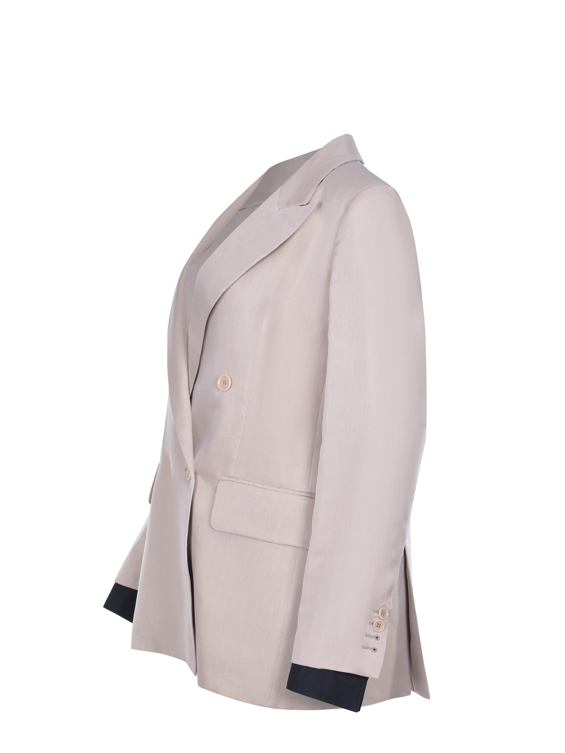 Max Mara "Mxsfeltro" blazer made of camel-colored silk. Double-breasted. Notch lapel collar. Front button closure. Long sleeves. Cuffs with buttons. Removable contrasting cuffs. Side flap pockets. Side slits at the back. 100% silk. Made in Italy