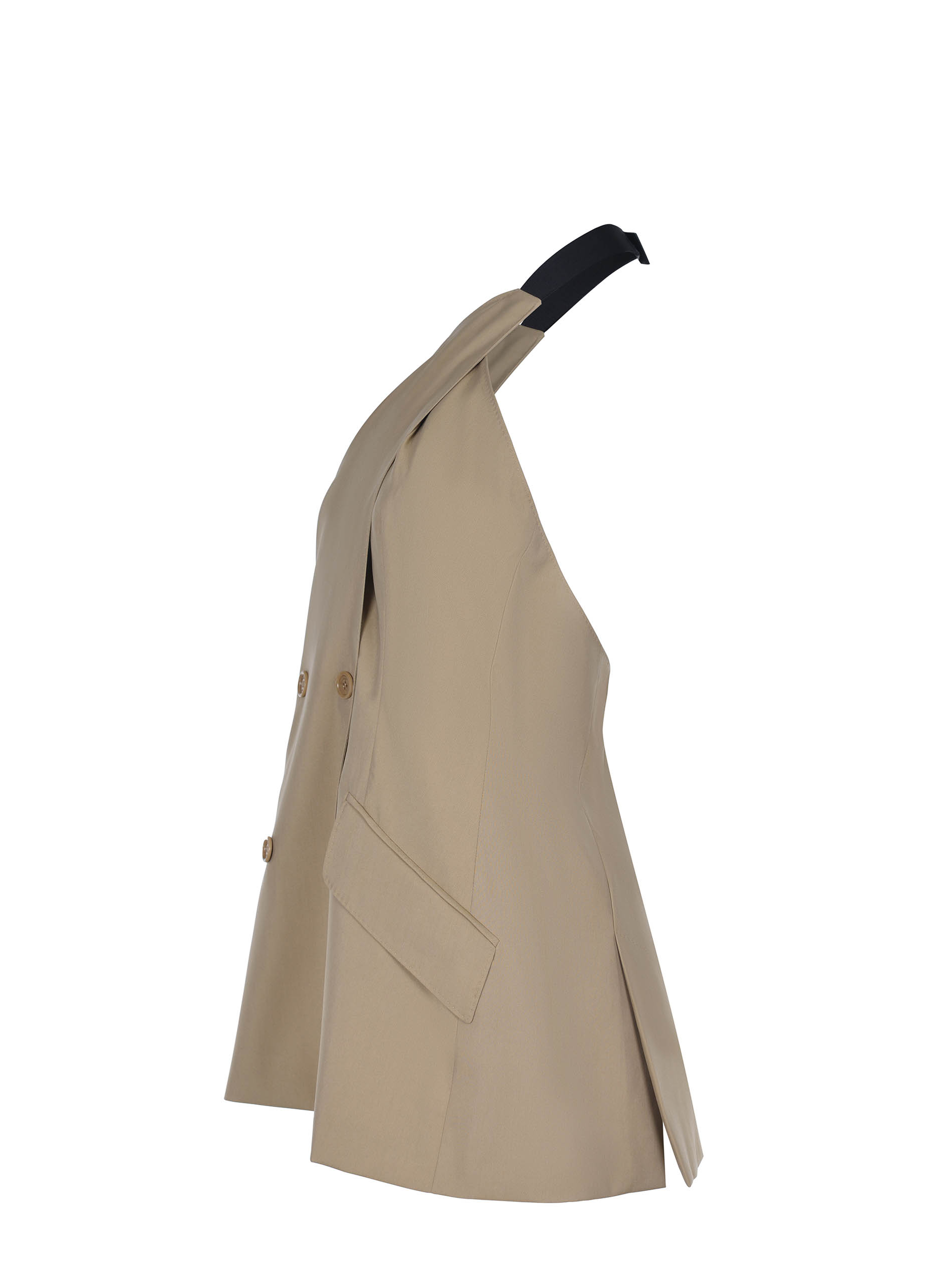 Double-breasted closure with buttons.