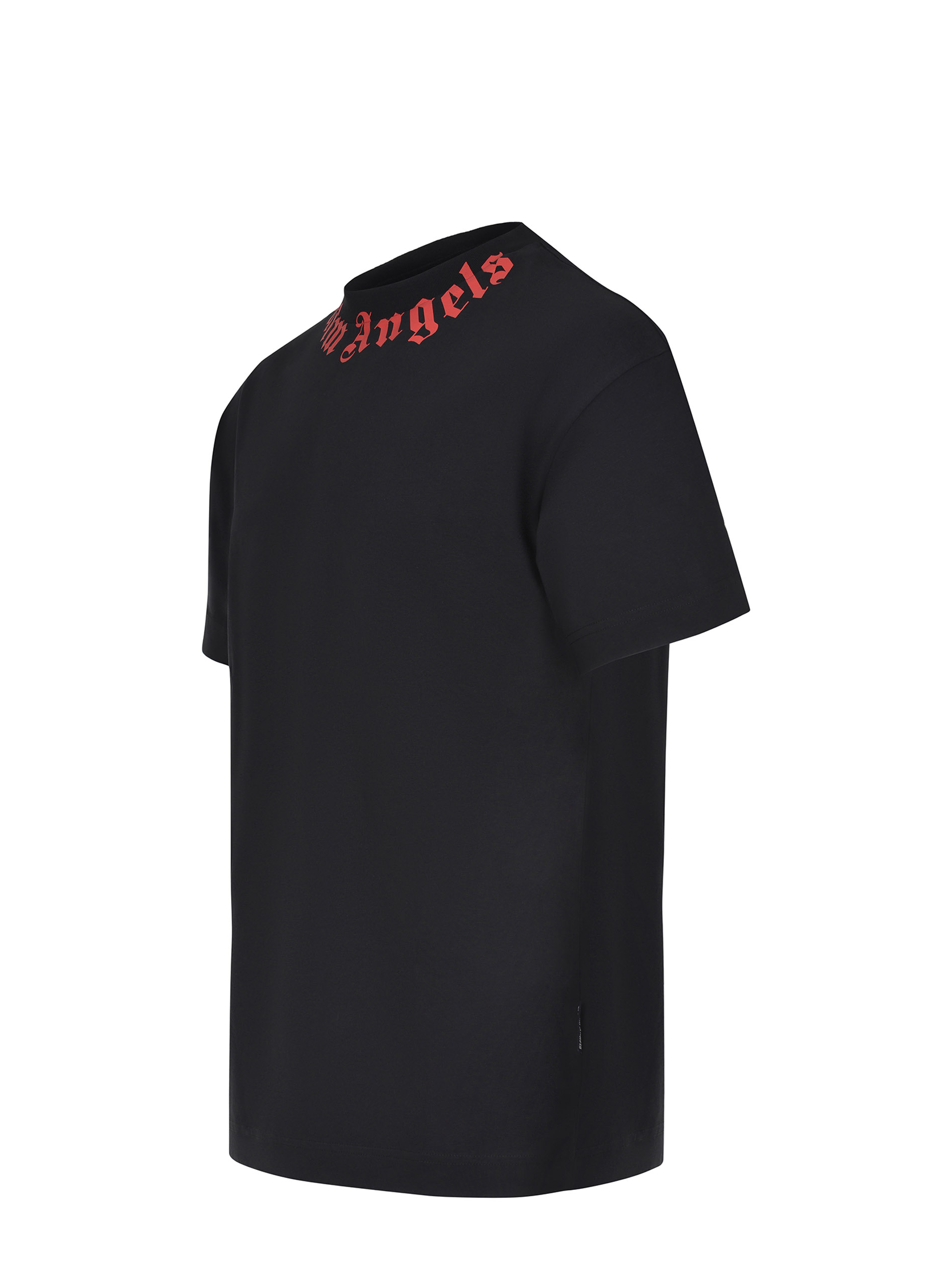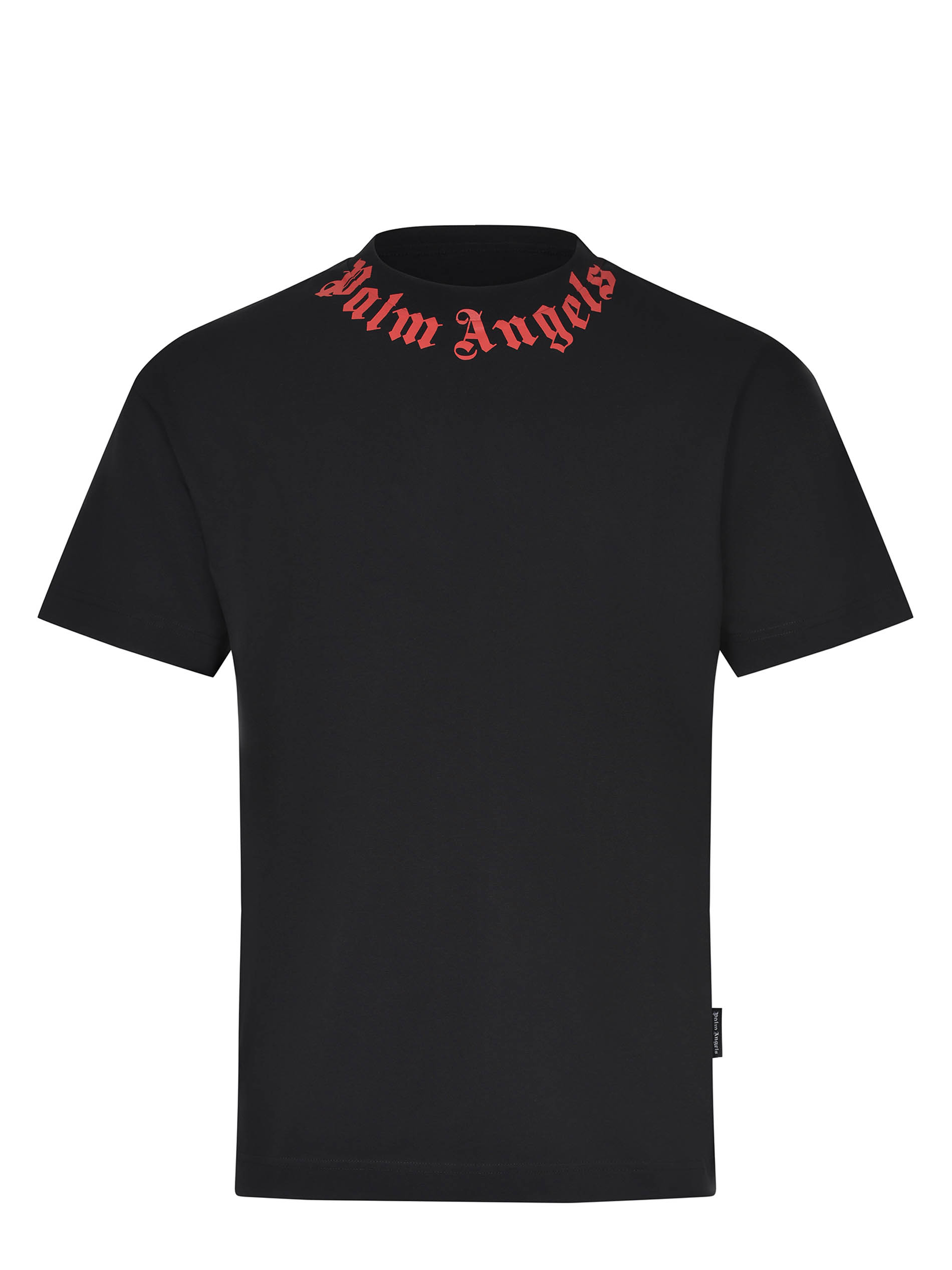 Palm Angels T-shirt made of black cotton. Ribbed crew neck. Contrasting logo lettering printed on the neck. Short sleeves. 100% cotton.