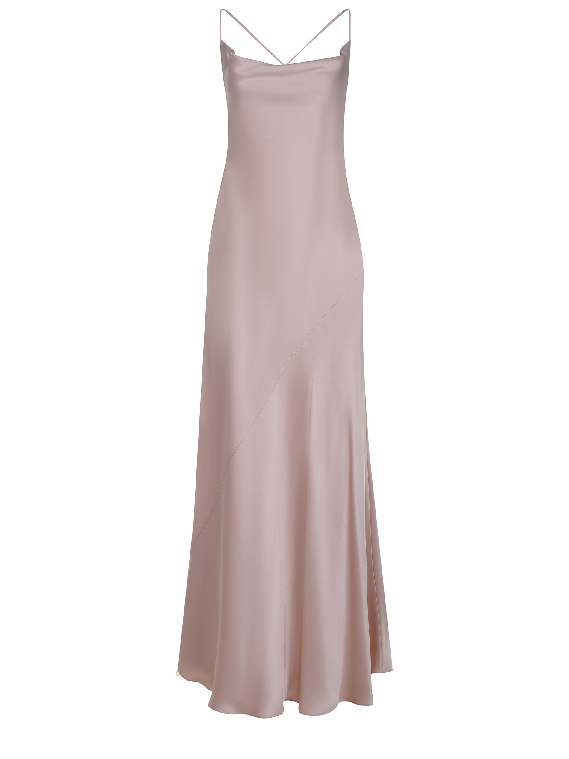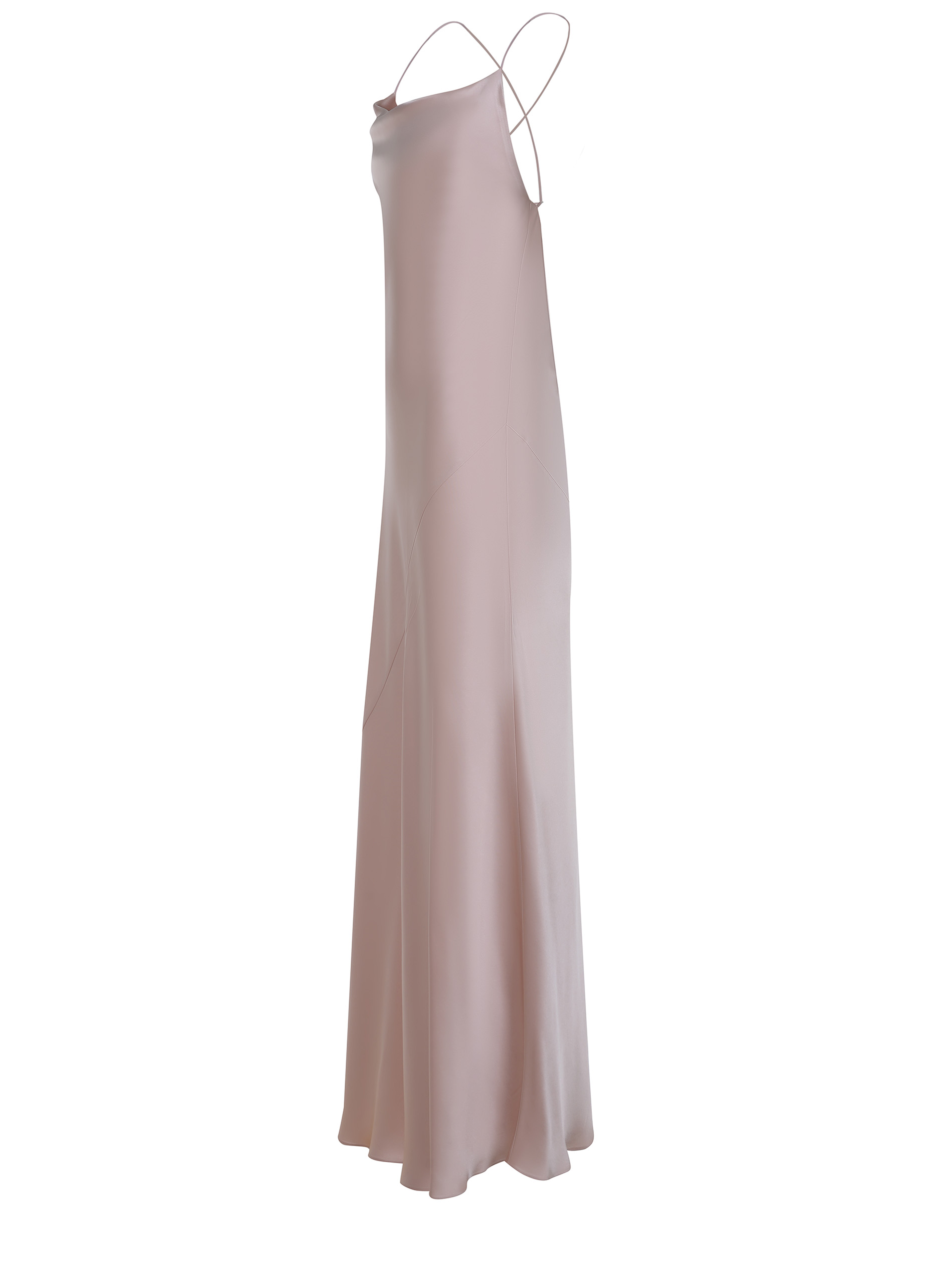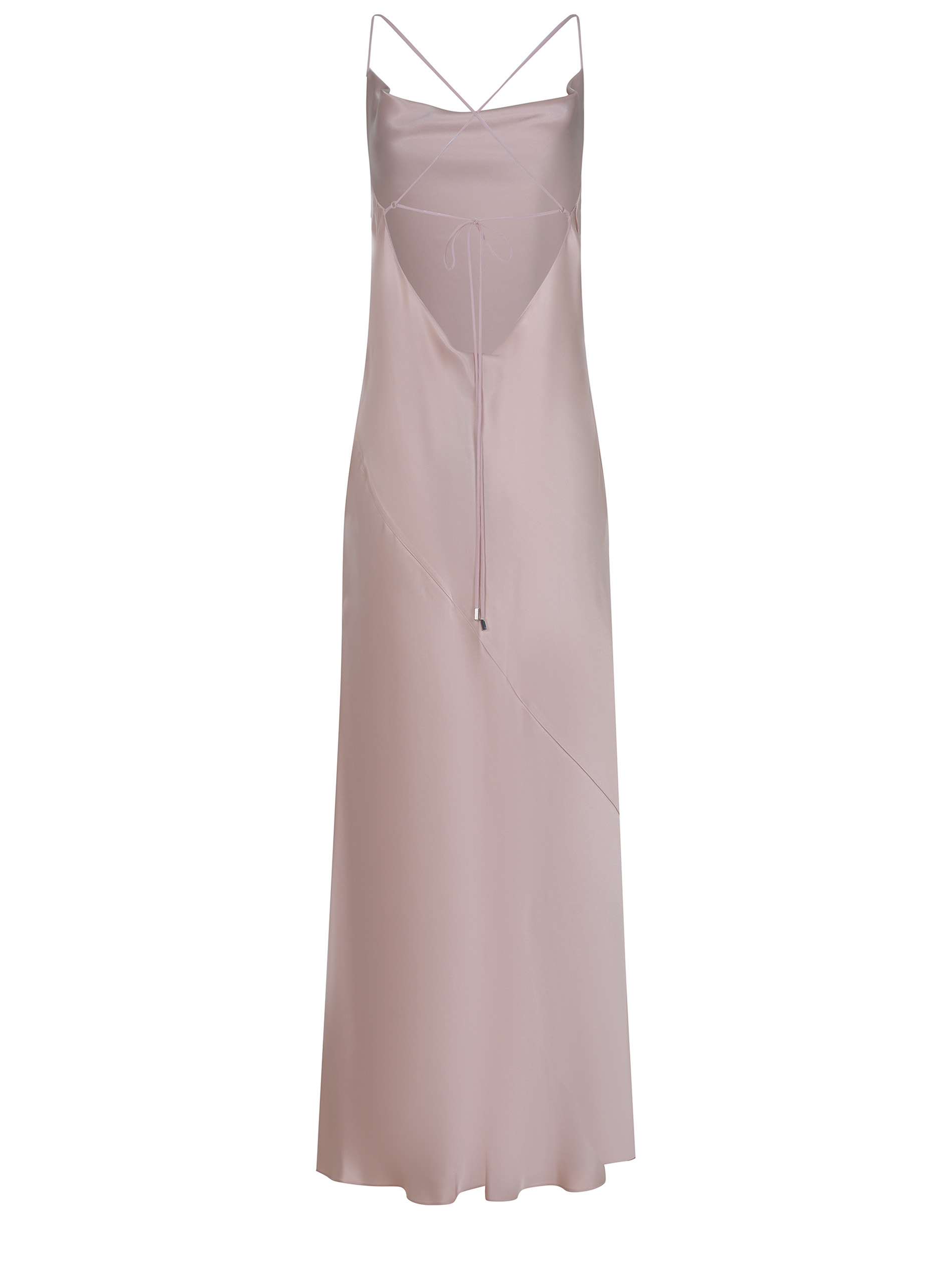 Pinko dress made of pink polyester. Straight neckline. Thin straps. Deep back neckline with criss-cross ties. 91% acetate, 9% polyester Made in Italy