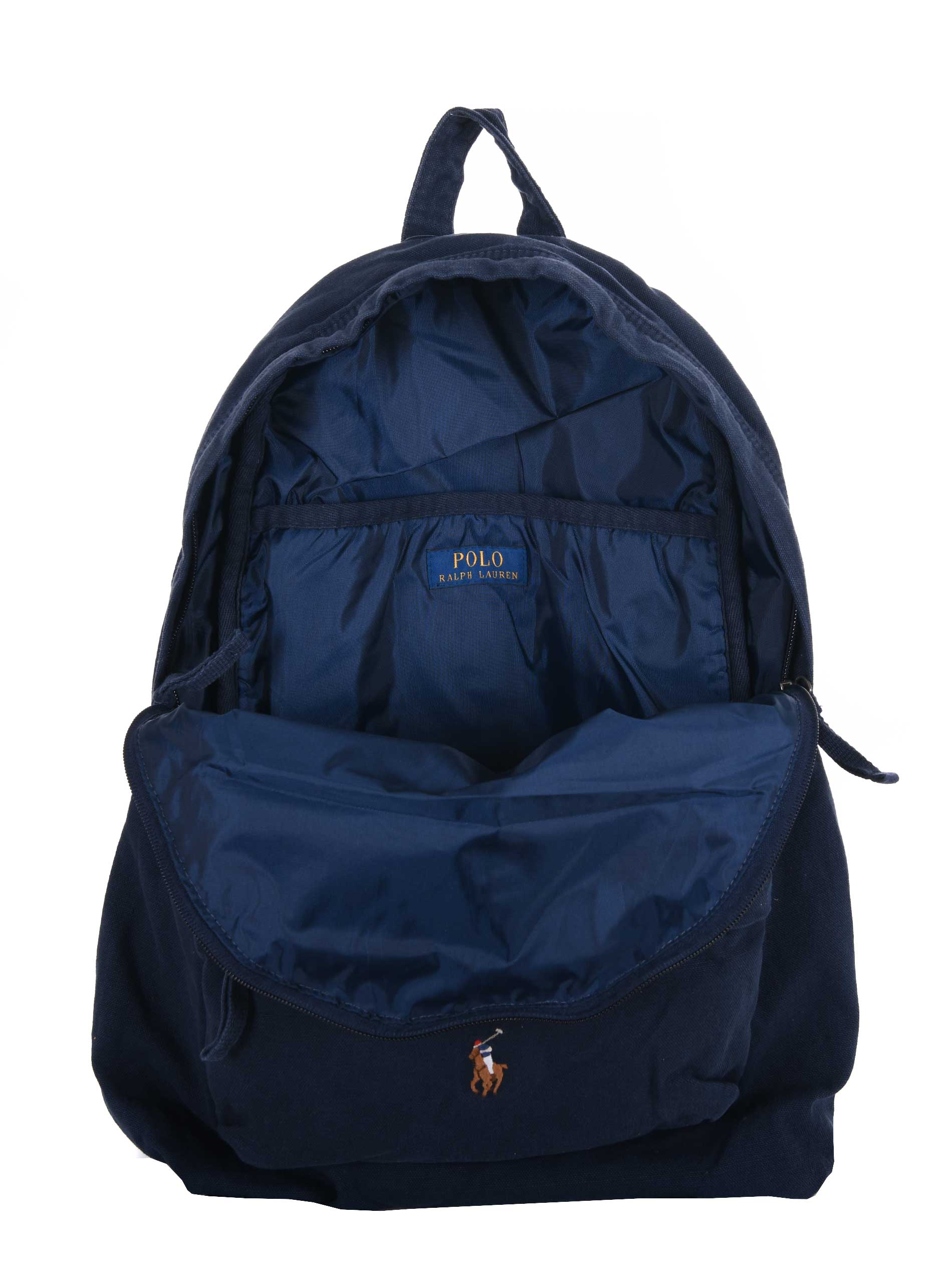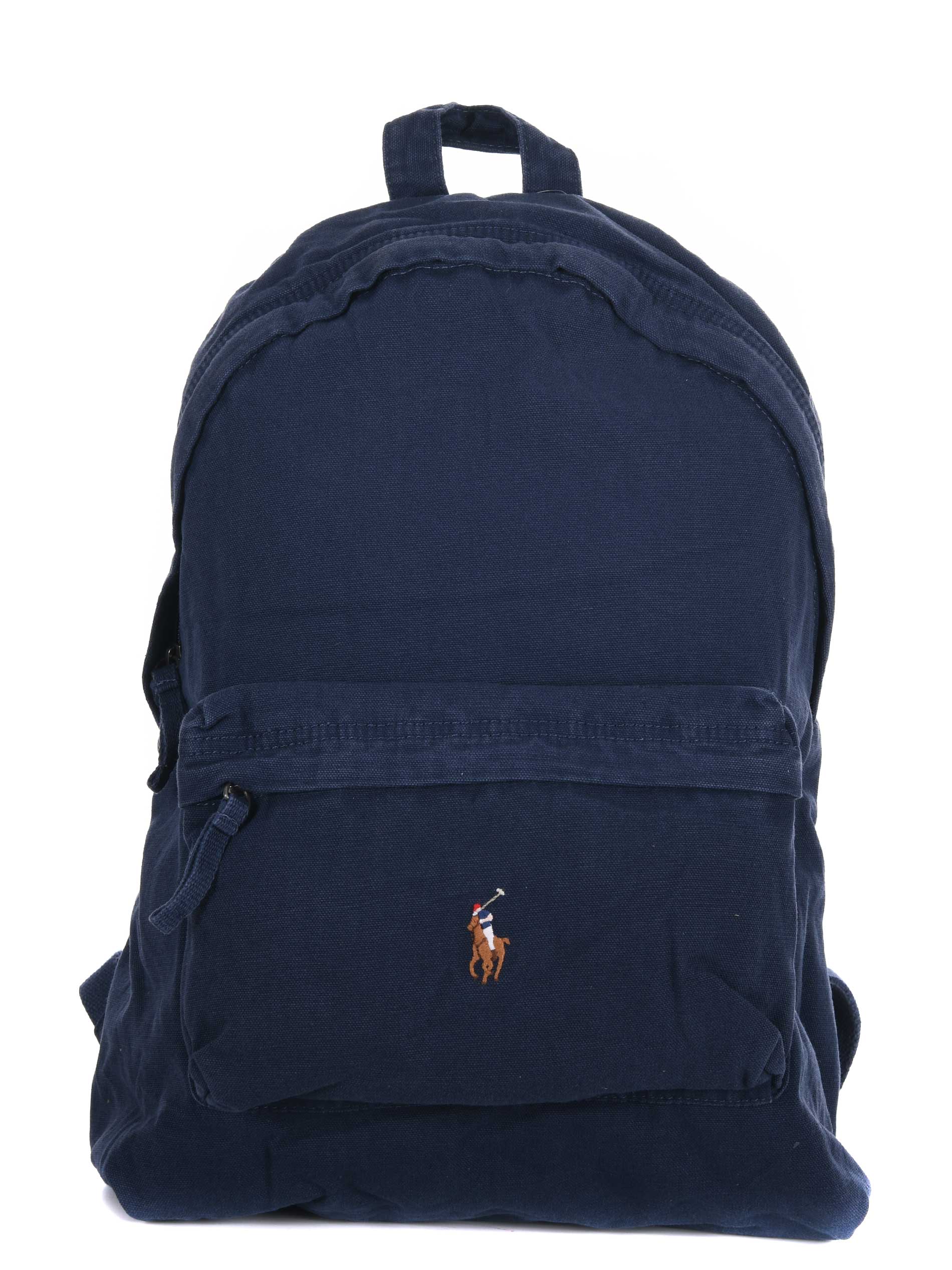 Polo Ralph Lauren canvas backpack in blue. Nylon handle. Adjustable shoulder straps. Front zip pocket. Main zip compartment. Internal laptop compartment. Embroidered front logo.