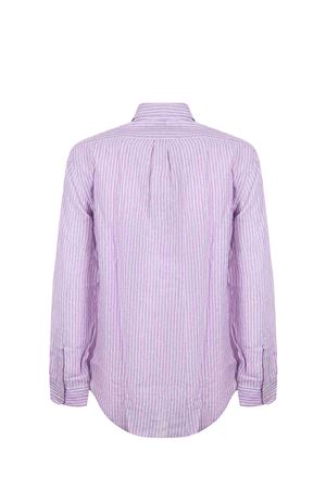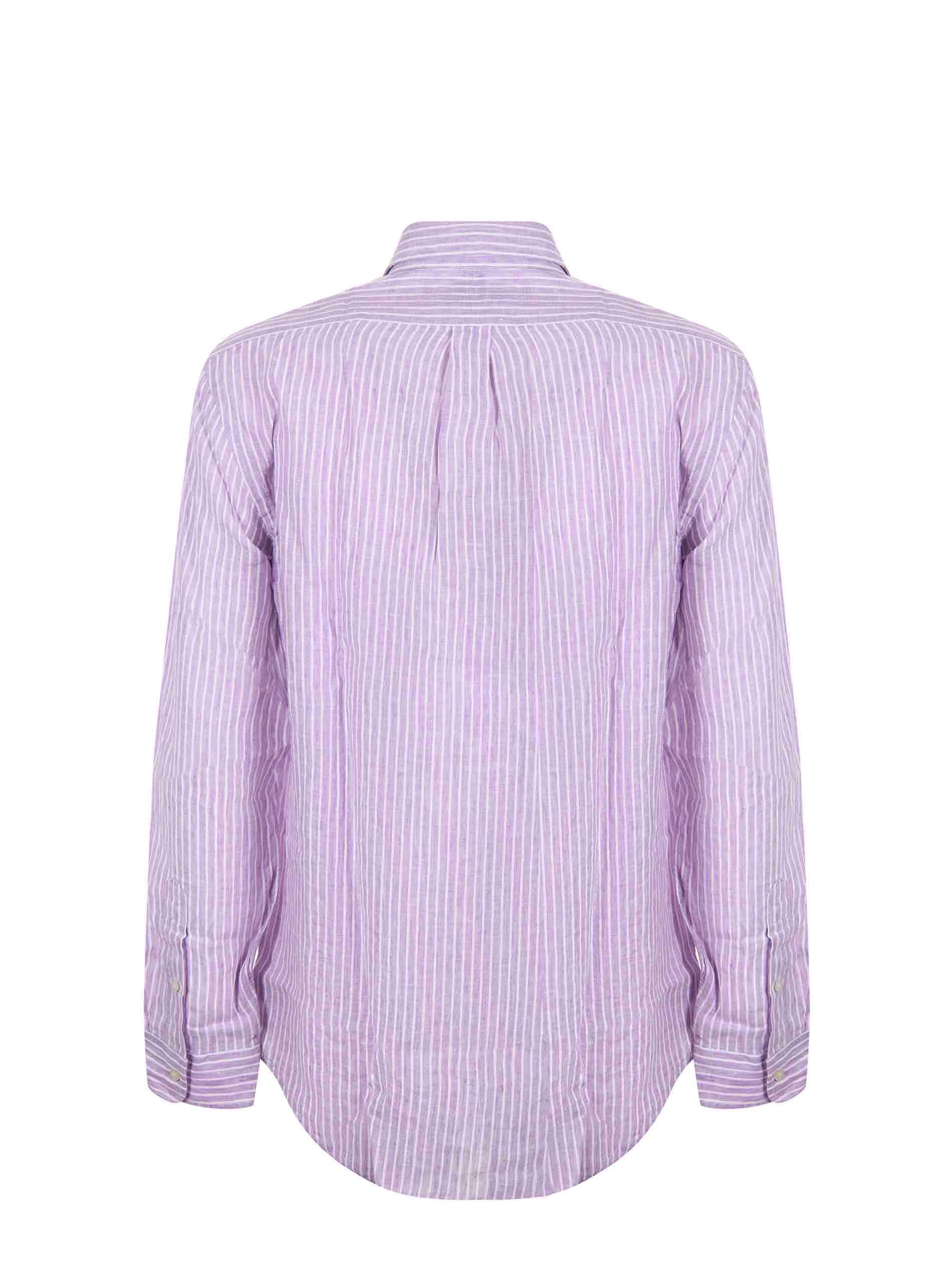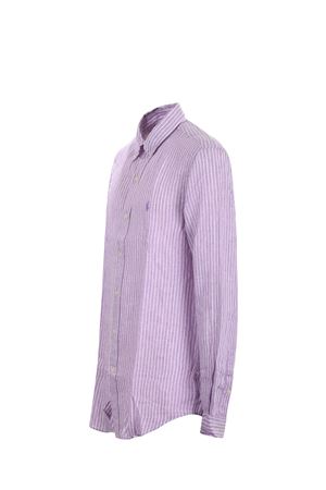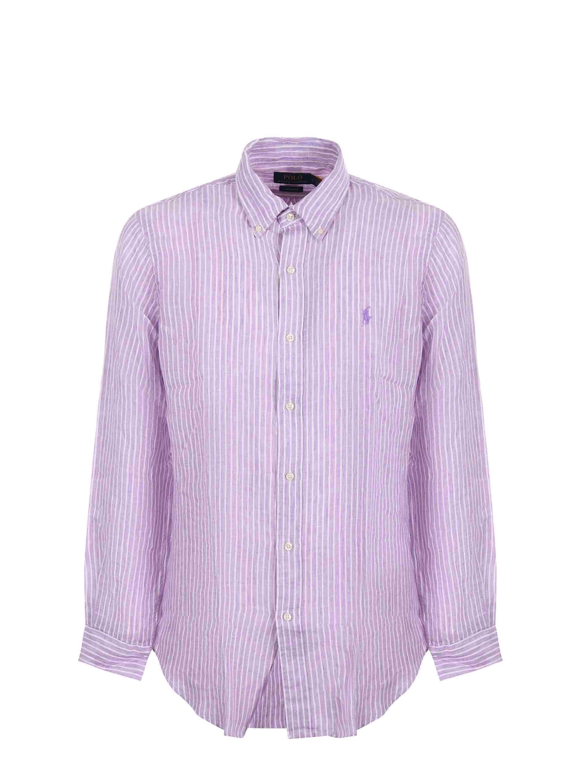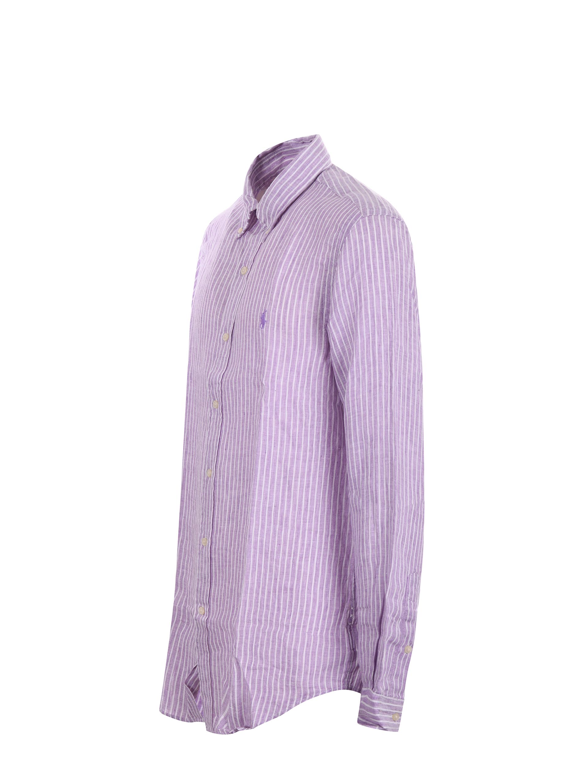 Polo Ralph Lauren linen shirt in Wisteria/White with a stick pattern. Button-down collar. Long sleeves. Buttoned cuffs. Button closure. Embroidered logo on the front. Placket on the back. Custom fit.