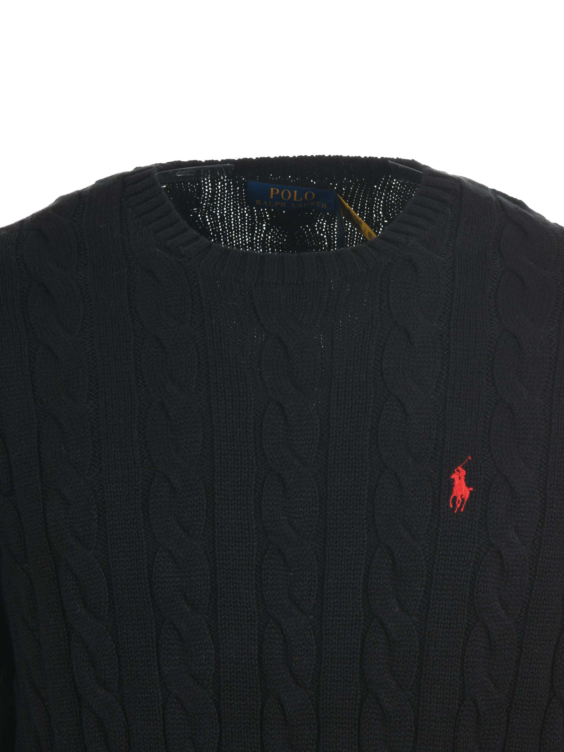 Polo Ralph Lauren sweater in warm dark blue cable-knit cotton. Ribbed crewneck. Long sleeves. Ribbed cuffs and hem. Contrasting embroidered logo on the front.