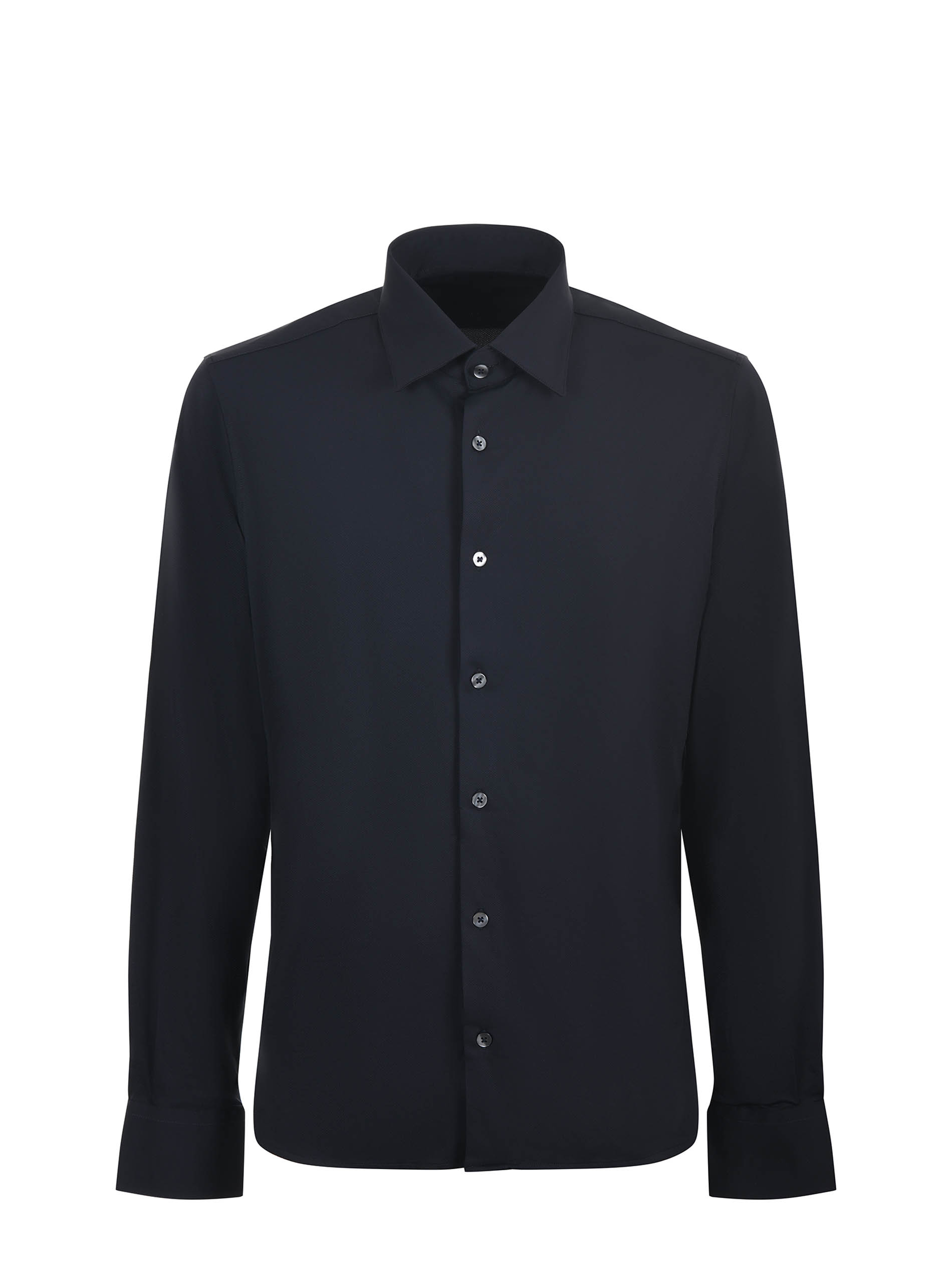 RRD stretch jersey shirt in dark blue Oxford pattern. Classic collar. Long sleeves. Buttoned cuffs. Button closure. Slim fit.Size shown: 5086% polyamide, 14% elastane