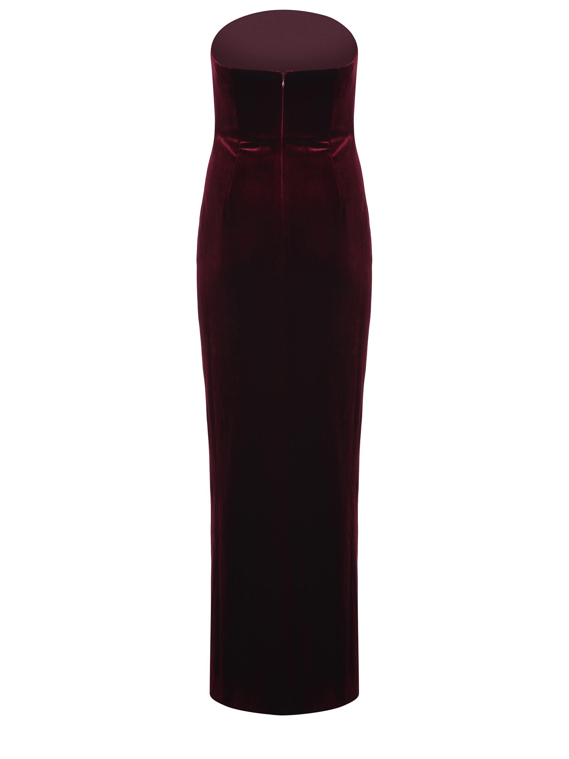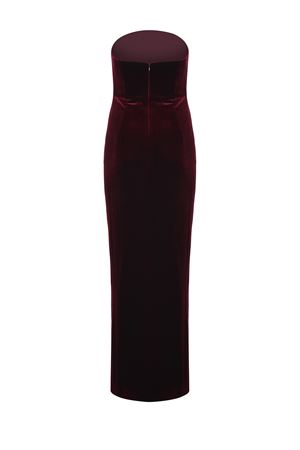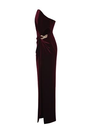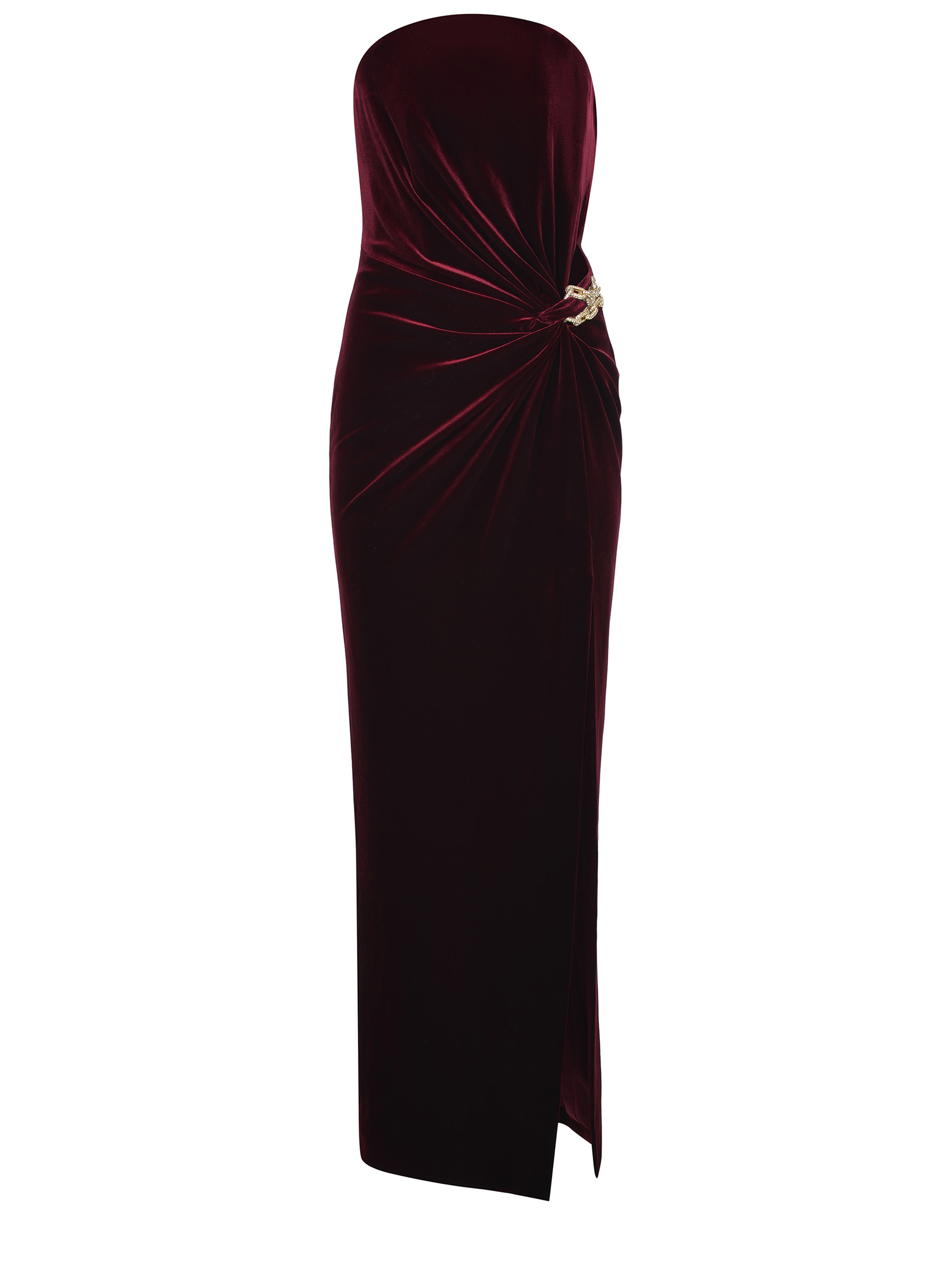 Self-Portrait dress made of Burgundy velvet. Strapless neckline. Internal bodice with hooks. Side detail with golden metal chains covered in rhinestones. Side cut-out. Draped at the front. Side slit. Zip closure at the back. Lined. 92% polyester 8% elastane.