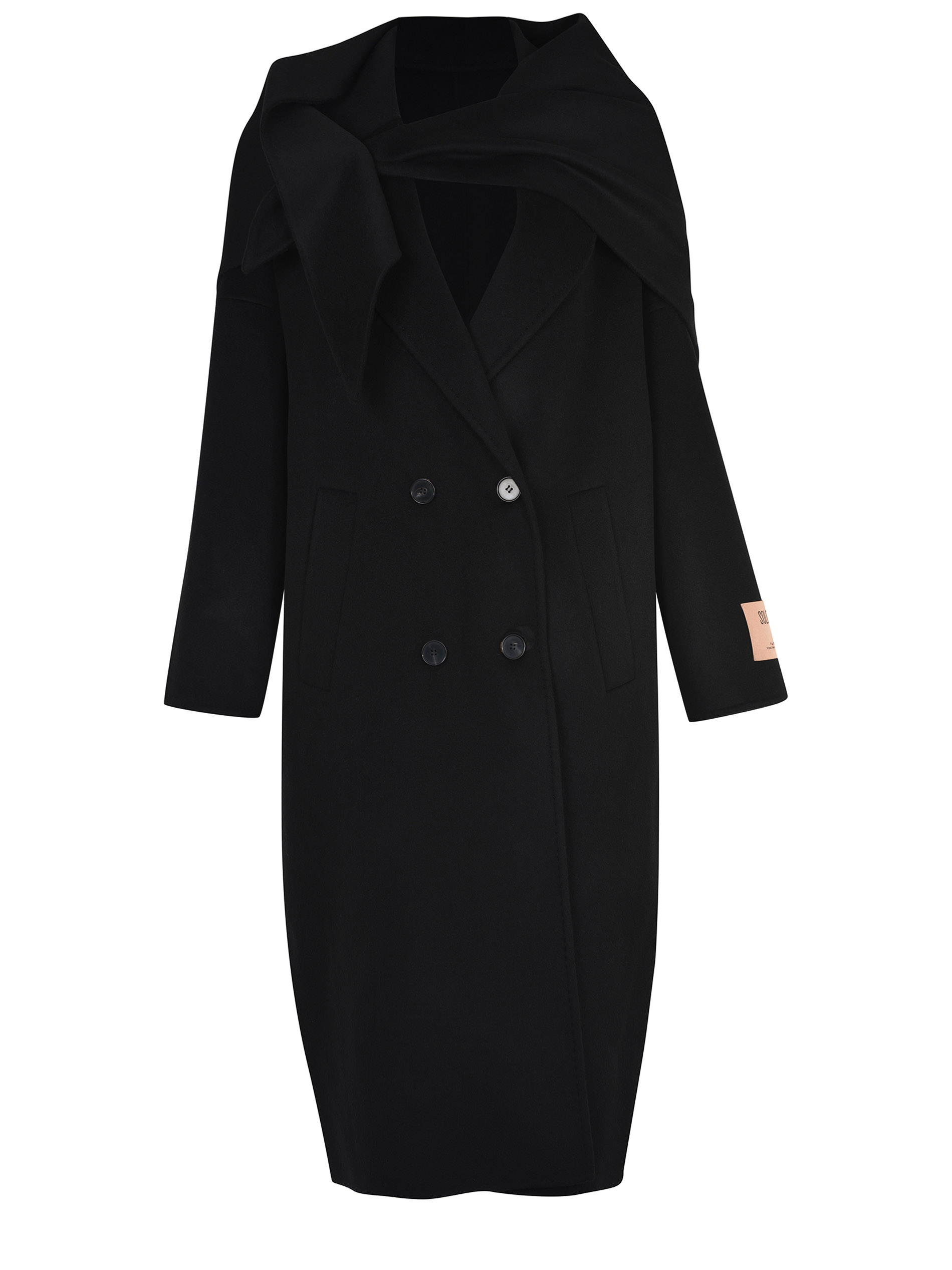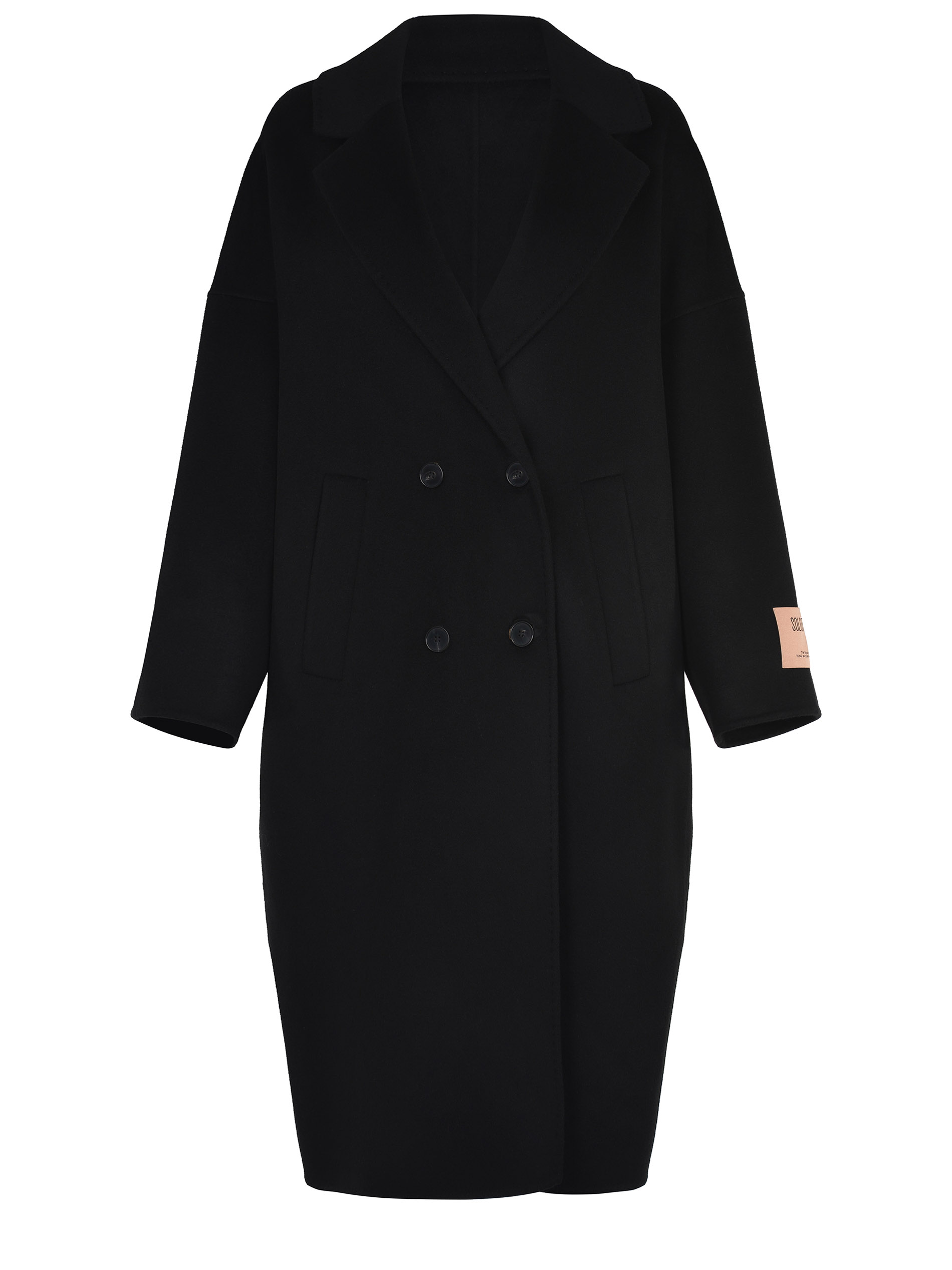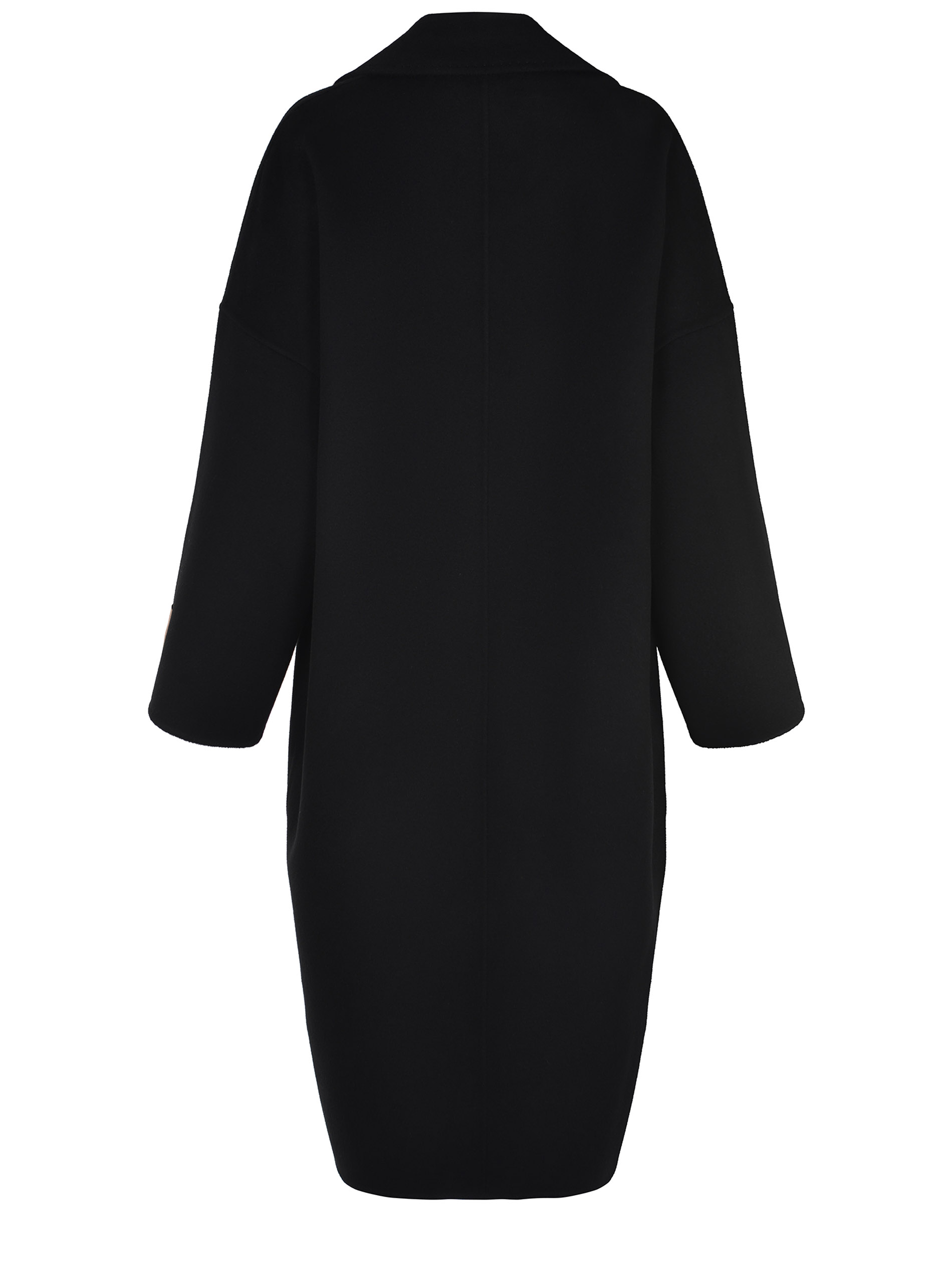 Solotre coat made of black wool and cashmere blend. Classic lapel. Long sleeves. Embroidered logo patch on the contrasting cuff. Front button closure. Side pockets. 95% wool 5% cashmere