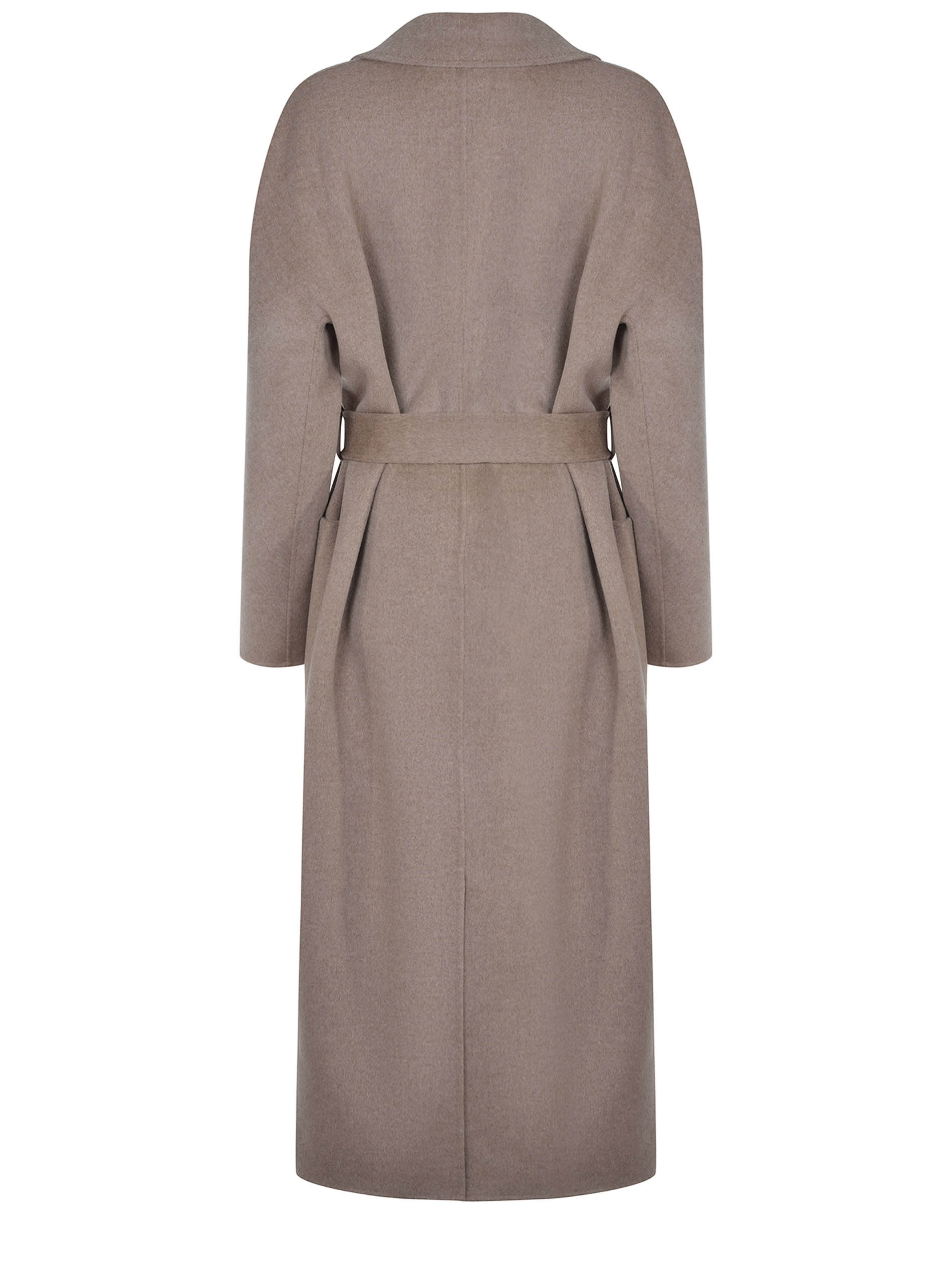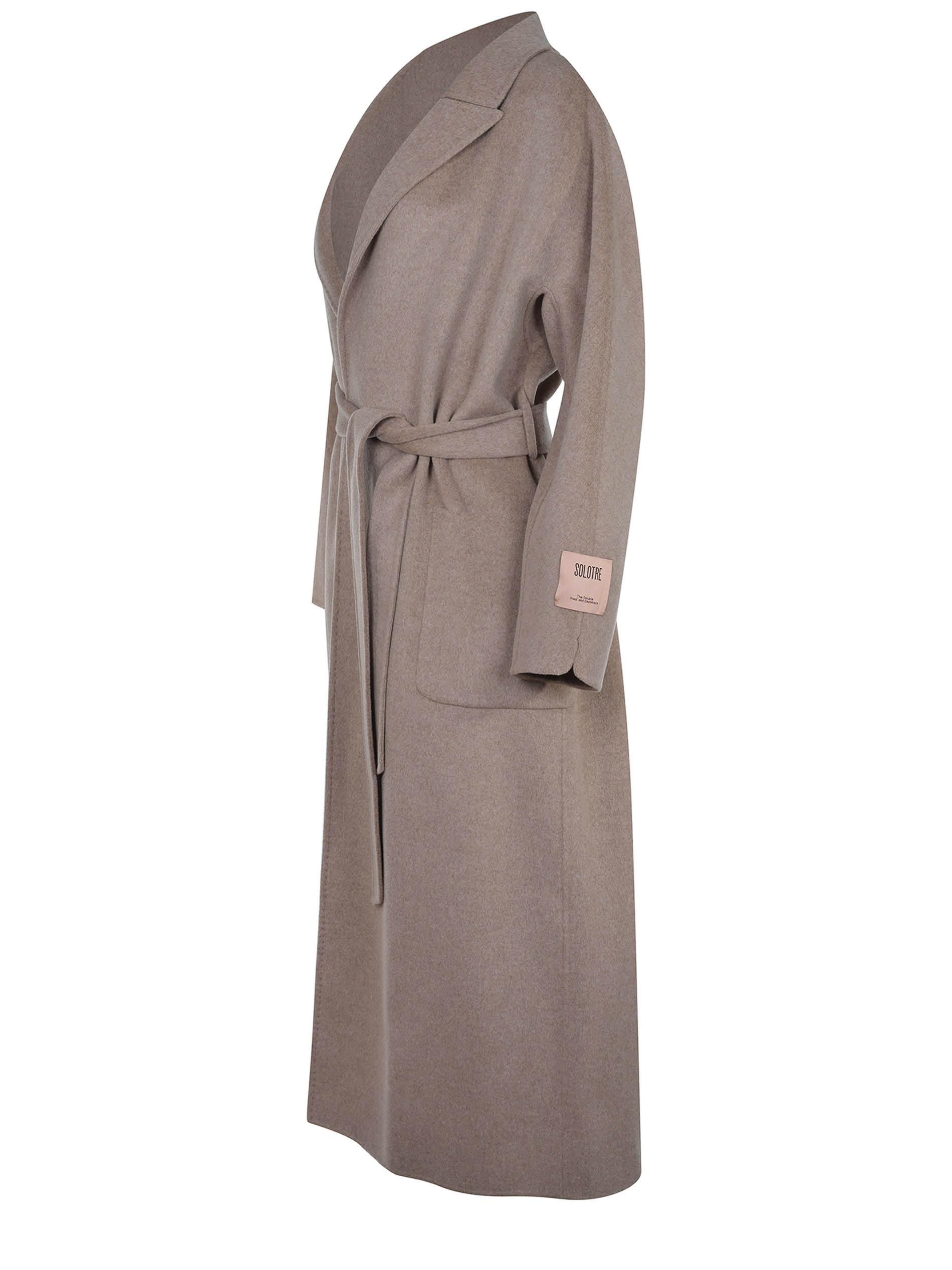 Solotre coat made of a wool and cashmere blend in Beige color. Classic lapel. Long sleeves. Embroidered logo patch on the cuff in contrast. Belt loops. Closure with removable waist tie. Side pockets. Back vent. 95% wool, 5% cashmere.