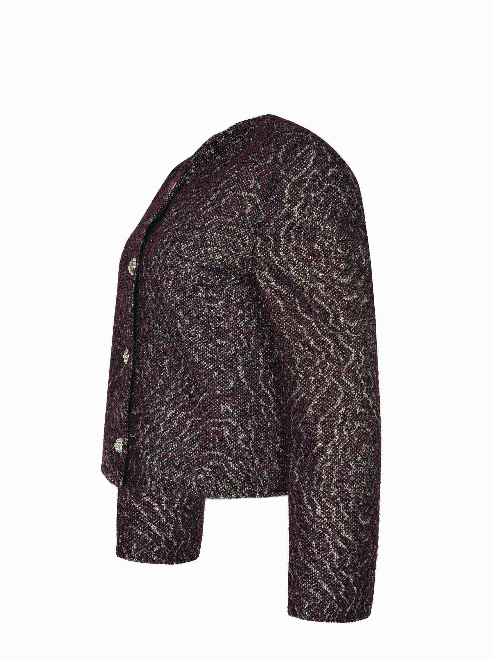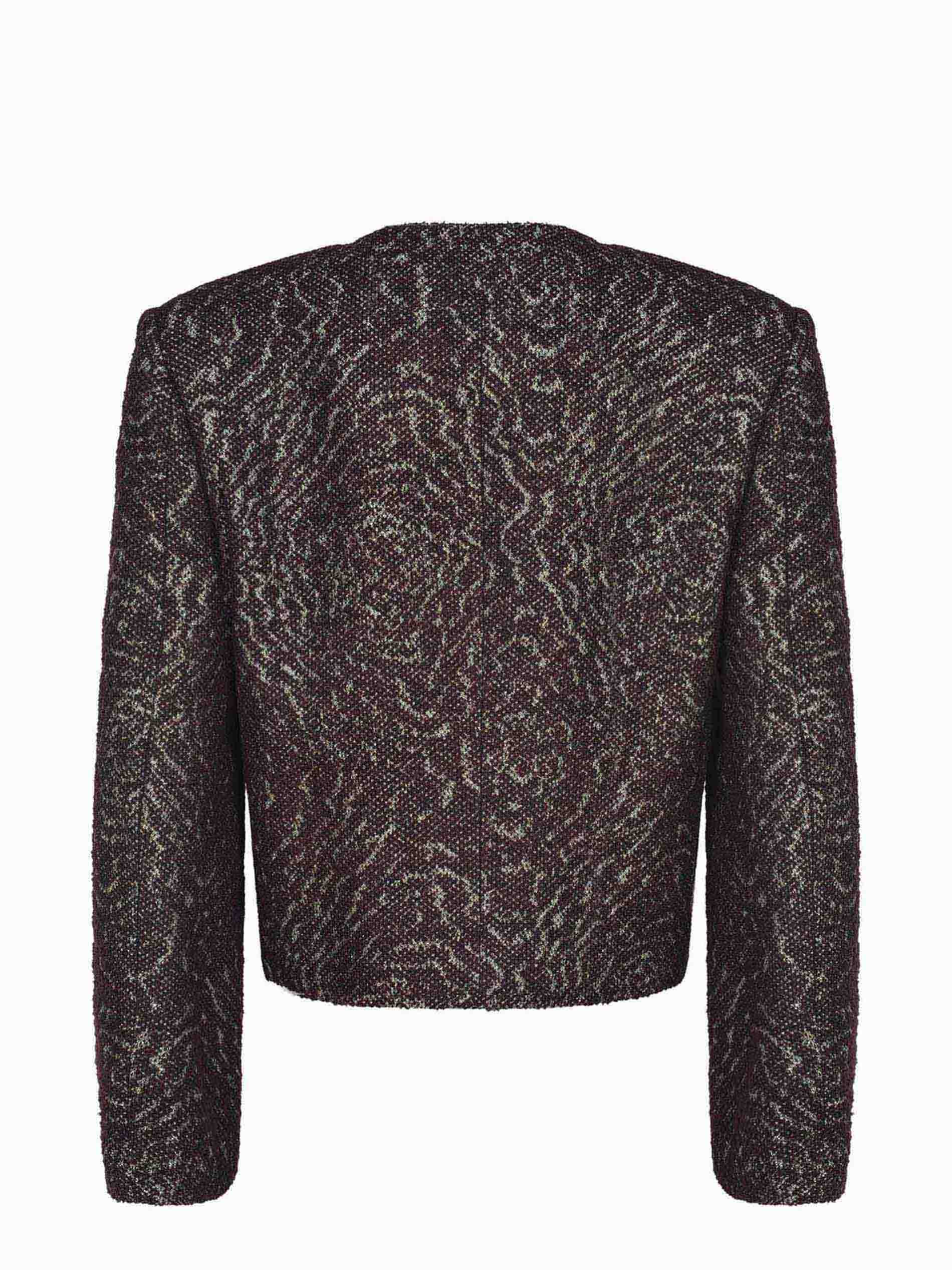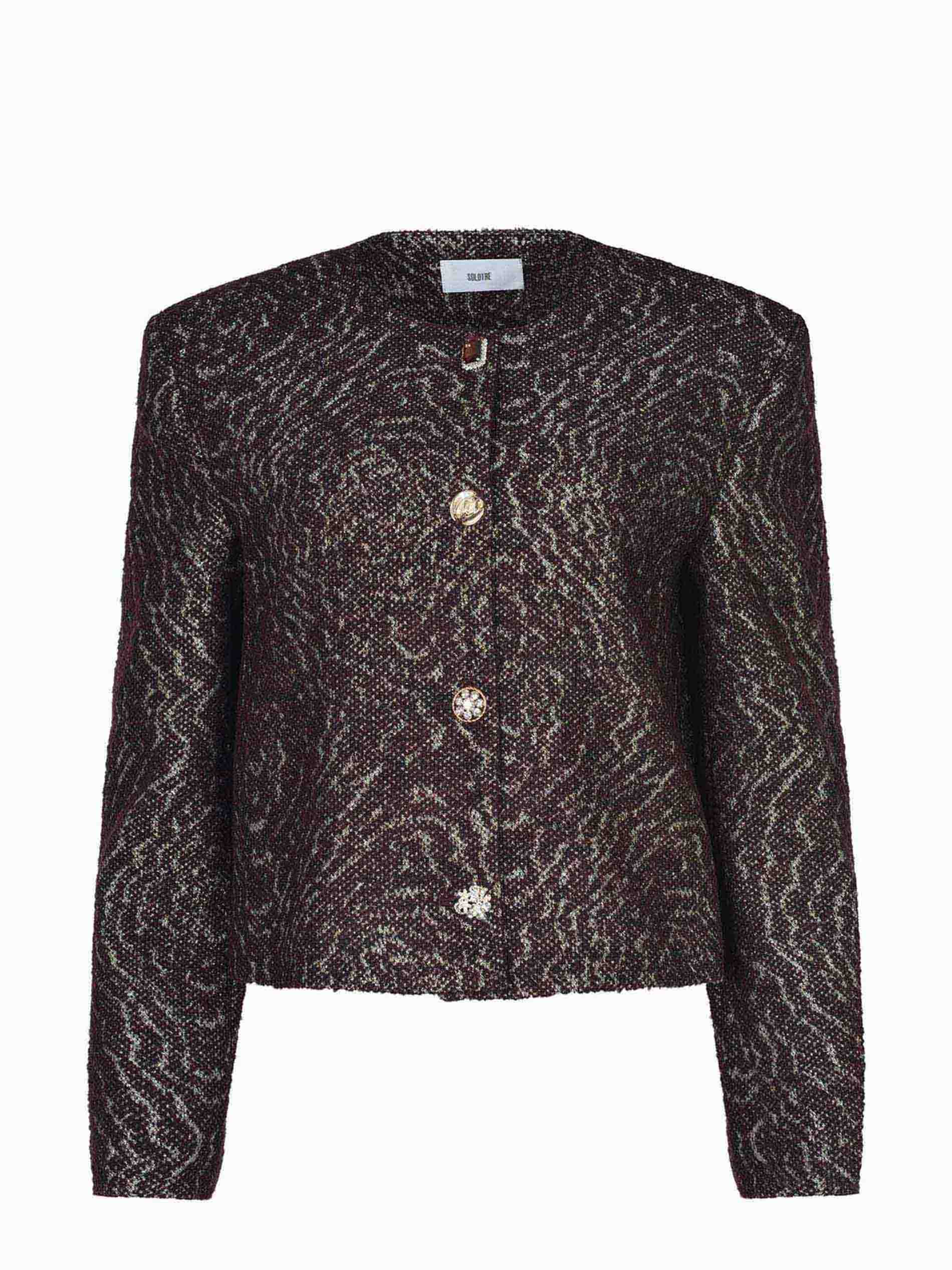 Solotre jacket made from a wool blend in Wine color. Contrasting all-over pattern. Crew neck. Long sleeves. Straps. Front closure with jewel buttons. 33% acrylic, 21% polyester, 18% viscose, 14% wool, 4% polyamide. Made in Italy.