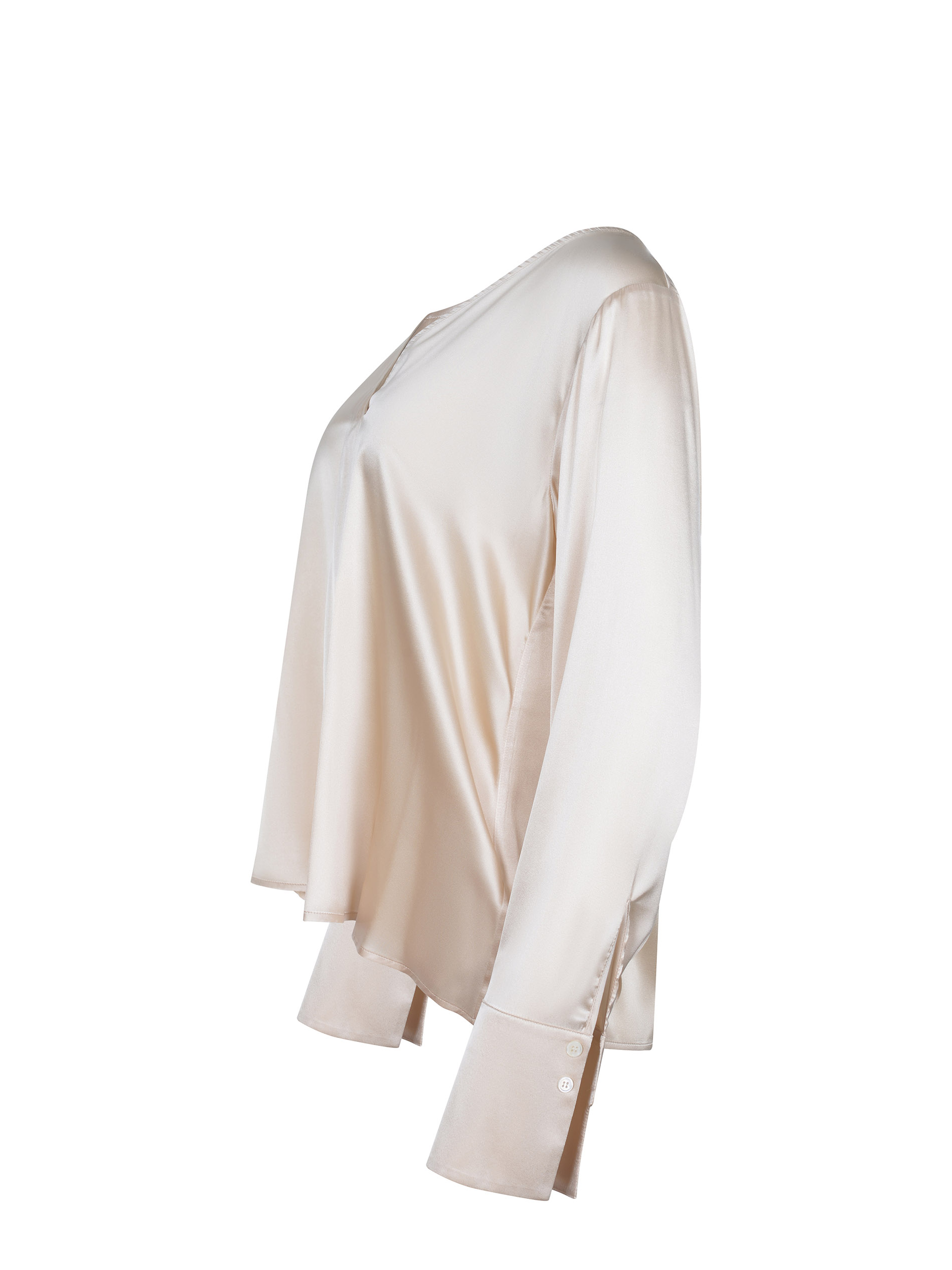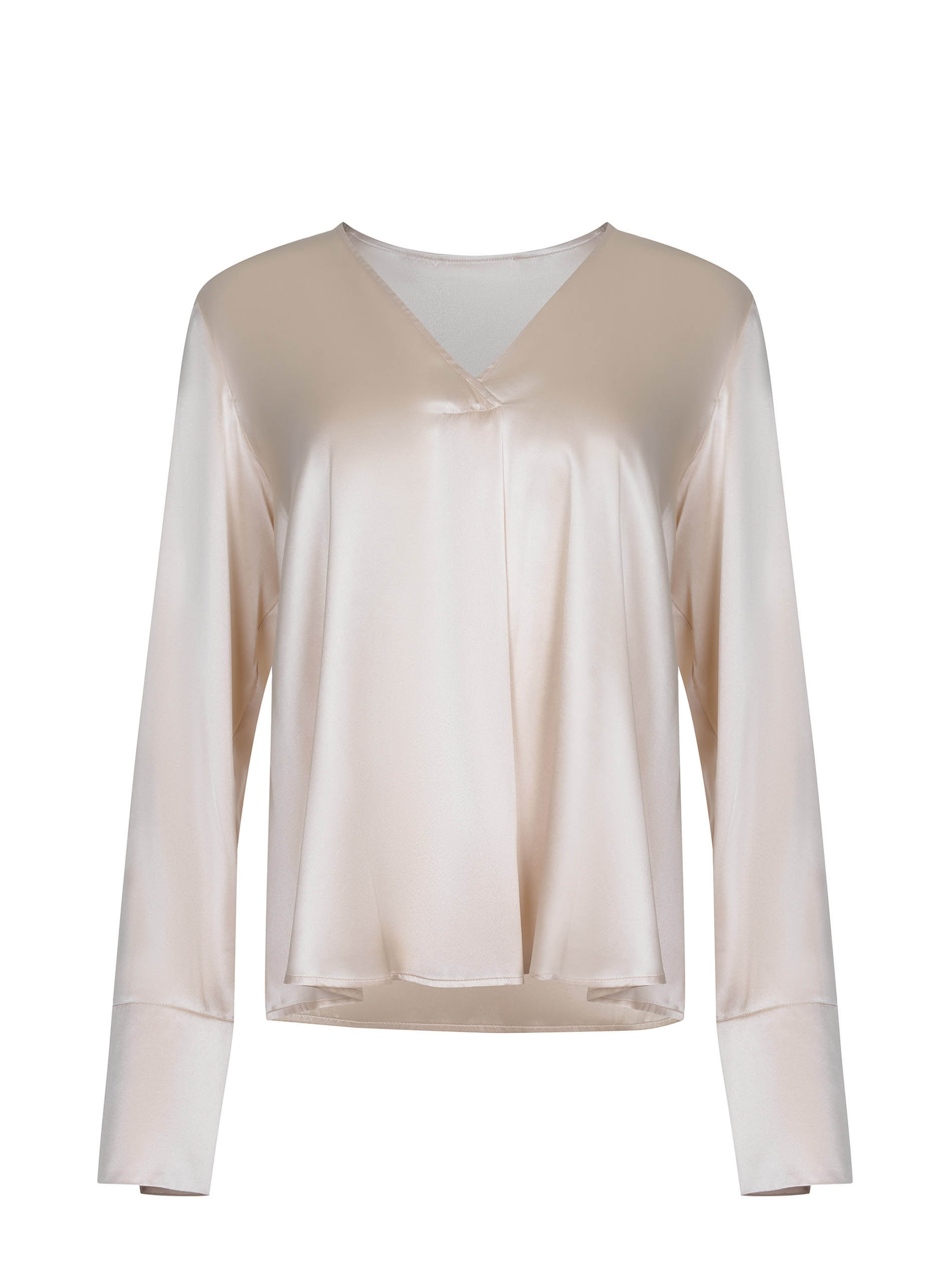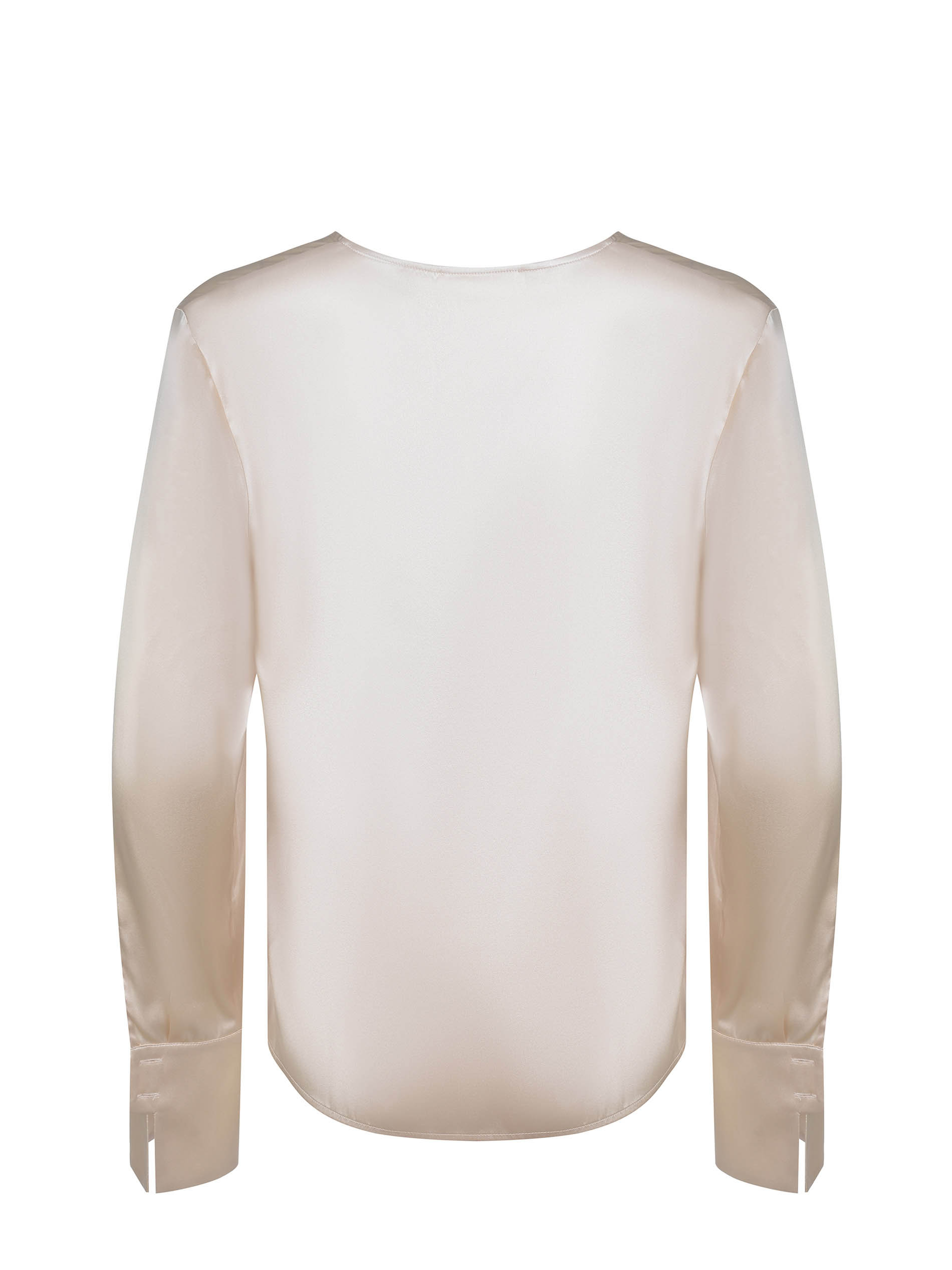 Solotre shirt made of silk blend in Champagne color. V-neck. Long sleeves. Cuffs with buttons. 92% silk 8% elastane. Made in Italy