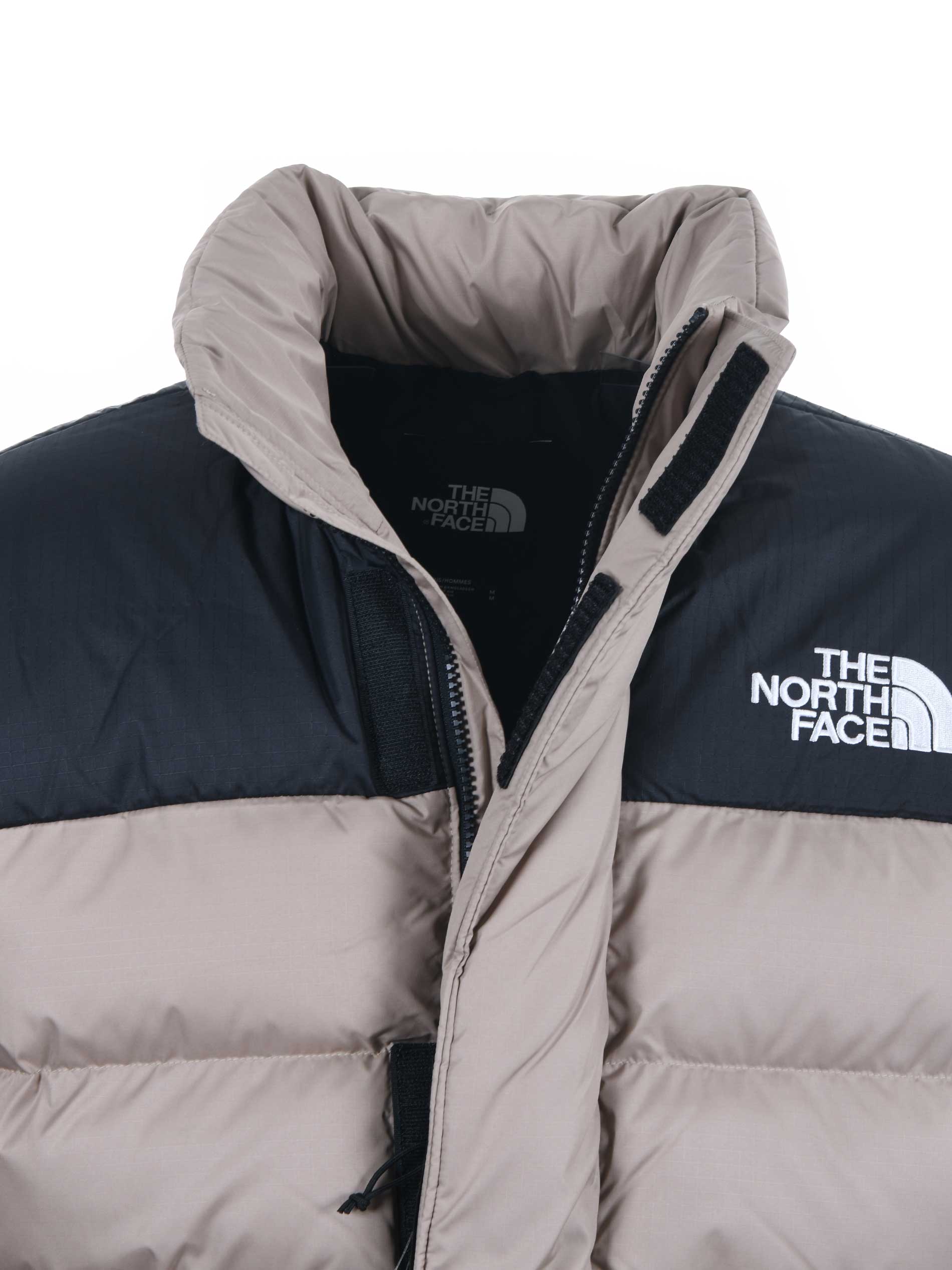 The North Face jacket in quilted ripstop nylon with a colorblock design. Technical padding. High collar with attached hood. Flap pockets. Drawstring hem. Adjustable cuffs. Embroidered logo on front and back.