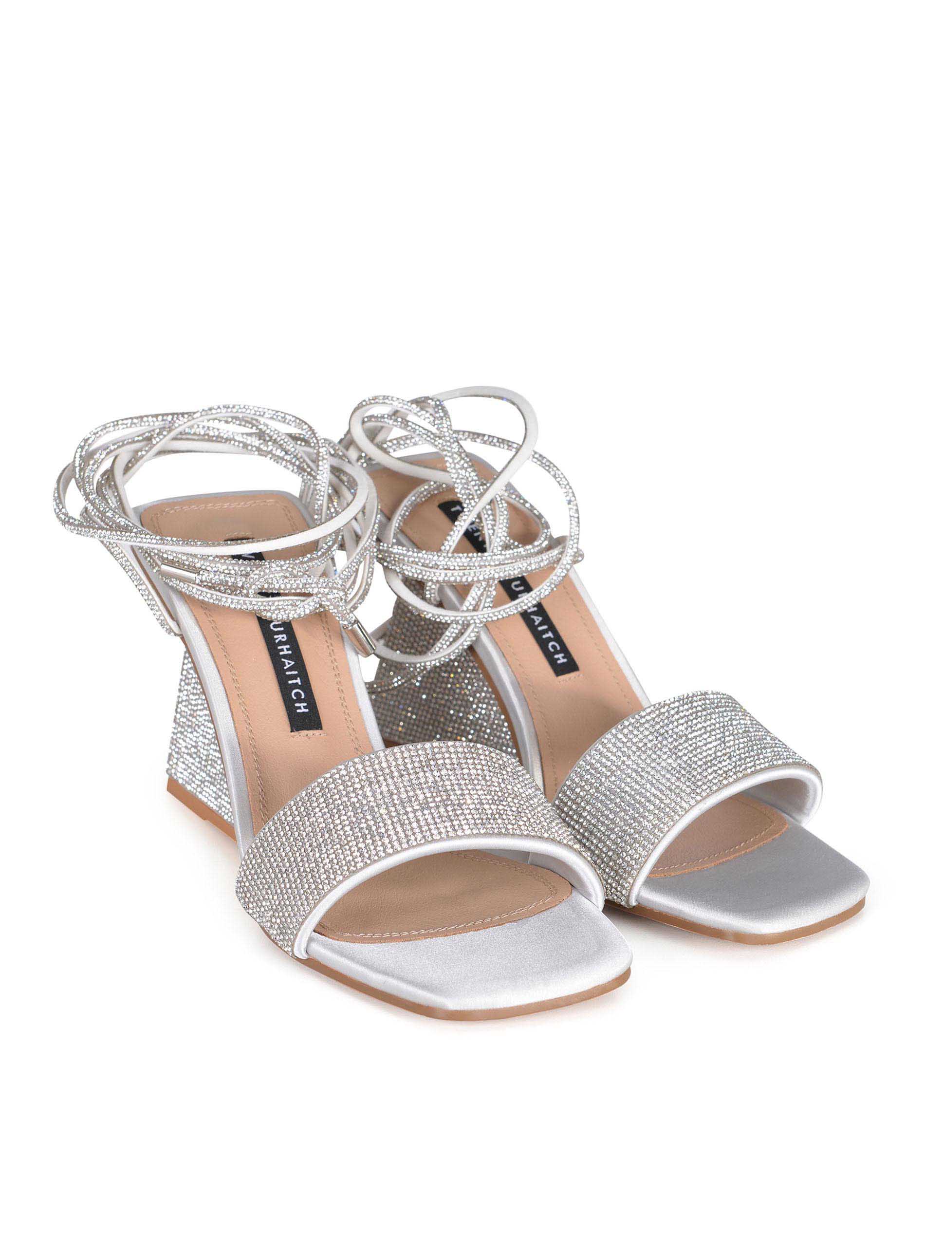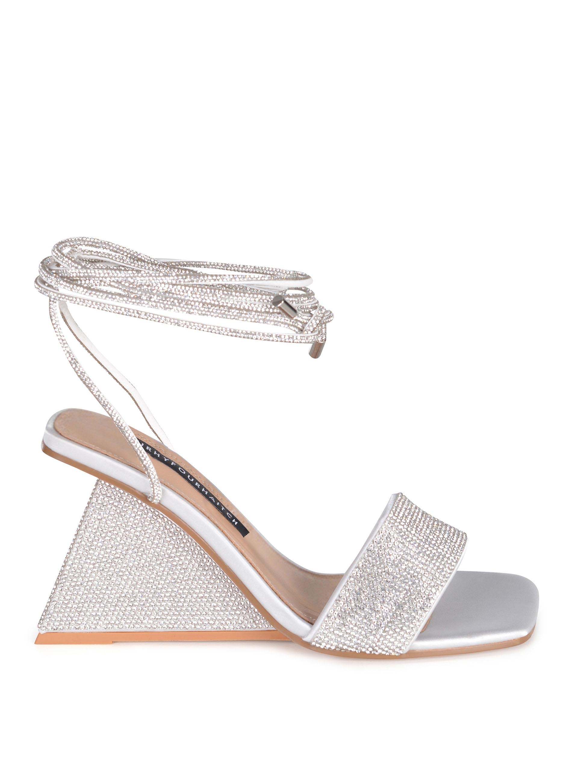 Asymmetrical wedge heel completely covered in silver rhinestones.
