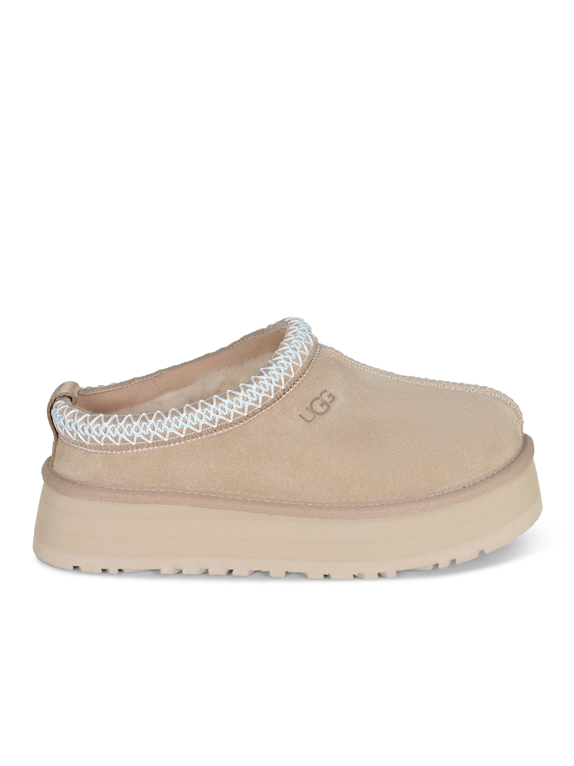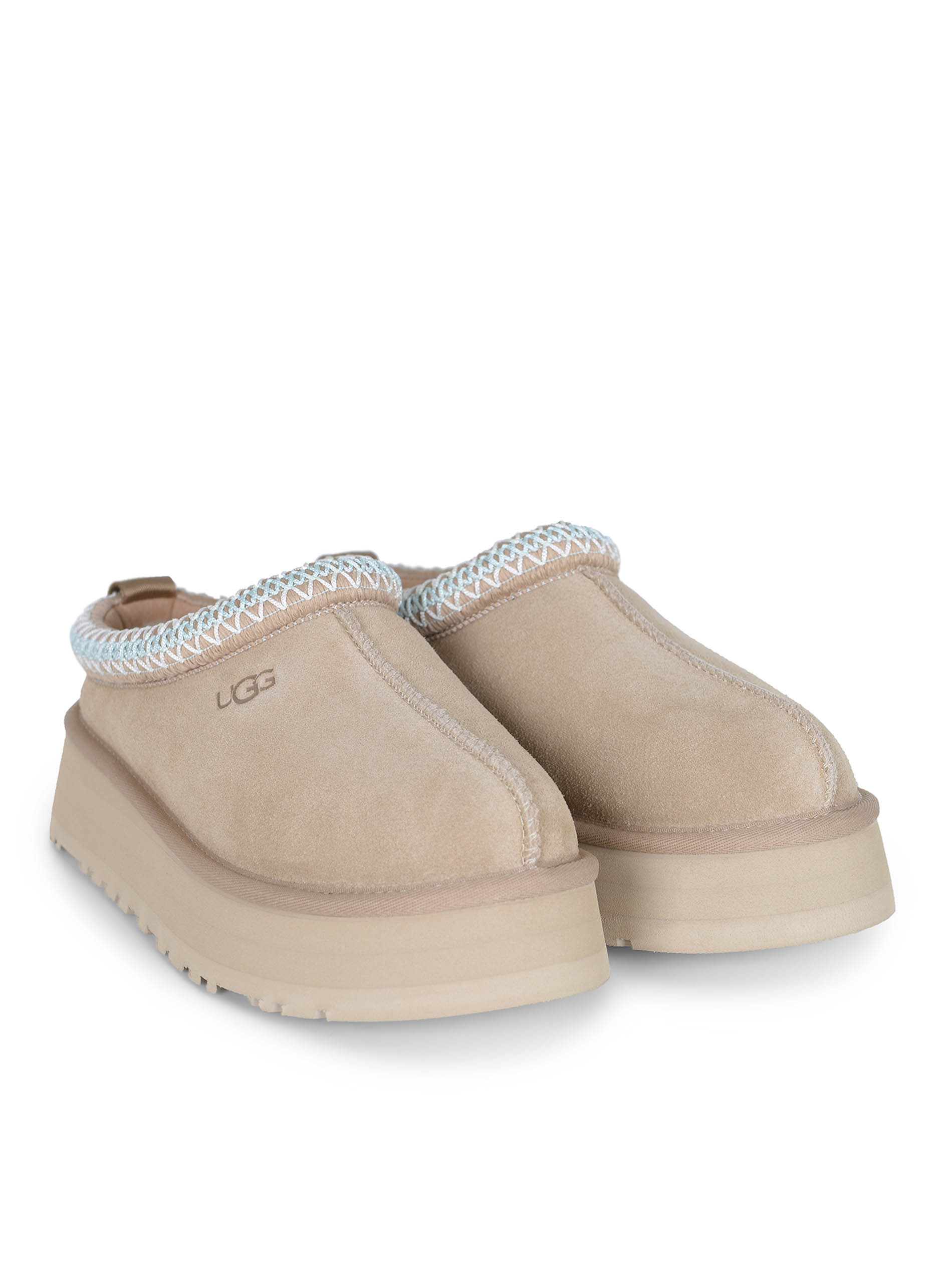Slippers UGG "Tazz" made of Sand suede leather. Contrasting profiles in Light Blue/White color.
