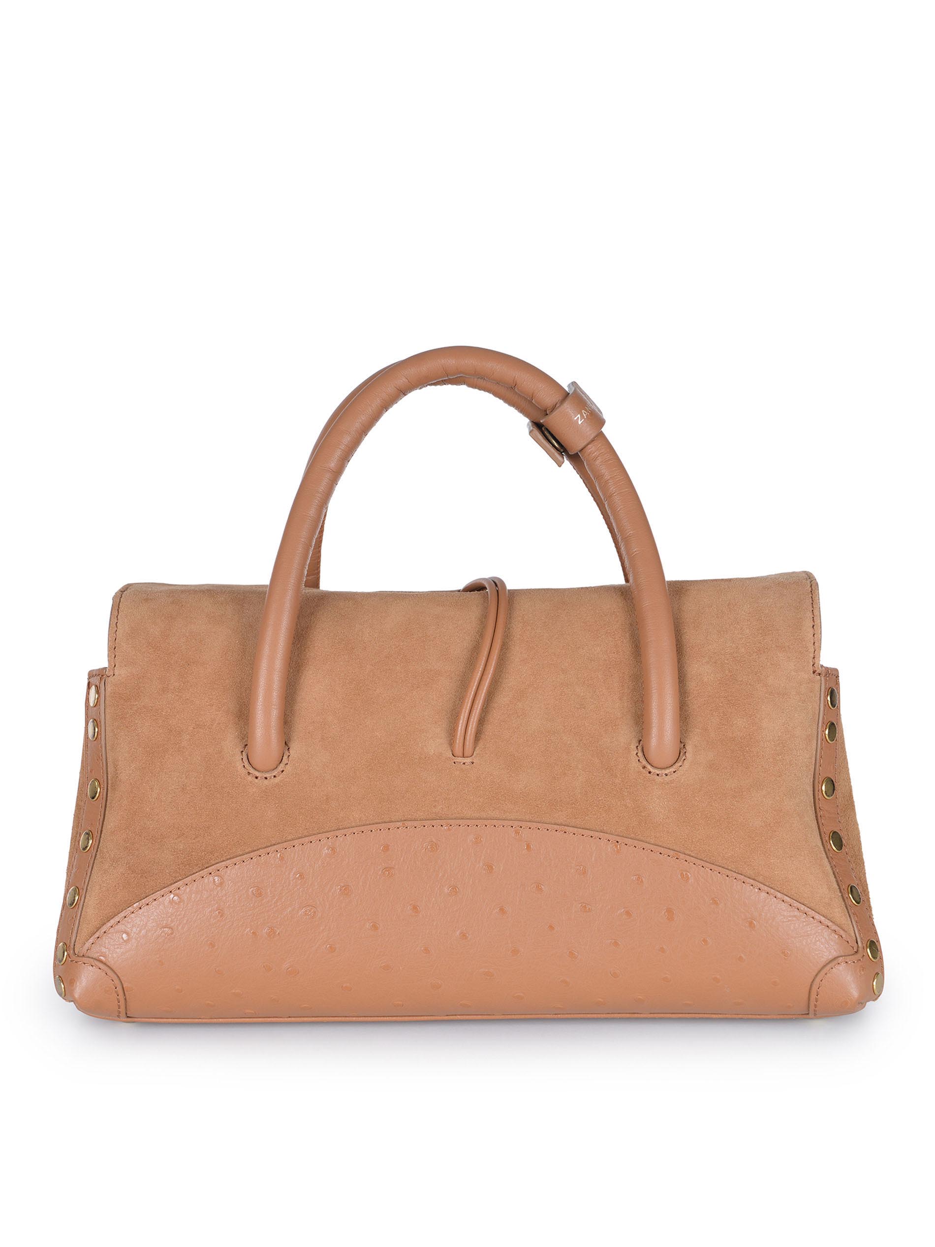 Zanellato "Dotta S" bag made of camel-colored suede leather. Gold metal inserts.