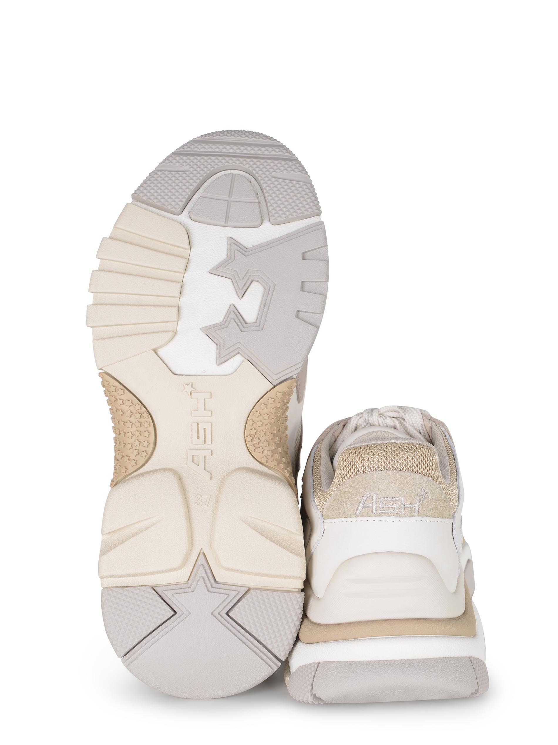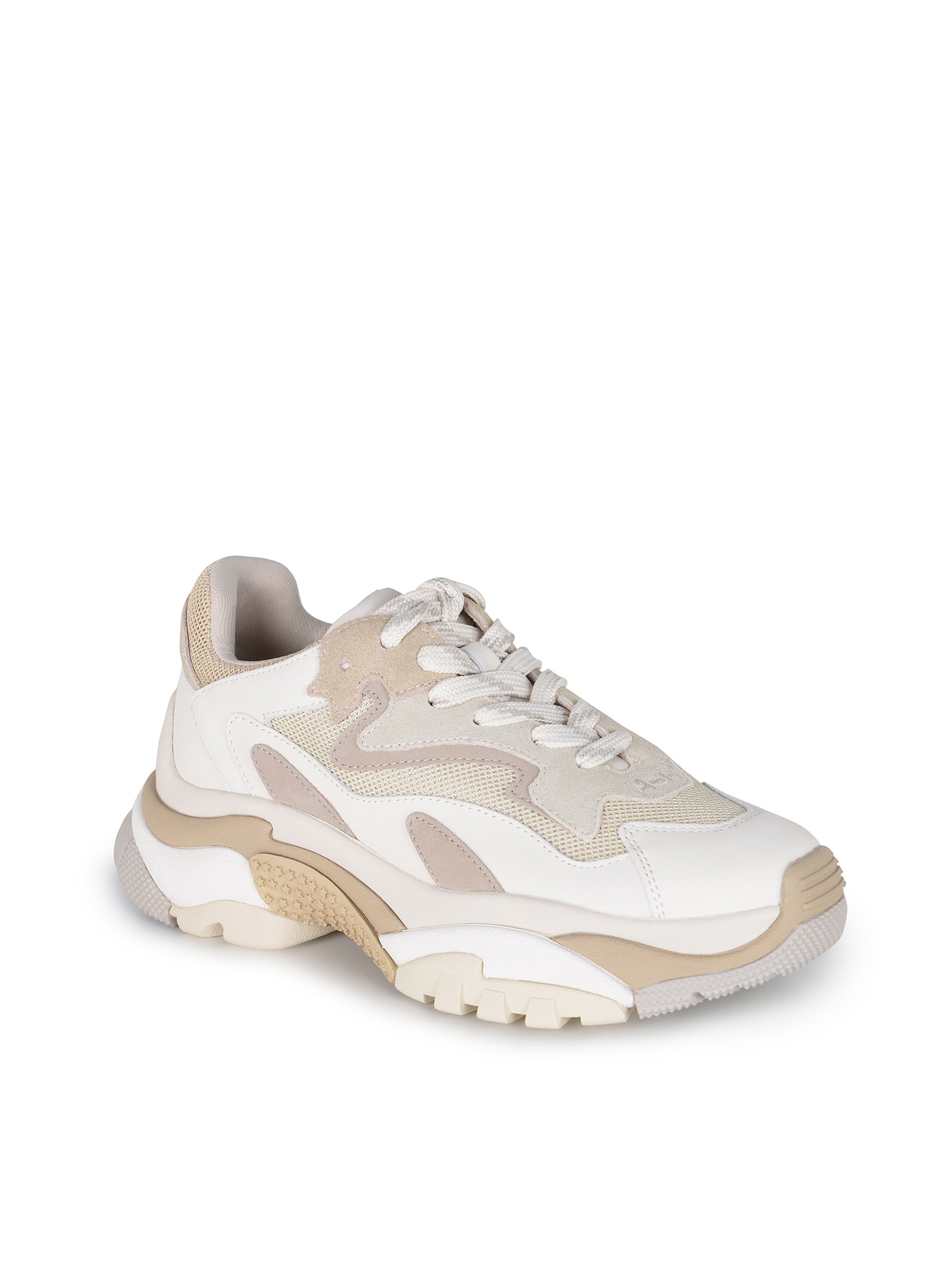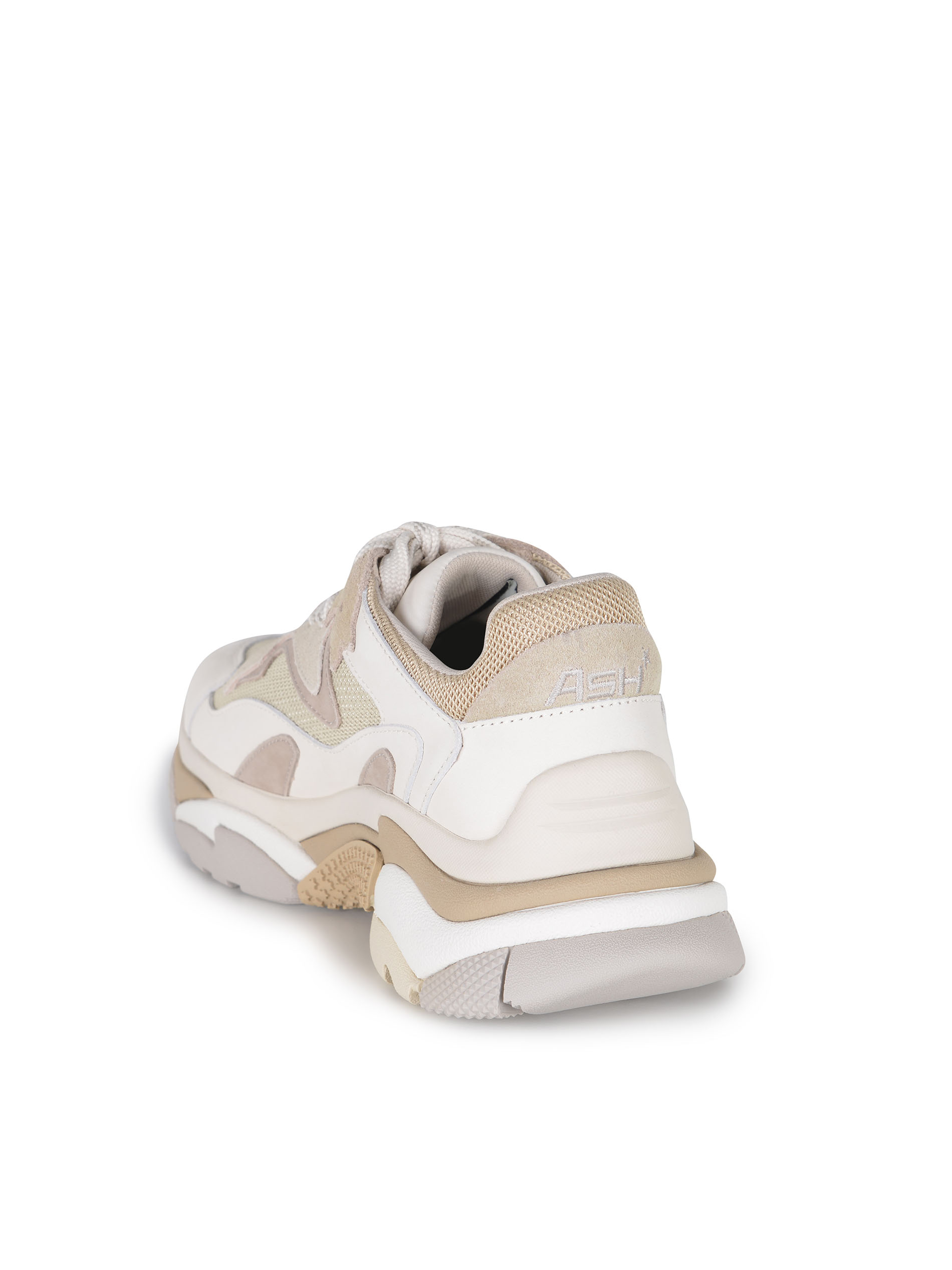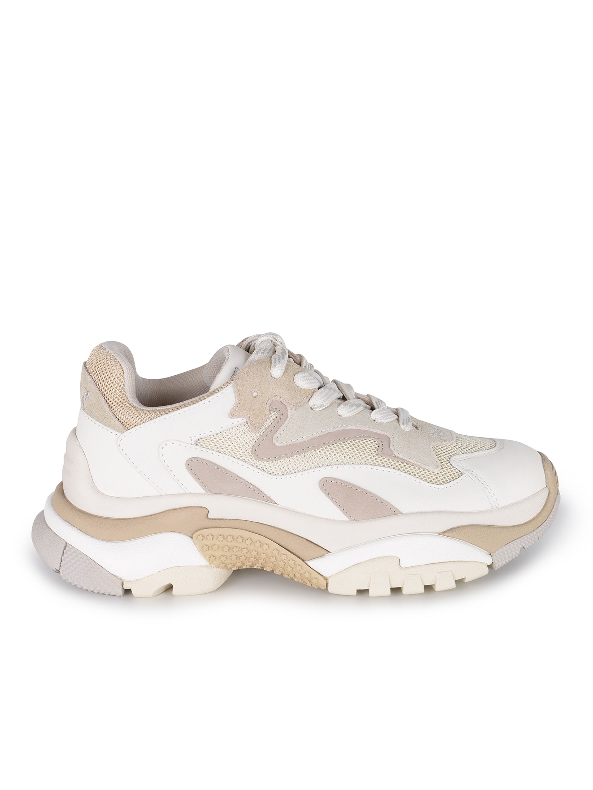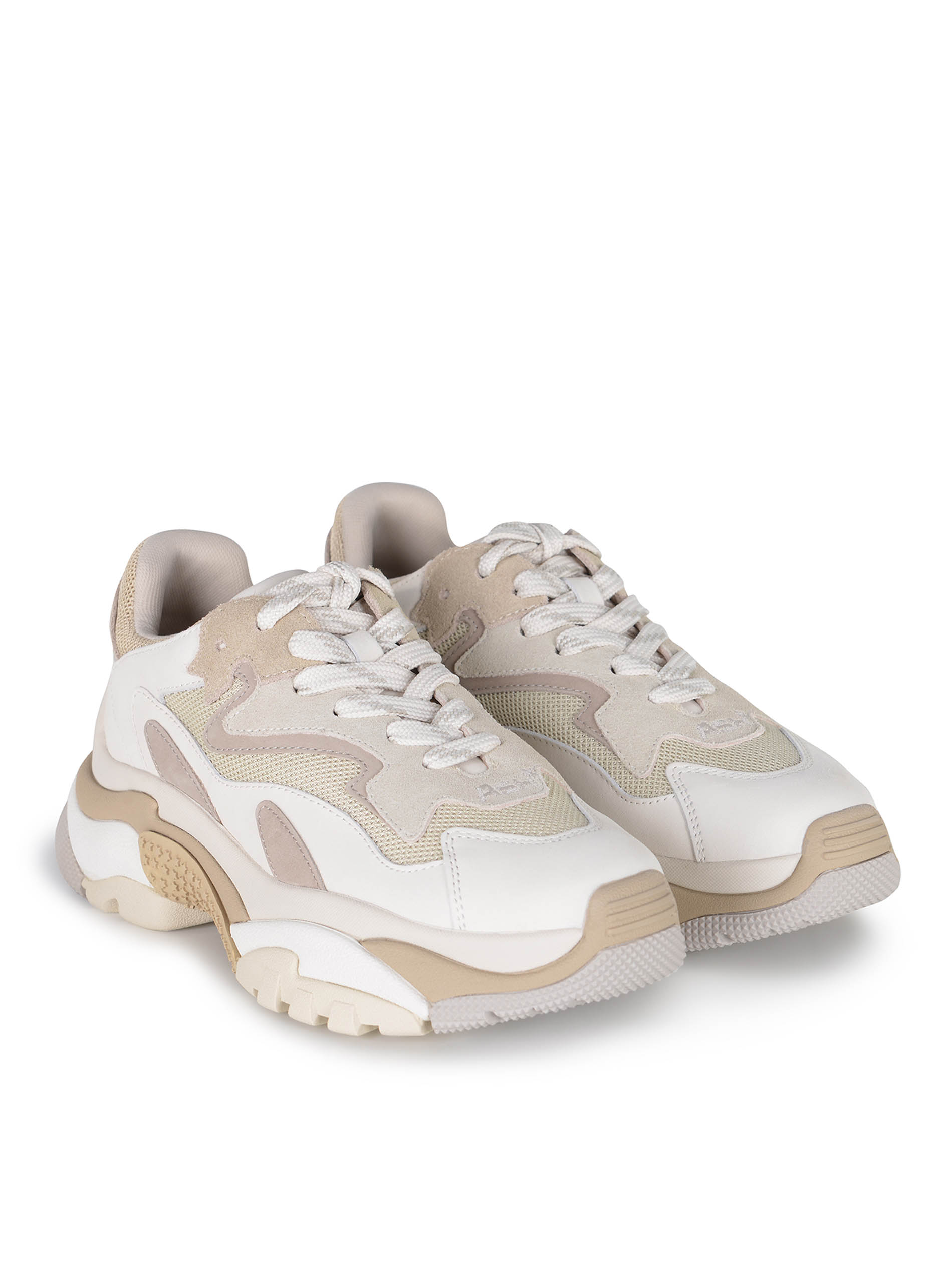 Sneakers Ash "Addict" realizzata in pelle di colore Avorio. Inserti in pelle scamosciata di colore Beige e Sabbia.