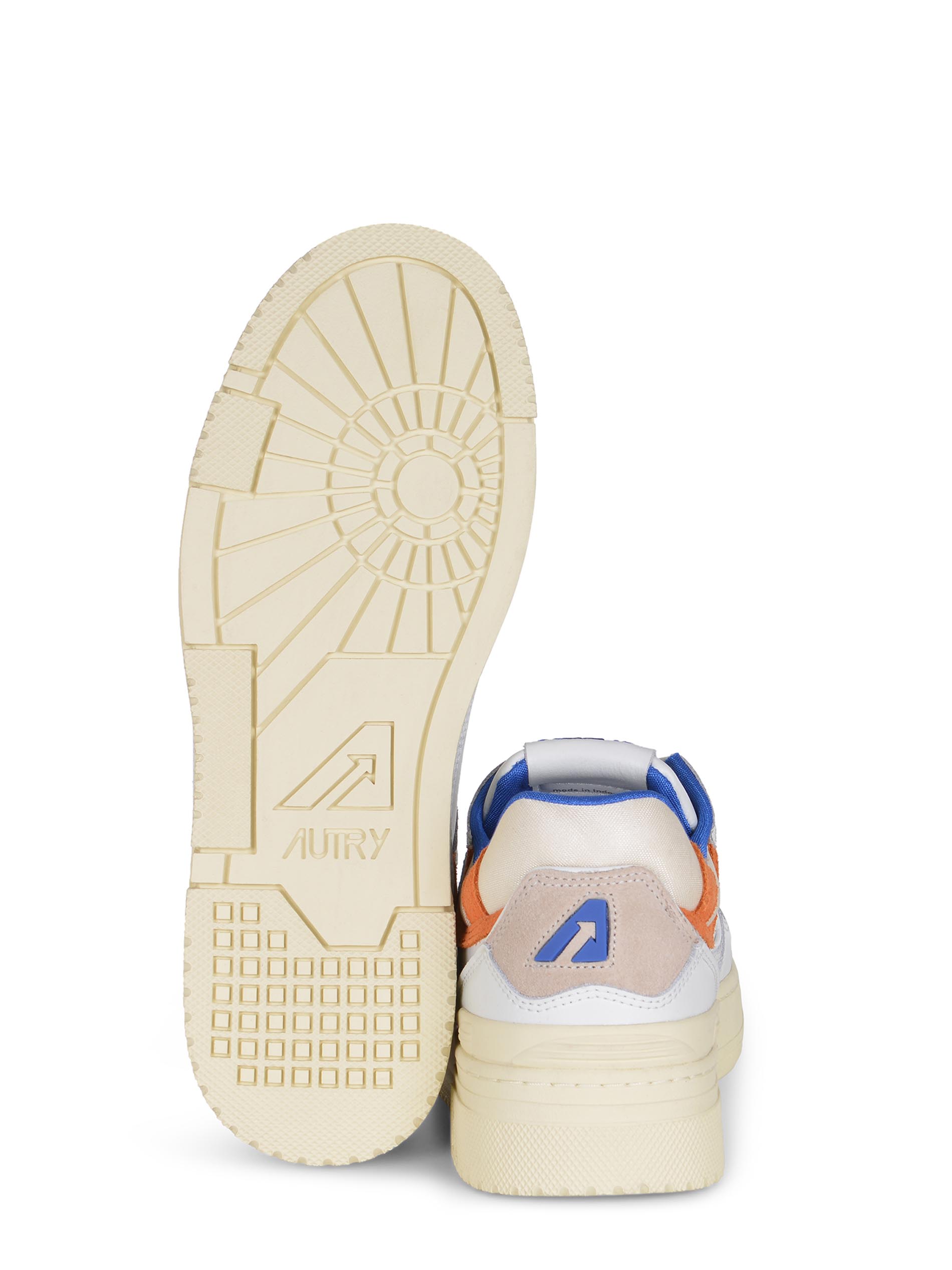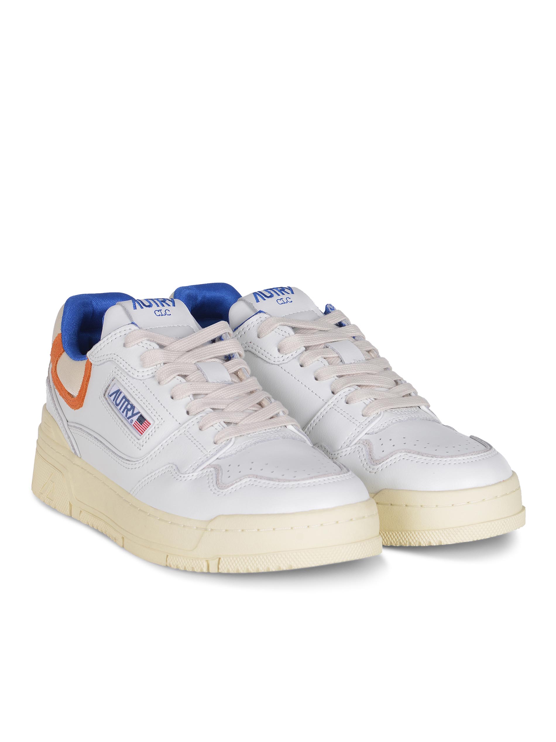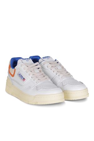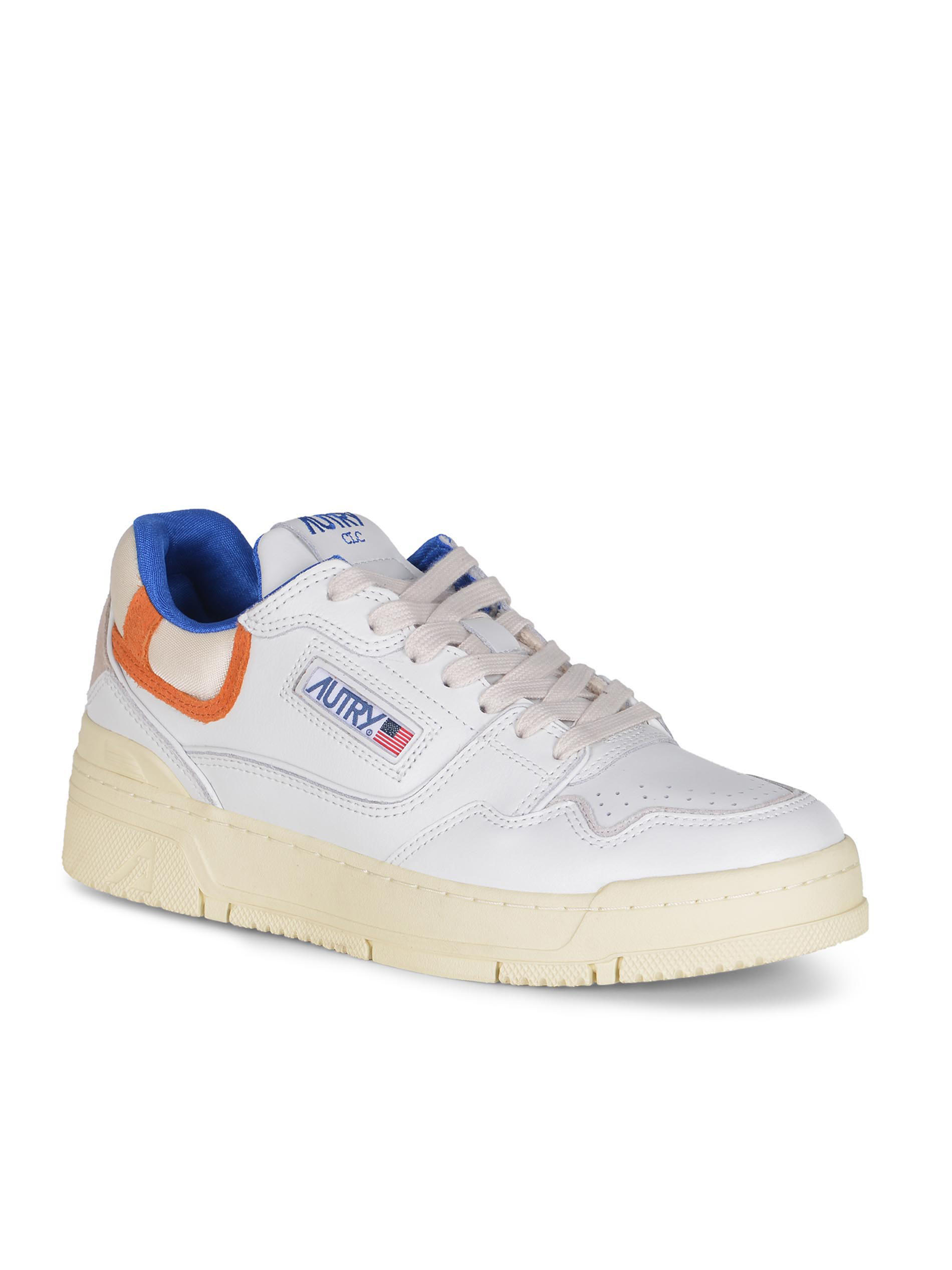 Sneakers Autry "CLC Low" realizzata in pelle di colore Bianco. Inserti a contrasto di pelle scamosciata. Dettagli a contrasto Blu e Arancione.
