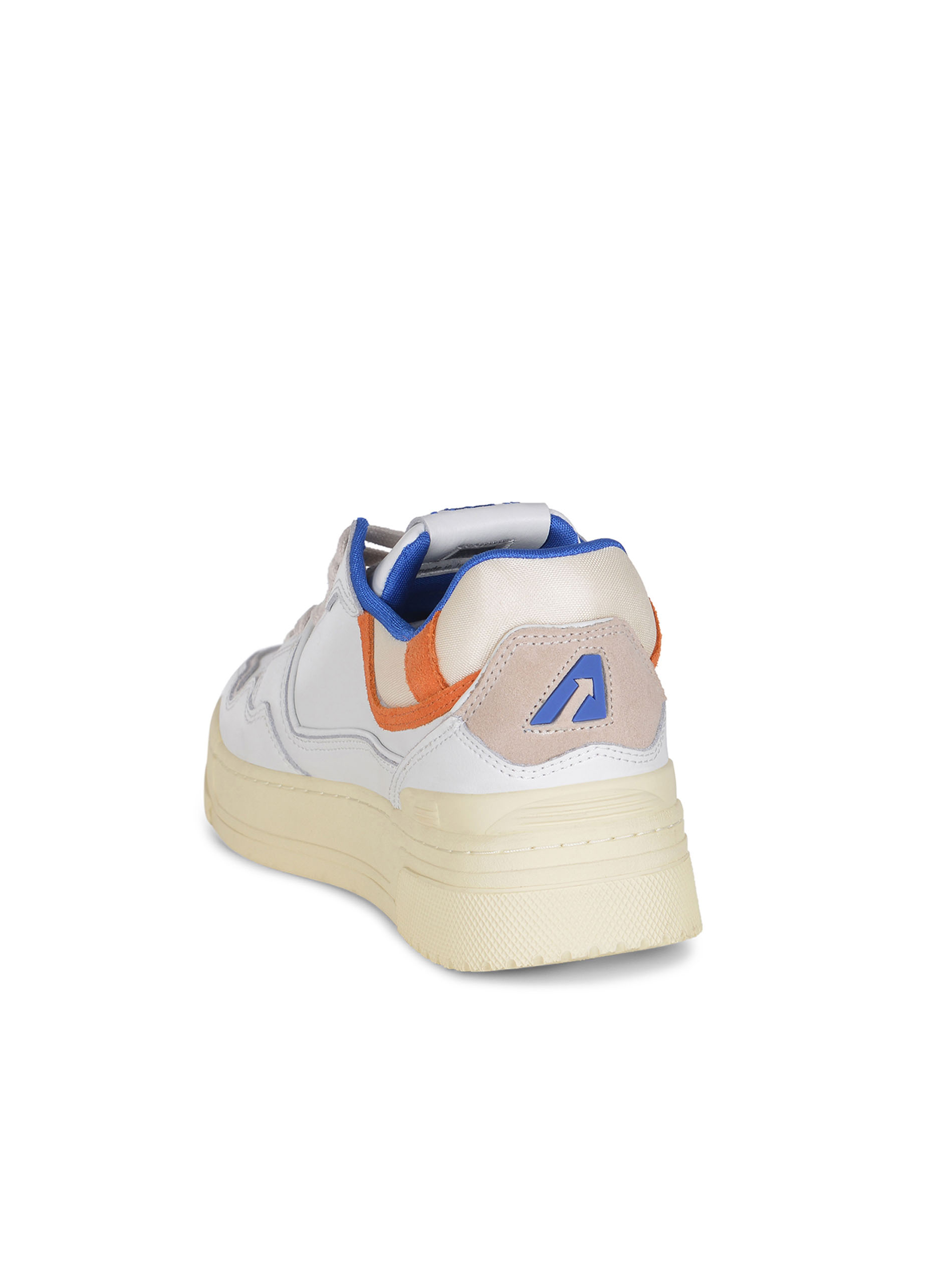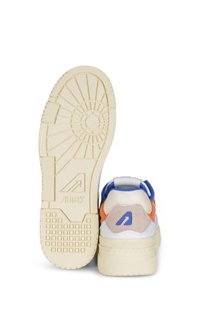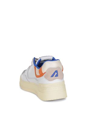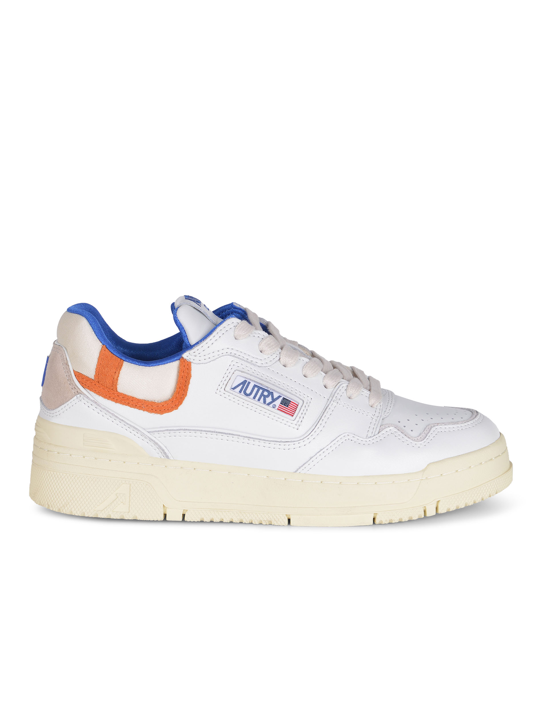 Sneakers Autry "CLC Low" realizzata in pelle di colore Bianco. Inserti a contrasto di pelle scamosciata. Dettagli a contrasto Blu e Arancione.