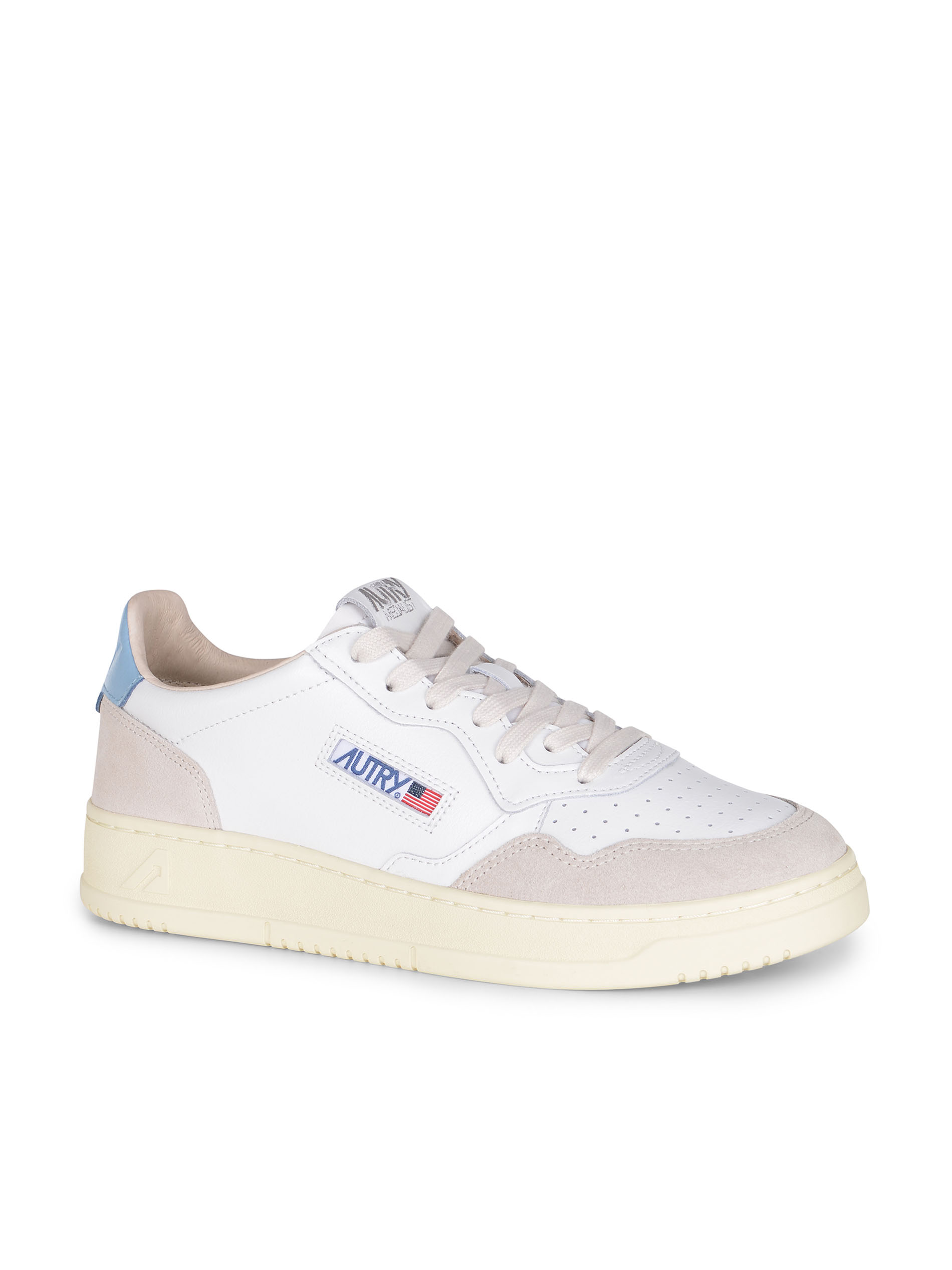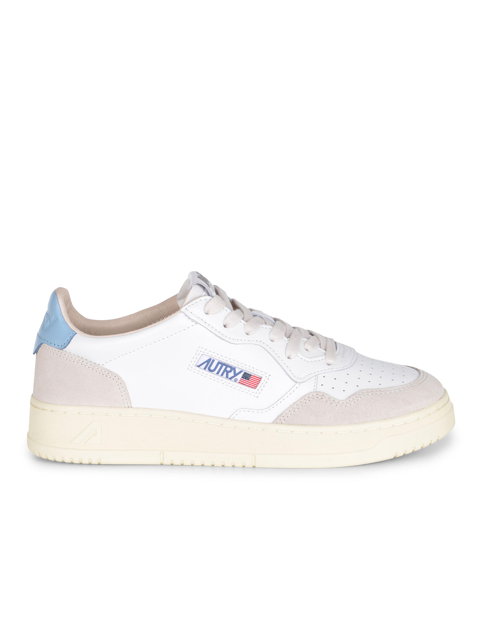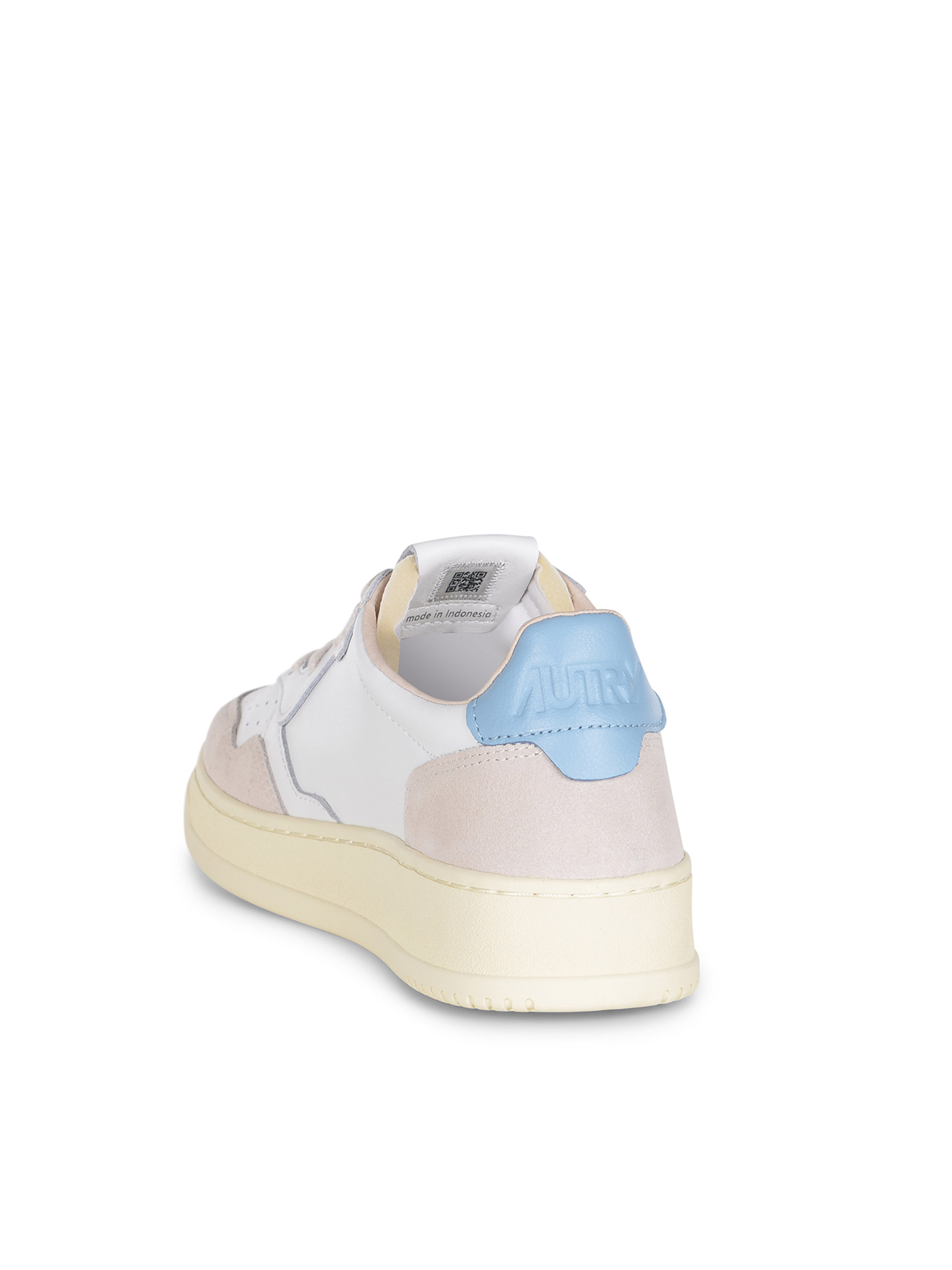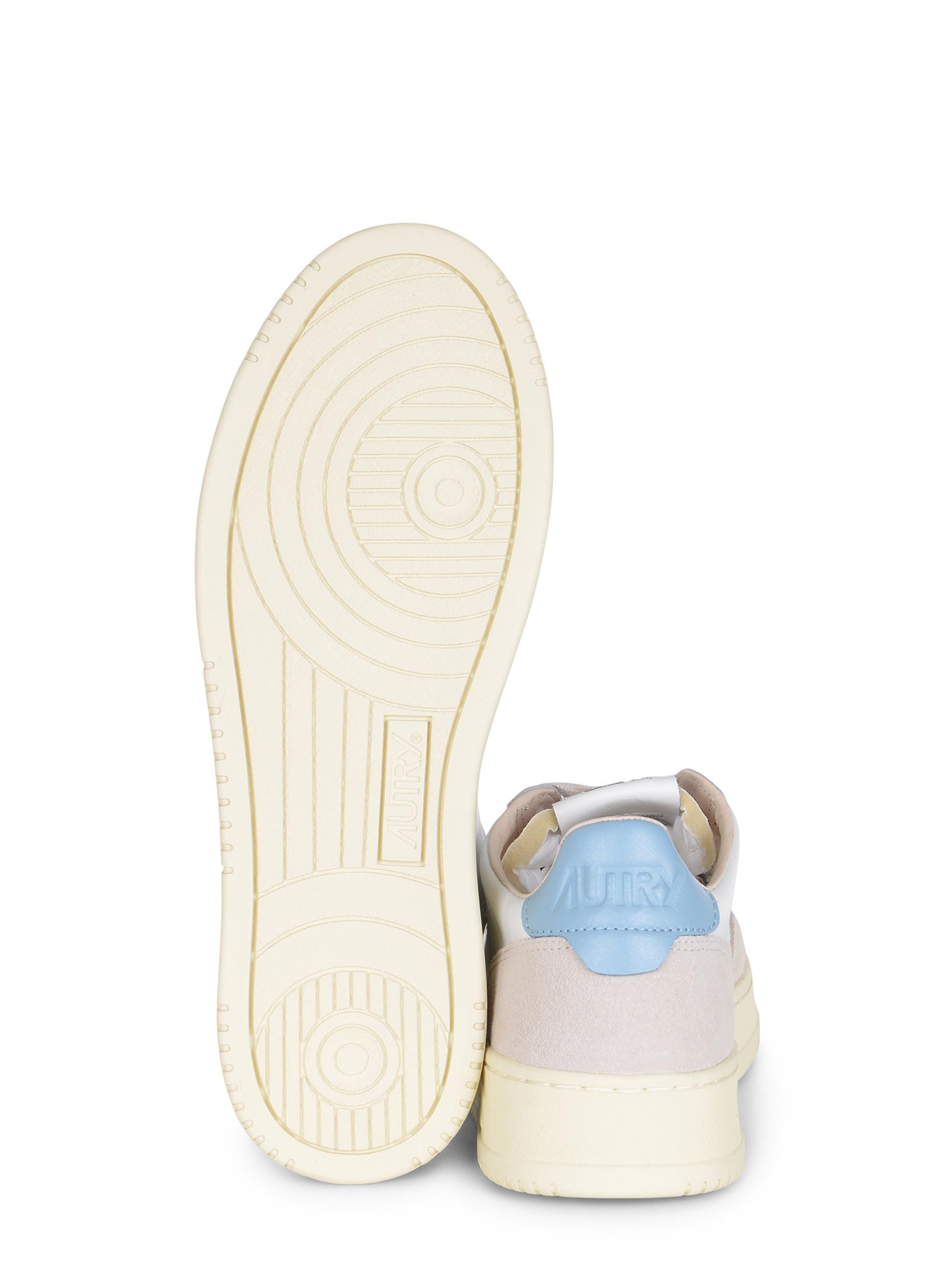 Logo "Autry" applicato di lato. Tallone di colore Celeste. Logo inciso tono su tono sul retro. Soletta interna logata. Fodera in pelle e spugna di cotone. Suola in gomma di colore Crema.