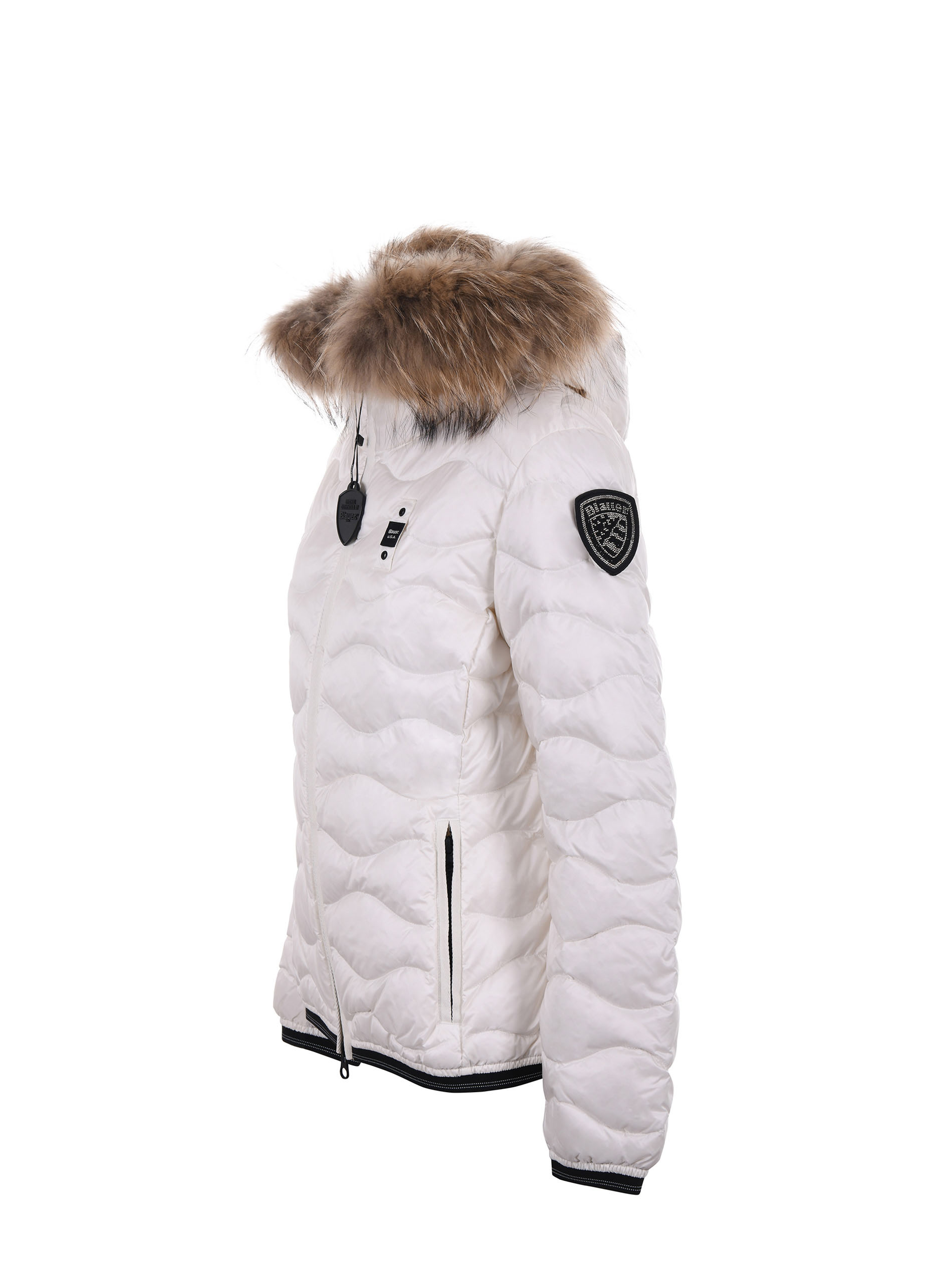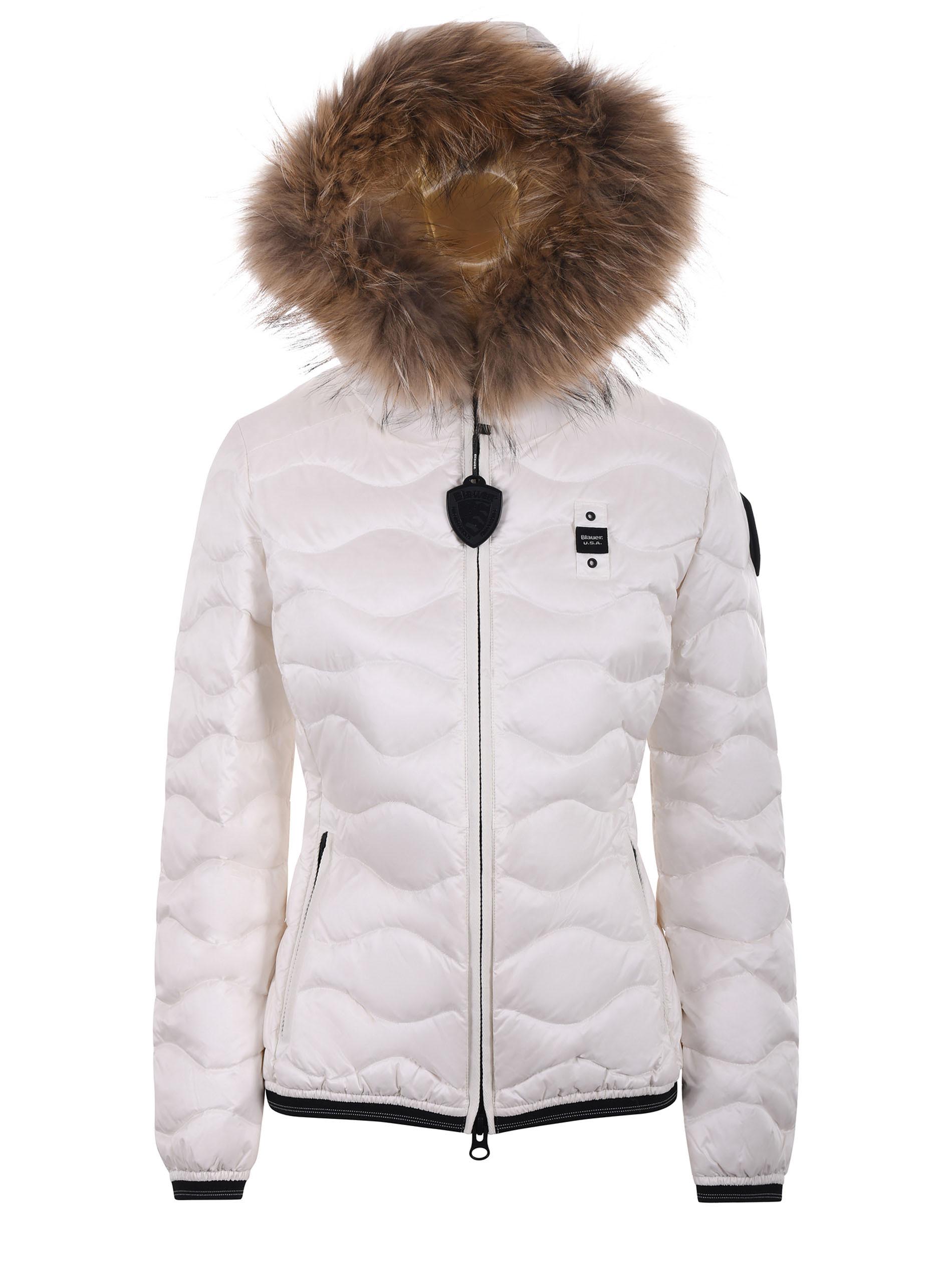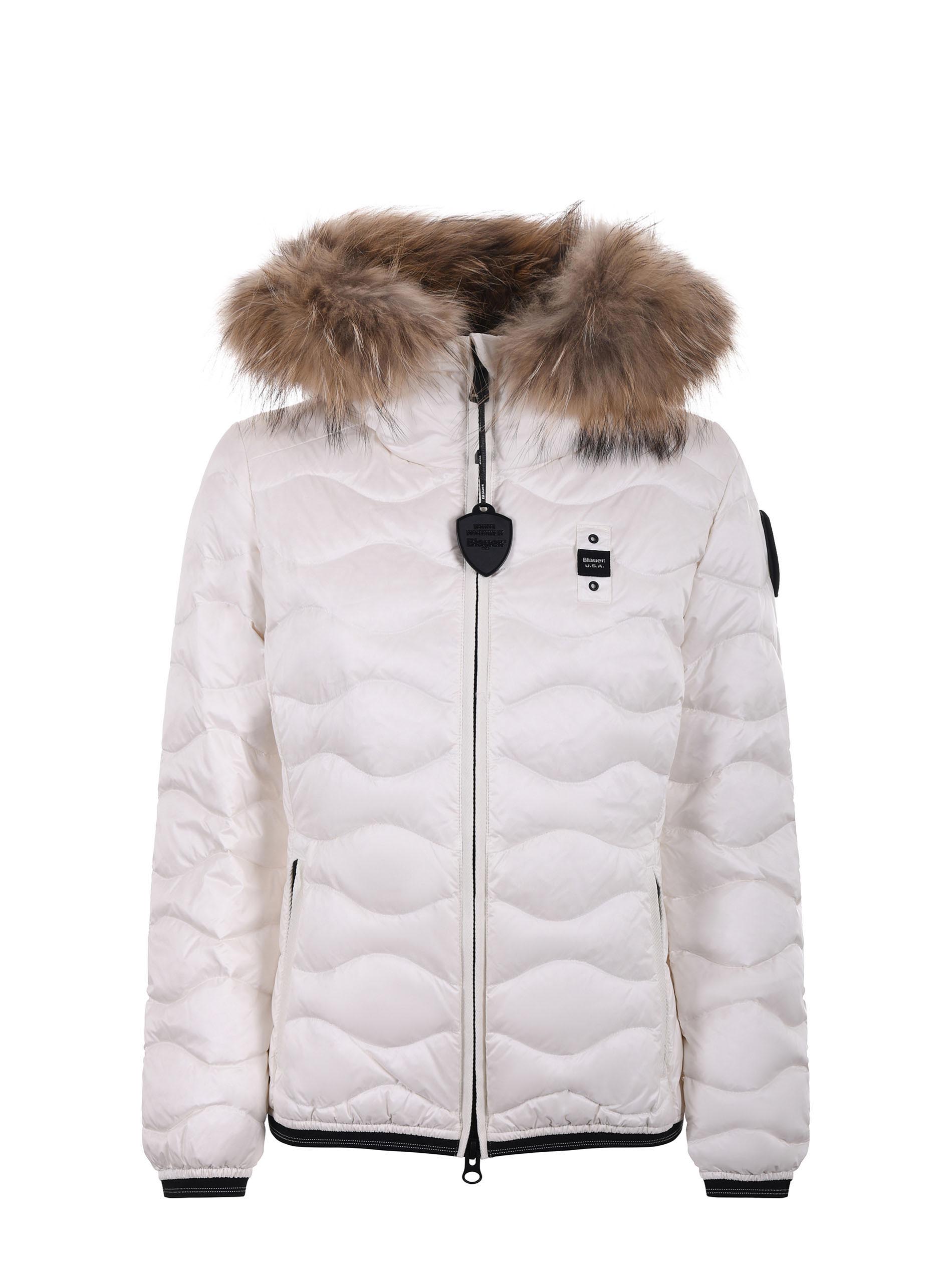 Piumino Blauer in nylon satinato Bianco. Trapuntato ad onde. Imbottito con piume 165 gr. Cappuccio con bordo in pelliccia removibile. Tasche con zip. Tasca interna. Polsi e fondo elasticizzati. Chiusura con zip doppio cursore. Patch logo staccabile in strass sulla manica sinistra. Slim fit.