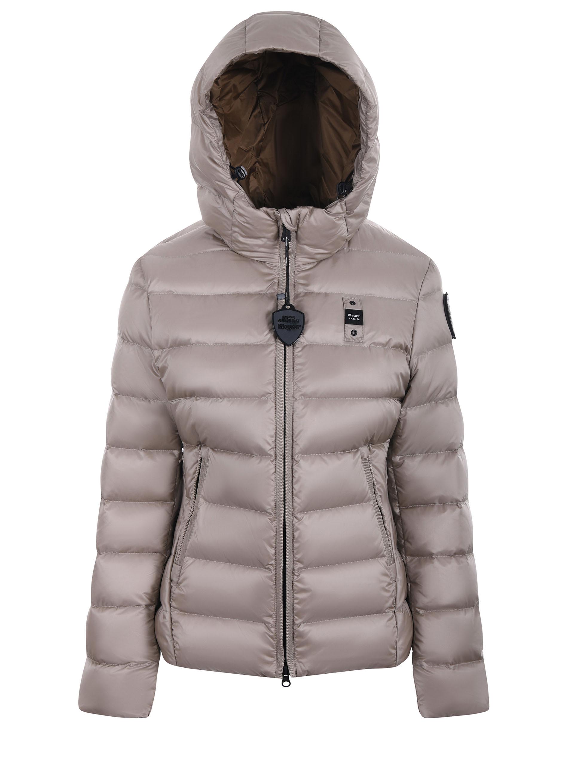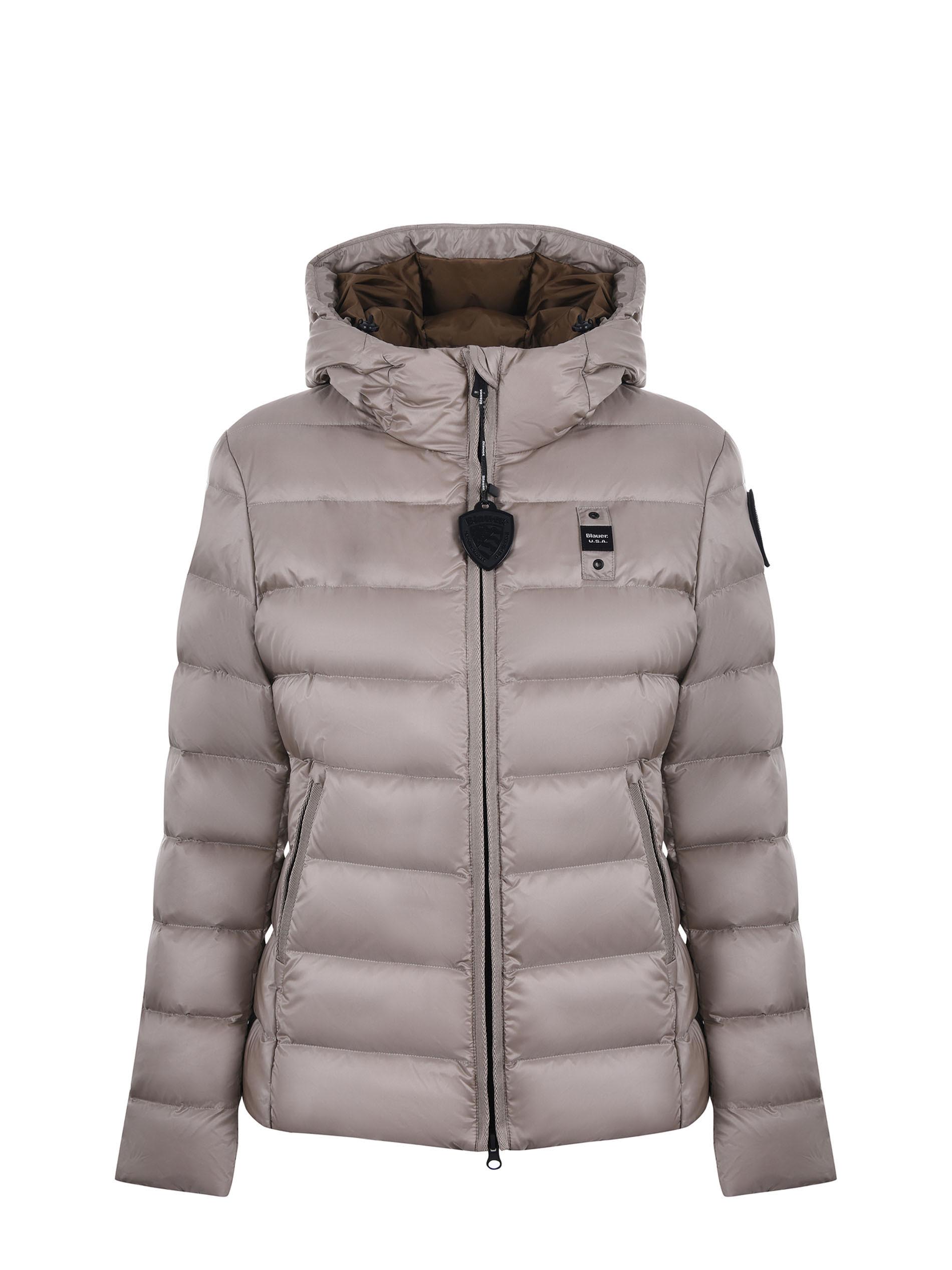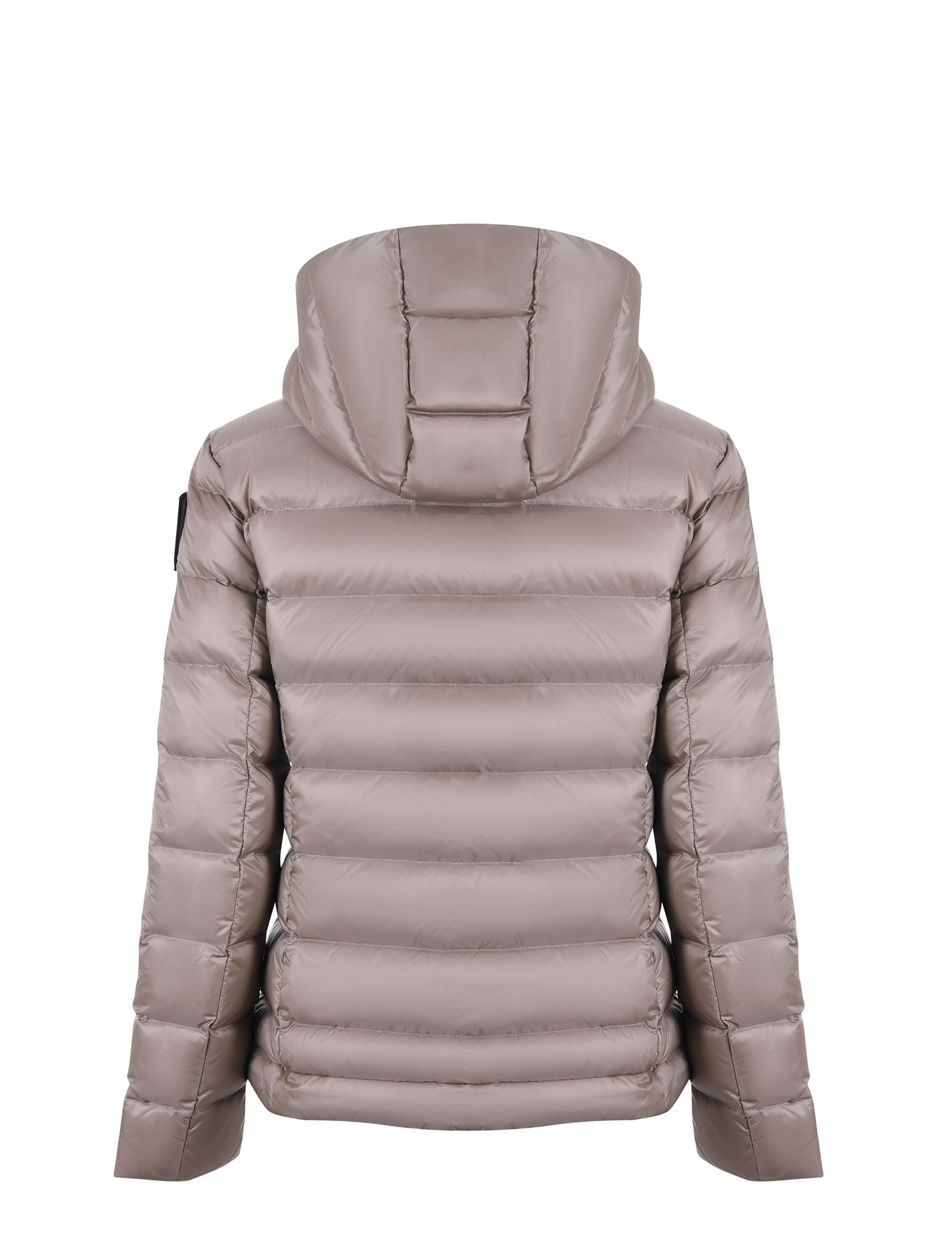 Piumino Blauer in nylon satin Tortora. Trapuntato. Imbottito in piume d'oca. Cappuccio con coulisse. Tasche con zip. Tasca interna. Chiusura con zip doppio cursore. Fodera militare. Coulisse al fondo. Patch logo sulla manica sinistra.